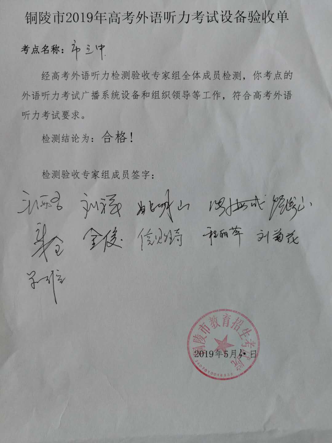 5月30日中午,市教体局招生考试院、教育信息技术中心和监察室等领导一行,对我校2019年普通高考外语听力考试广播设备进行检查验收。经验收领导小组全体成员检测,铜陵三中所设考场外语听力考试设备和组织领导工作符合文件要求,检测合格,通过验收。