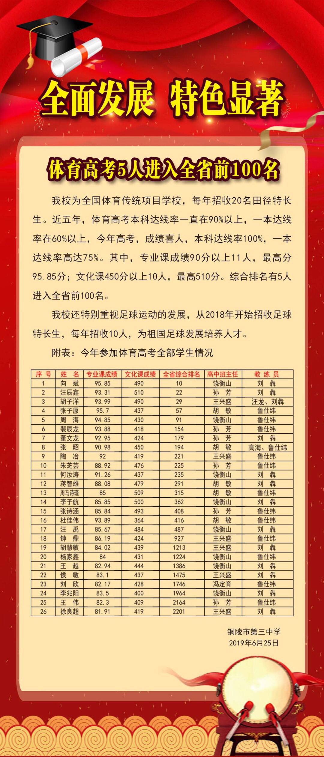 有了前期体育专业课老师鲁仕纬、刘犇的精心指导,再加上三中文化课老师们的渗透式付出,今年三中体育生成绩异常突出,有5人进入全省前100名,本科达线率100%。