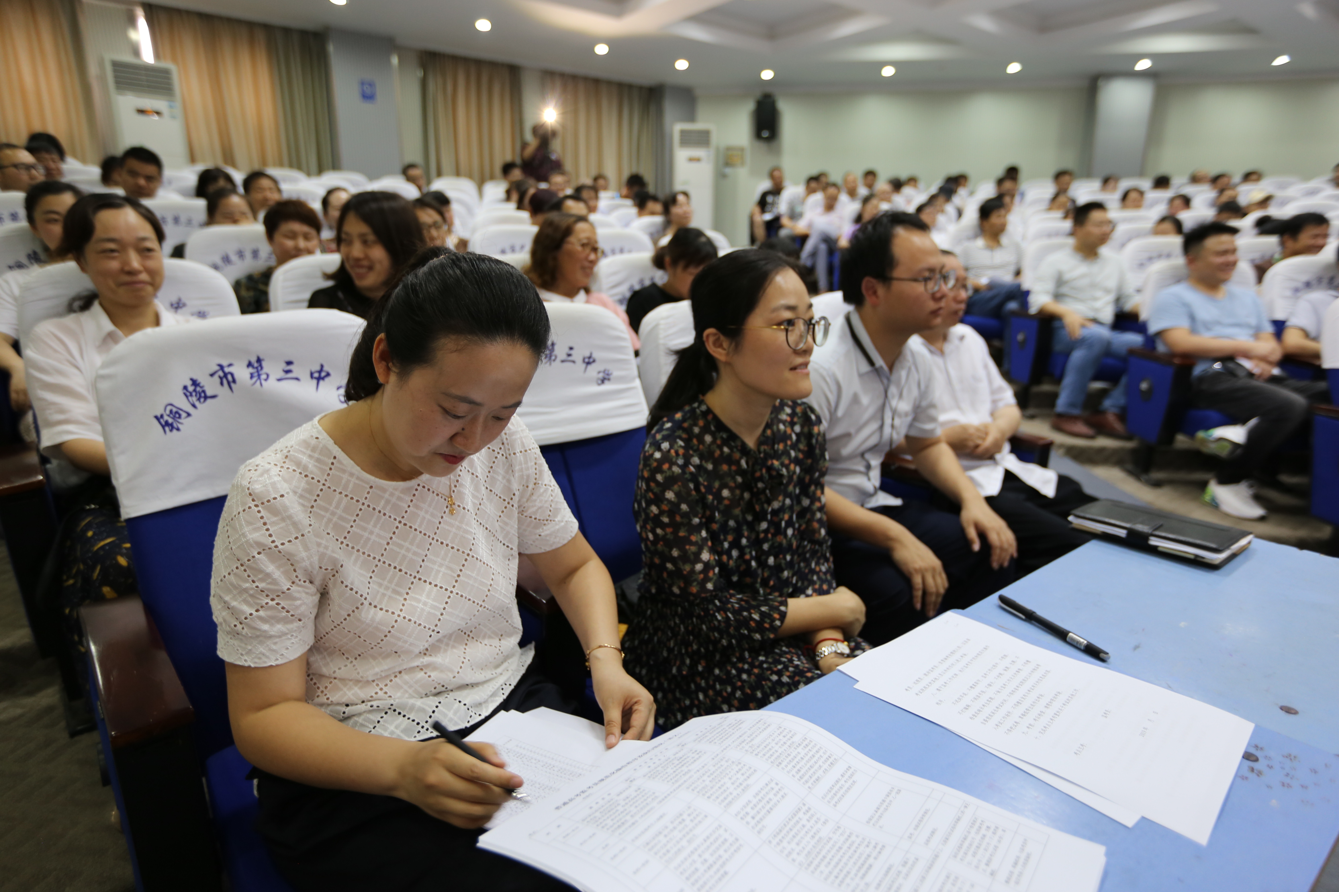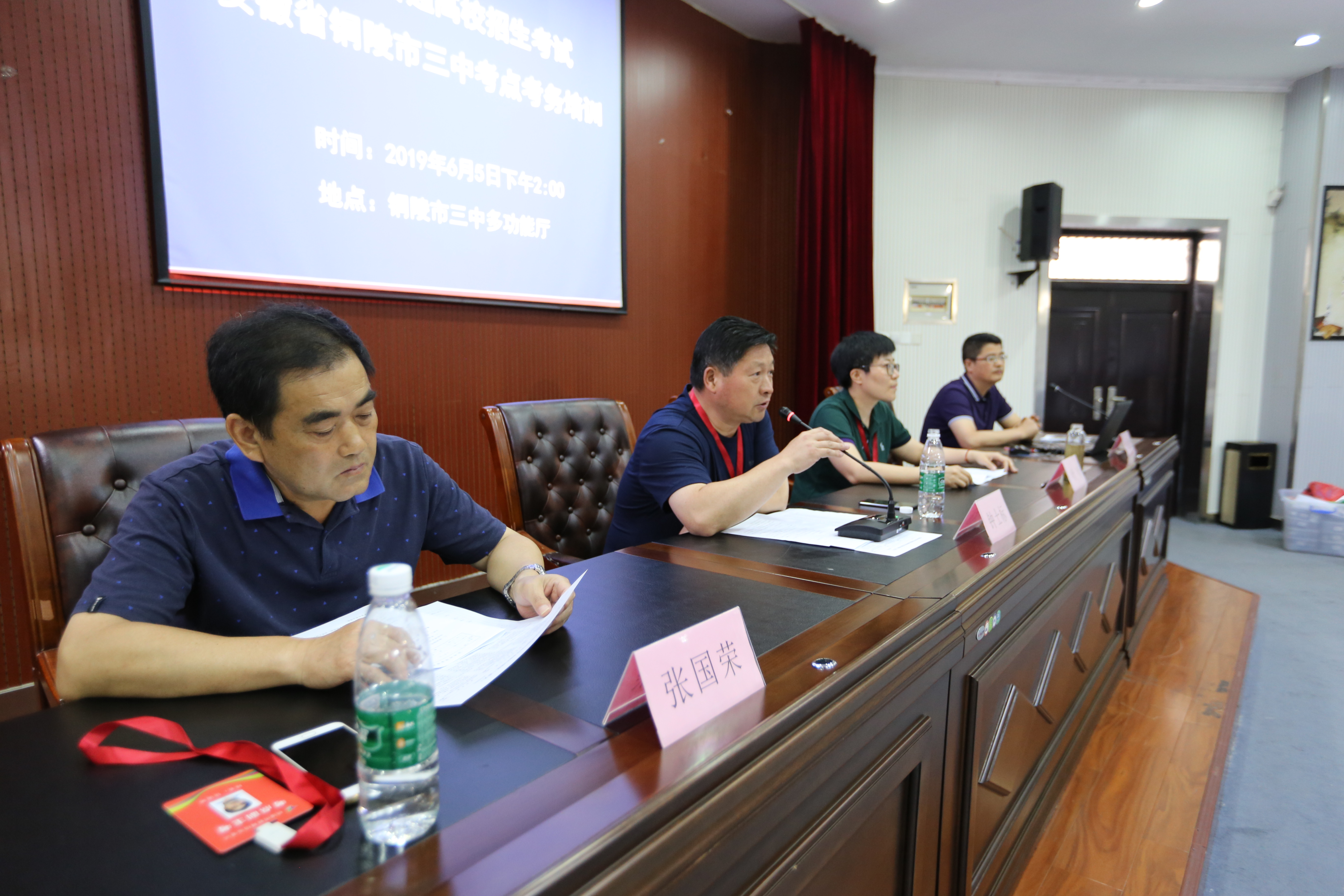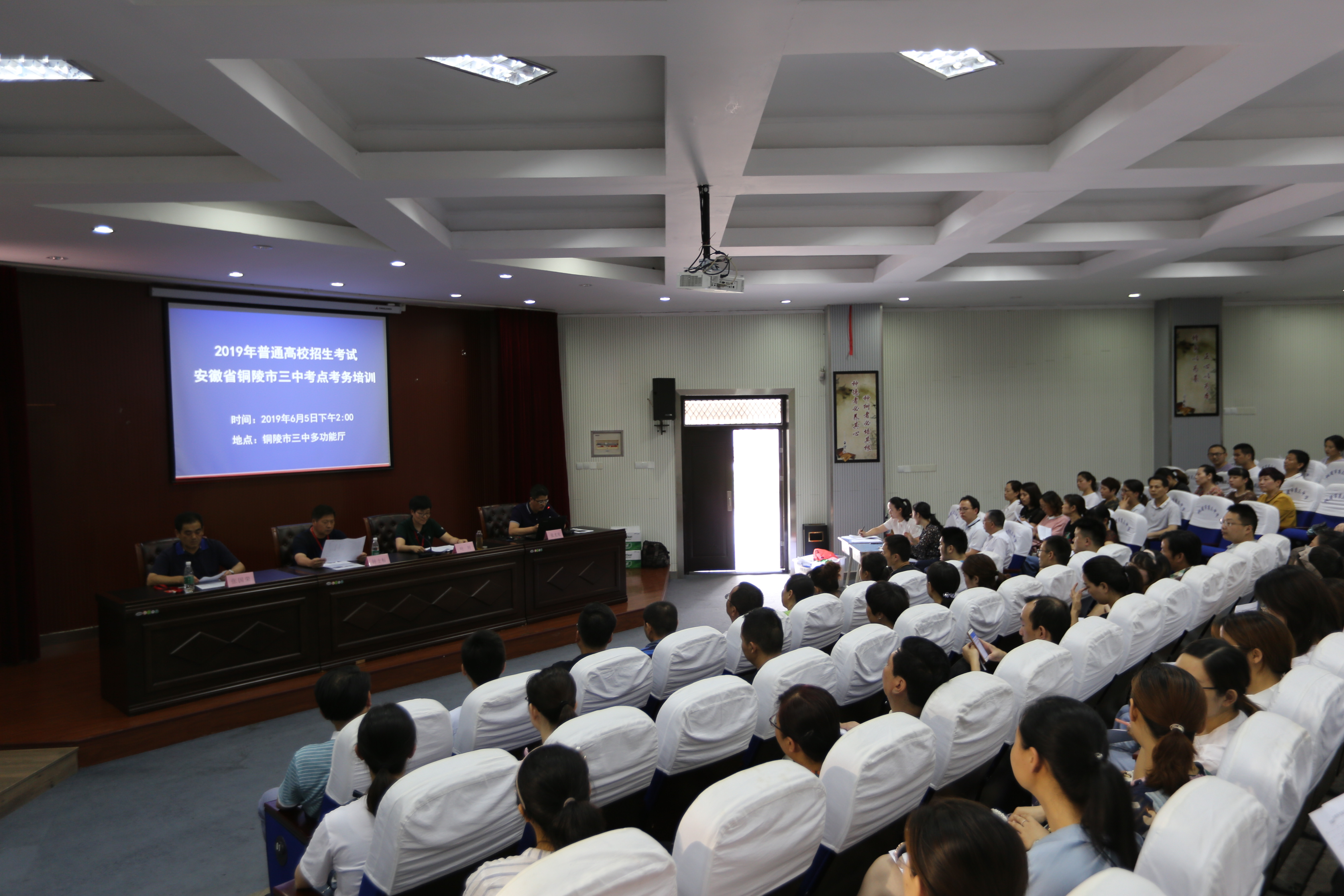 本校讯 6月5日下午2点,2019年全国普通高考铜陵三中考点考务培训会在校多功能厅召开,铜陵三中考点主任、校党委书记、校长钟士标,校党委副书记叶叶,副校长张国荣,副校长张尤俊出席会议,会议对今年三中考点高考考务工作进行安排部署。参加会议的还有各兄弟学校的考务人员。会议由校党委副书记叶叶主持。