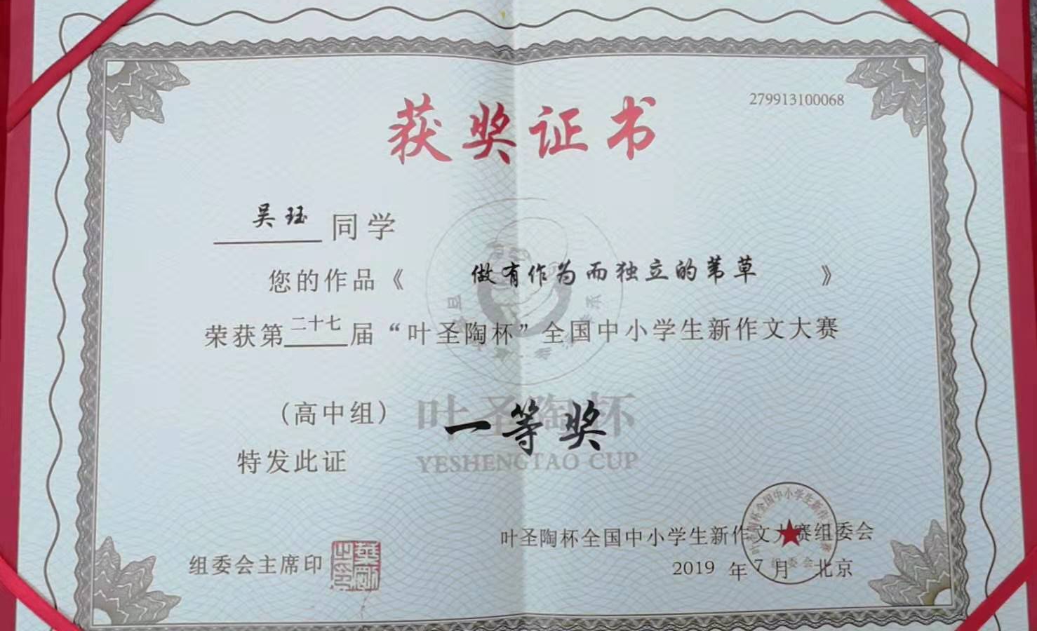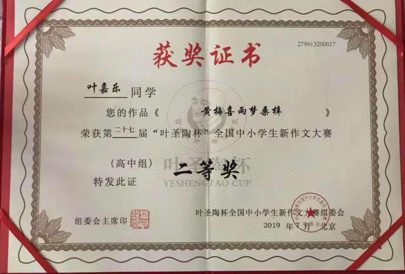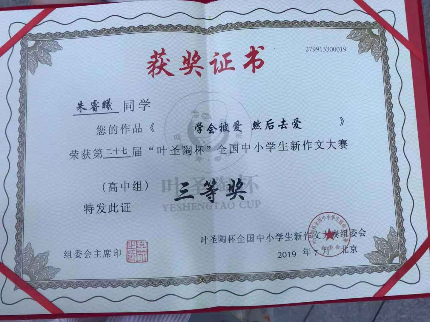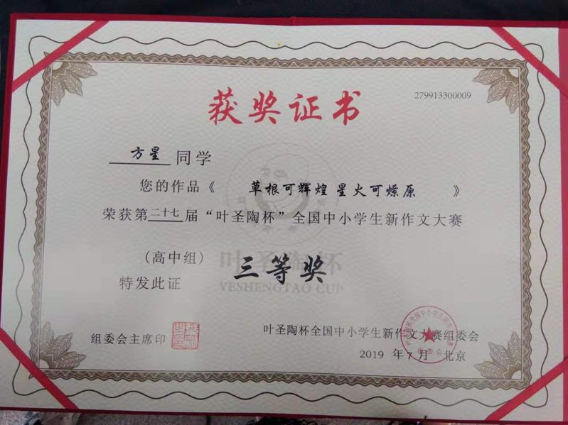 2019年7月20-23日,由中国少年儿童新闻出版总社和中国当代文学研究会主办,中国当代文学研究会校园文学委员会、《中学生》杂志承办的第27届“叶圣陶杯”全国中小学生新作文大赛在中国人民大学隆重举行。