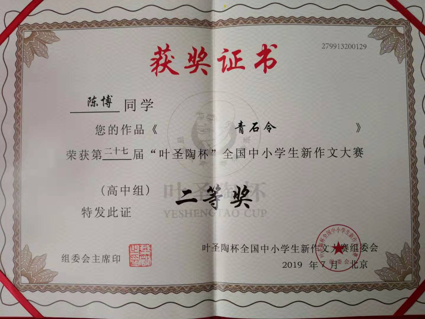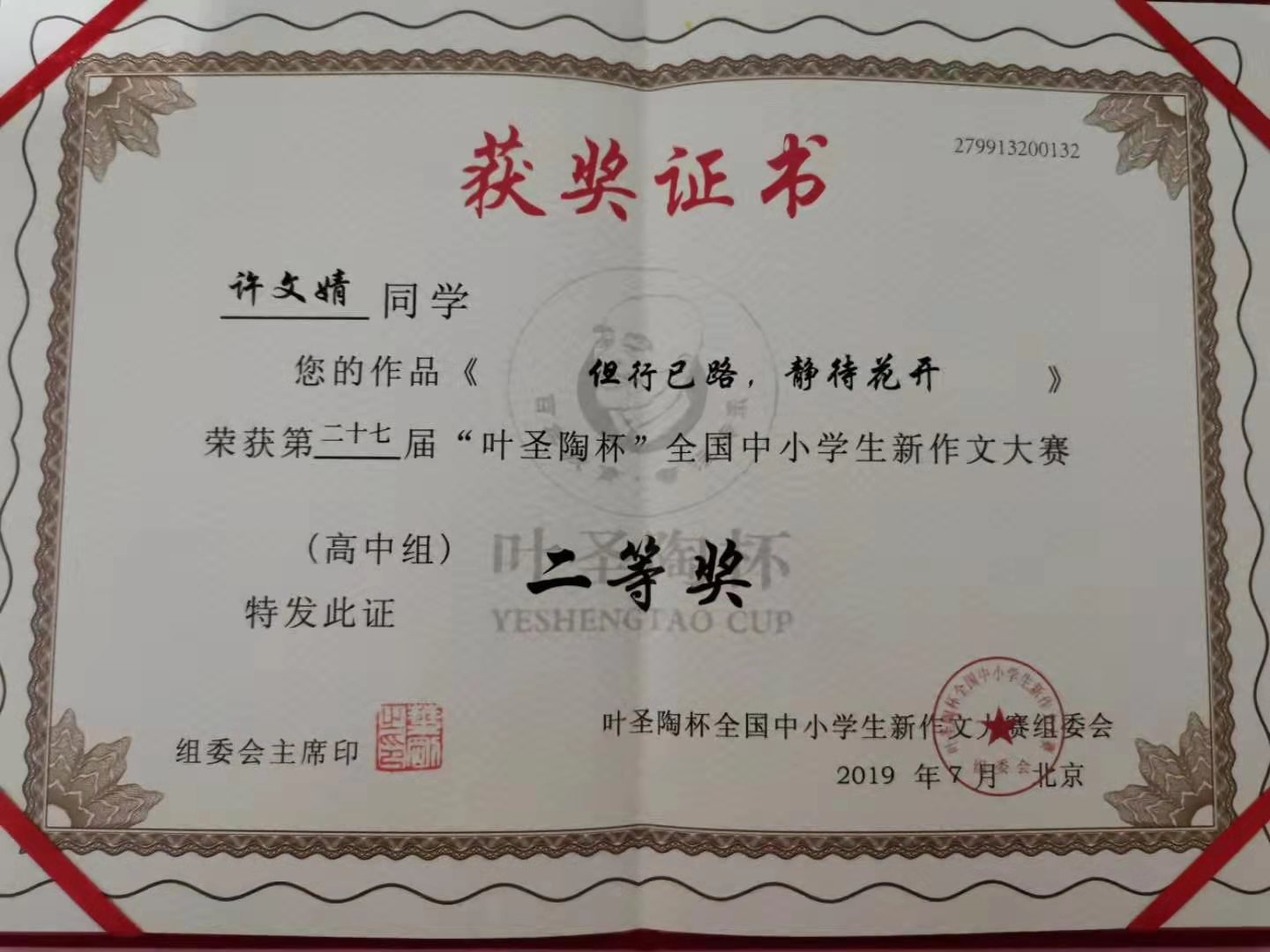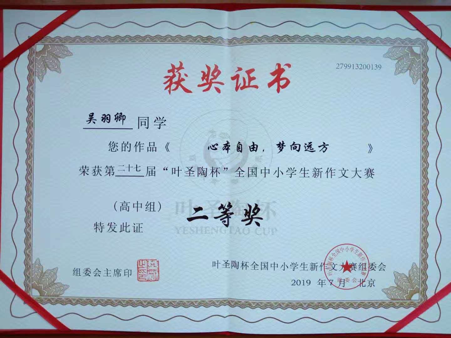 2019年7月20-23日,由中国少年儿童新闻出版总社和中国当代文学研究会主办,中国当代文学研究会校园文学委员会、《中学生》杂志承办的第27届“叶圣陶杯”全国中小学生新作文大赛在中国人民大学隆重举行。