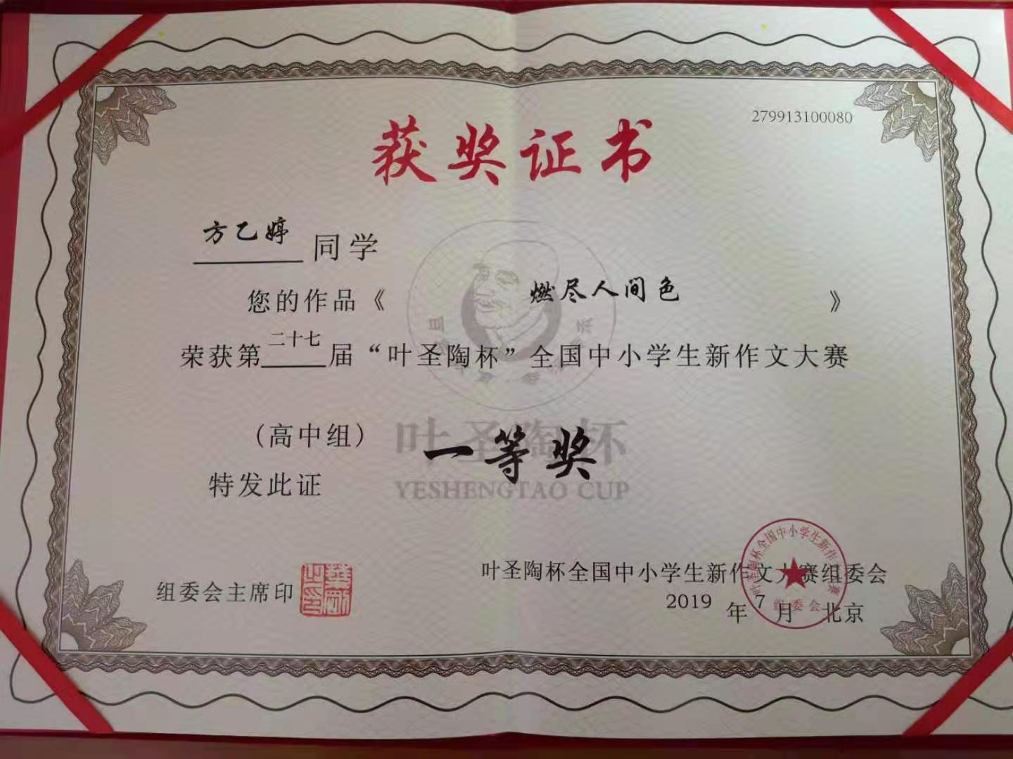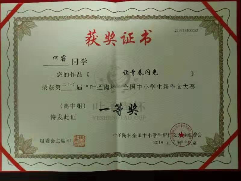 我校学生在全国作文赛事中获得优异成绩,体现了我校学生过人的心理素质、优秀的写作水平、广阔的社会视野、积极向上的思想态度,贯彻了我校“身体健康,心理阳光,学业进步”的办学理念。