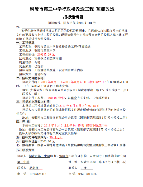 铜陵市第三中学行政楼改造工程-顶棚改造招标邀请函