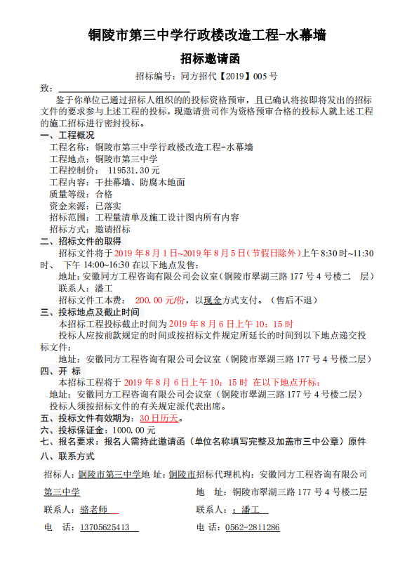 铜陵市第三中学行政楼改造工程-水幕墙招标邀请函
