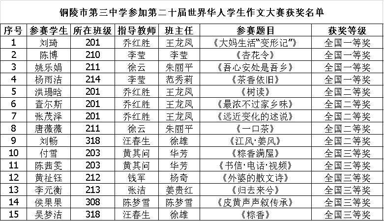 近日,从铜陵市教体局获悉,我校学生在第20届世界华人学生大赛中获得佳绩,共有15名学生获奖,其中获全国一等奖4人,全国二等奖5人,全国三等奖6人。