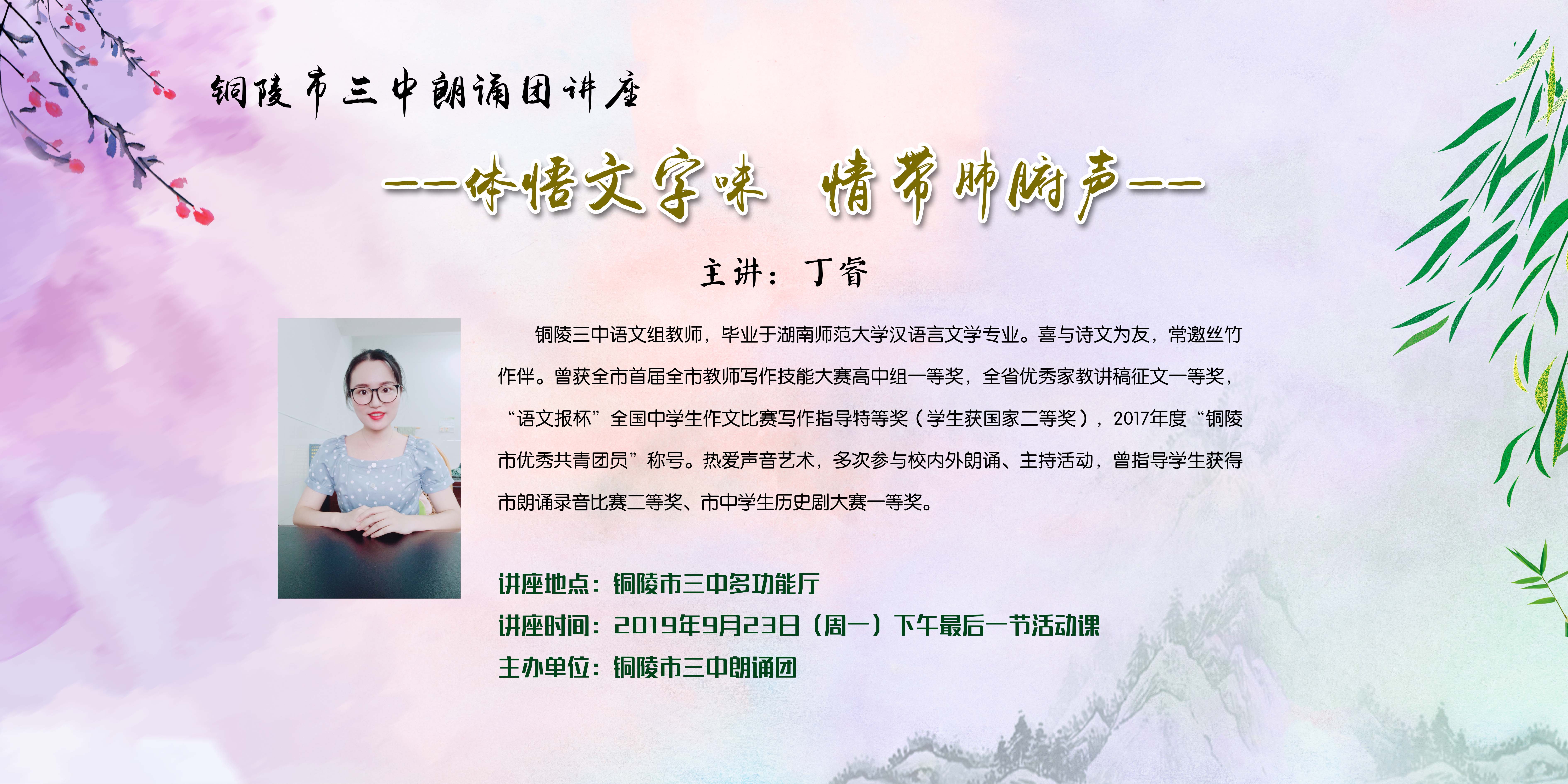 9月23日下午最后一节活动课,我校朗诵团新学期第一次社团活动在校多功能厅开展,由社团辅导教师之一的语文组丁睿老师带来名为“体悟文字味,情带肺腑声”的朗诵专题讲座。朗诵团的社员以及社外爱好朗诵的同学共同参与了本次活动。