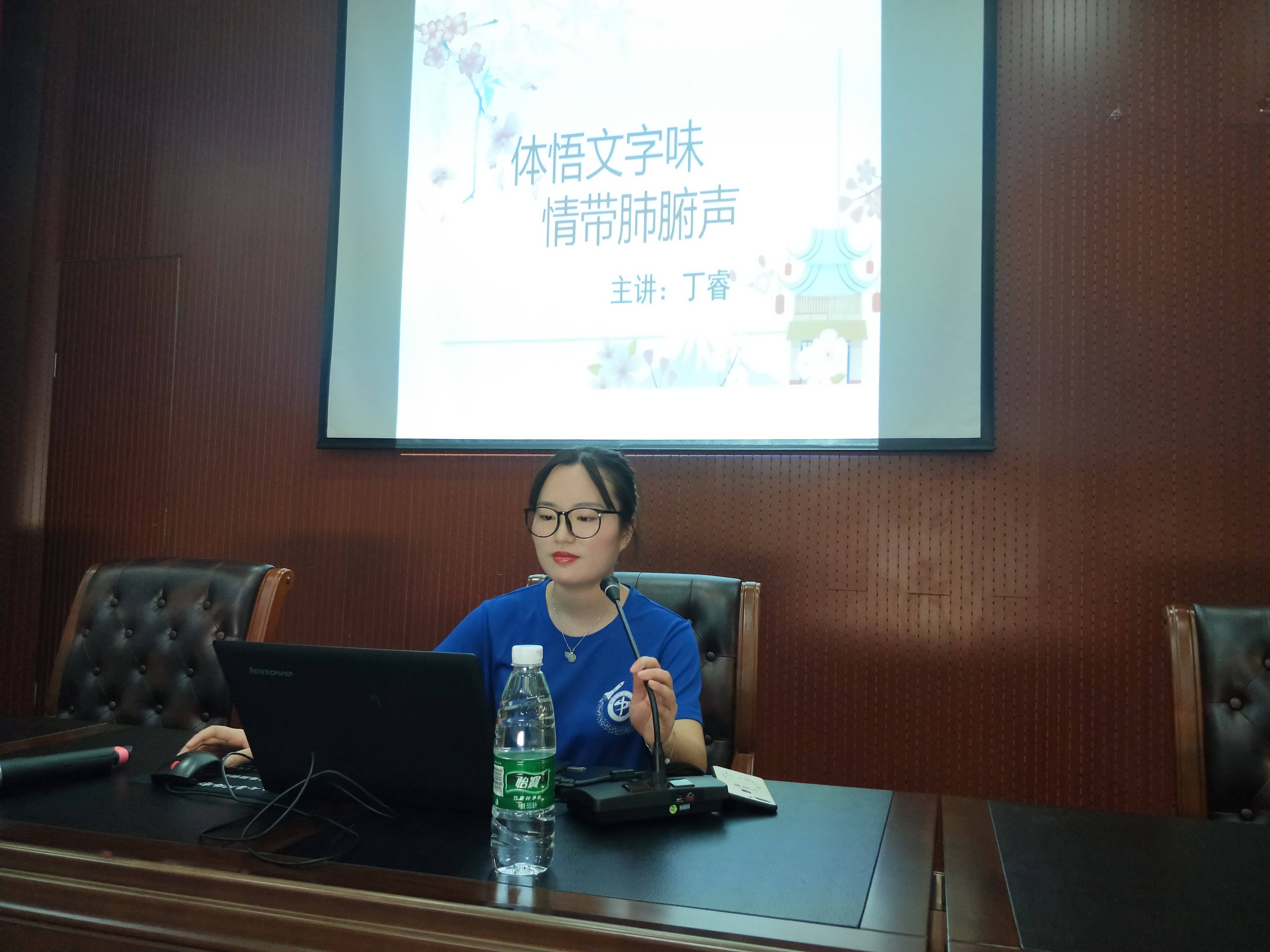 丁睿老师首先由同学们羞于在课堂上朗诵这一现象说起,提出要让朗诵“常态化”的观点。接着丁老师阐释了本次讲座的主题——体悟文字、以情带声。好的朗诵其实并不需要过多注重外在技巧,而是需要发自内心的洋溢的真情,这个“情”正是来源于一个个文本以及朗诵者对它们的把握、感知。丁老师以著名主持人汪涵用长沙话朗诵《沁园春•雪》的视频为示例,大气磅礴又独具韵味的方言朗诵让同学们耳目一新且甚为感动。