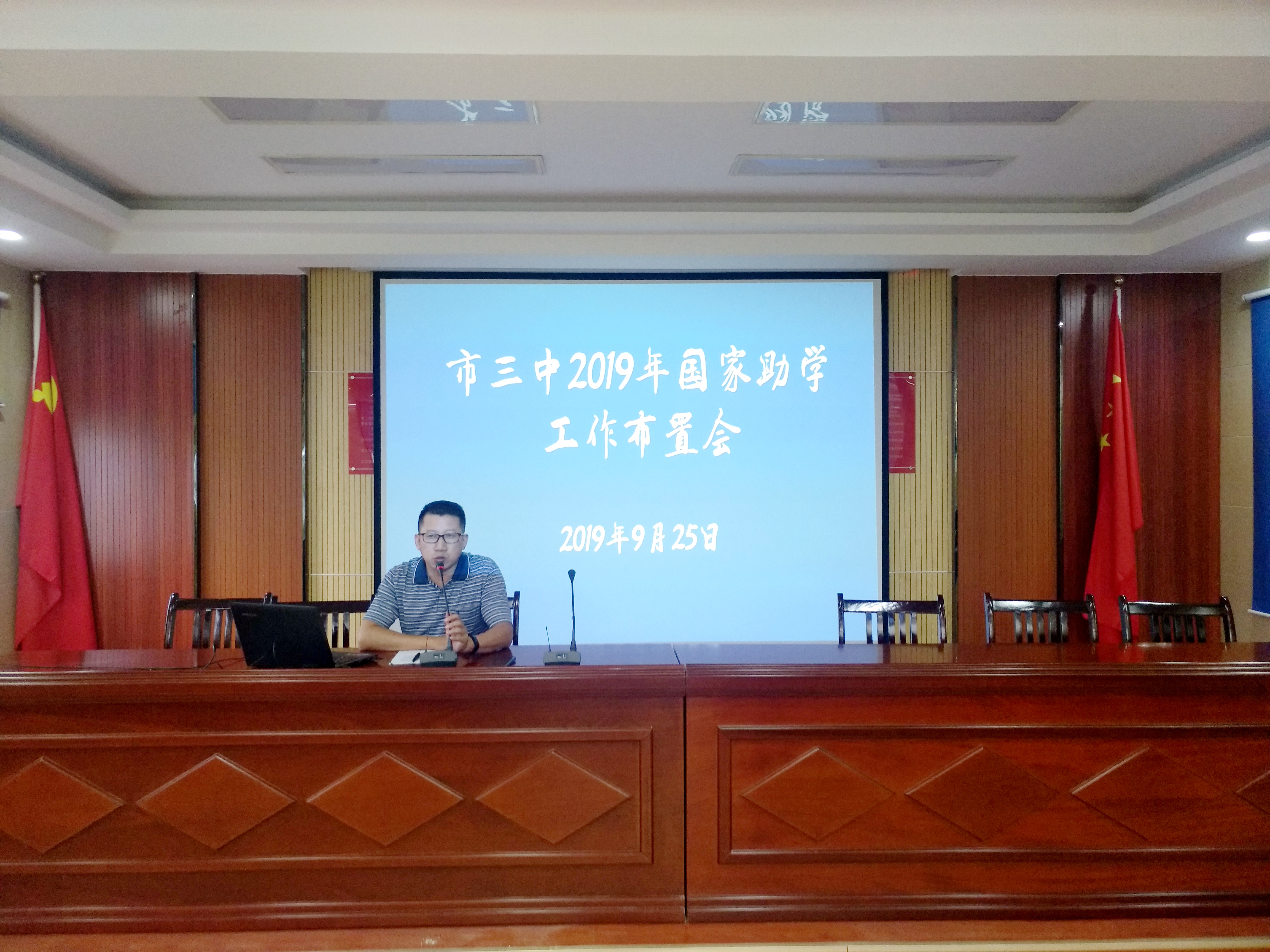 9月25日下午,市三中2019年秋季国家助学工作专题布置会在综合楼五楼多媒体会议室召开,全体班主任老师参加会议。校资助办负责人、校团委书记徐盼主持会议。