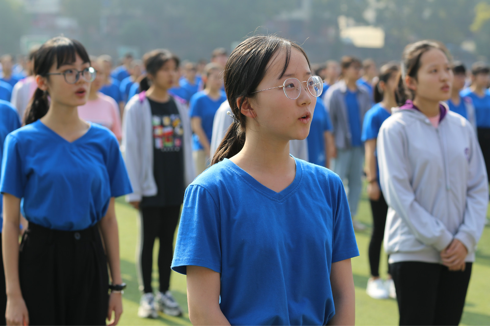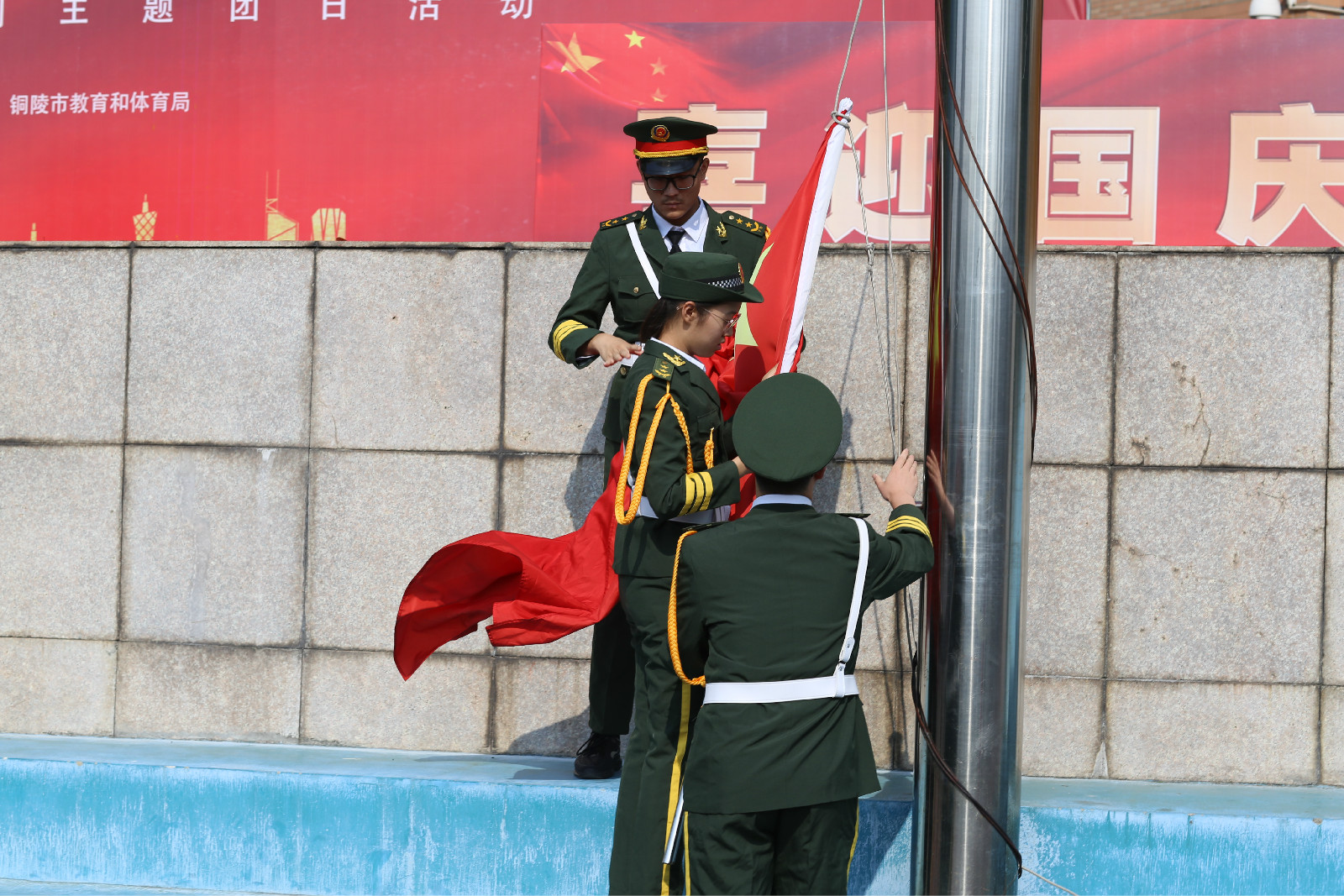 9时15分,升旗仪式正式开始。铜陵三中国旗护卫班手举国旗迈着铿锵有力的步伐走向升旗台,伴随着《歌唱祖国》嘹亮歌声的响起,升旗手振臂将国旗展开,国旗随着旋律缓缓上升,台下全体师生齐唱国歌,行注目礼,师生的每一句歌词、每一个眼神都饱含着浓浓的爱国情怀。