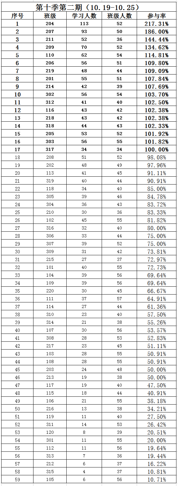 在“青年大学习”第十季第二期网上主题团课的学习中,我校共有2075名青年师生参与学习,总体参与率达到140.96%,其中100%以上的班级有17个。现将各班级具体学习情况统计如下: