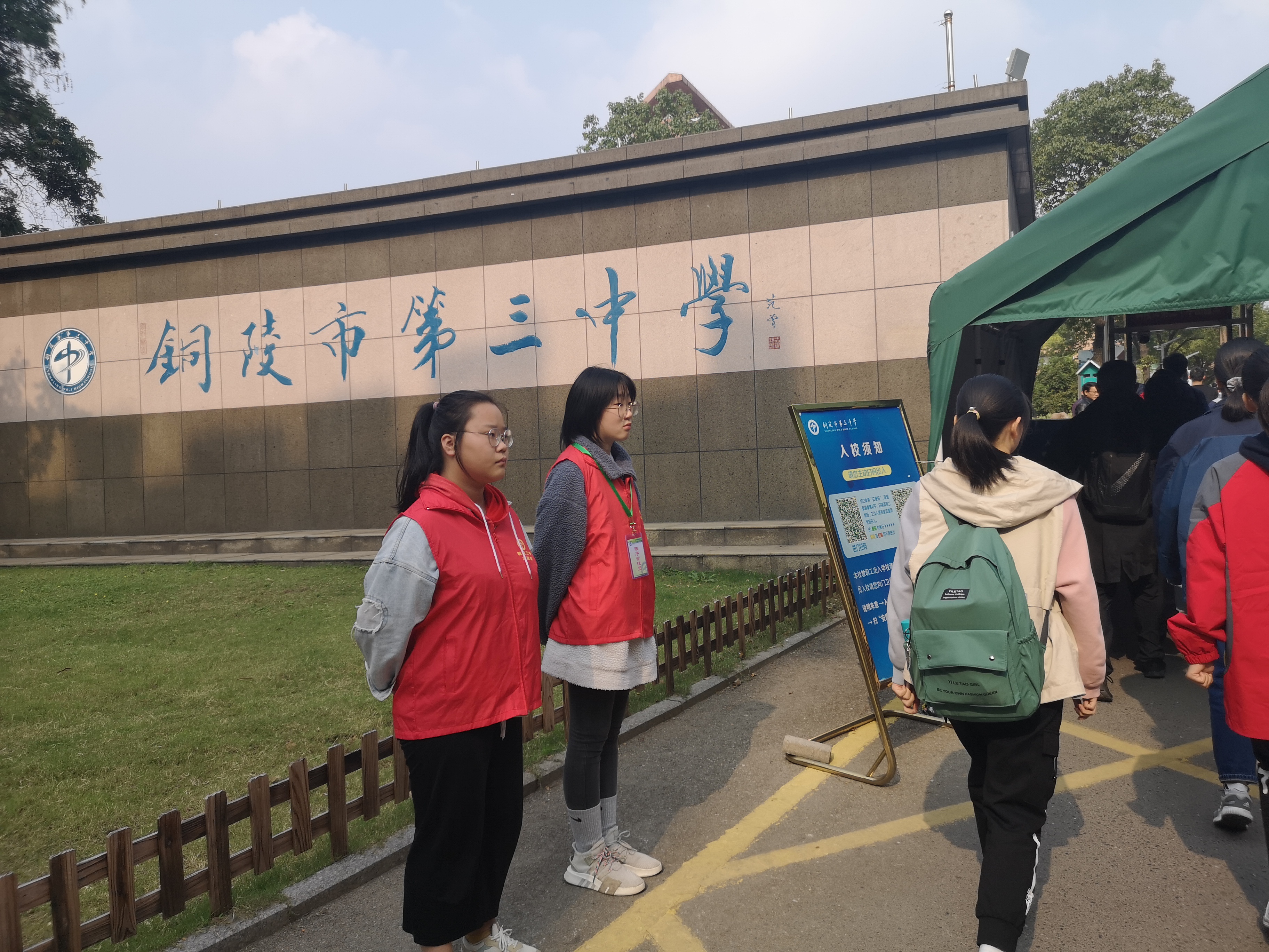 负责学校大门的同学被班主任分做三列,每列两人。主要任务就是让同学有秩序地进入学校,也就是排队从测温同道进来,遇见没有从测温通道进入的同学,须要及时组织,并引导他们从测温通道通过。听到班主任的吩咐,同学们的神态大不相同:有些活跃外向的同学激动的到达自己的岗位,目送着同学们进入校园;有些同学则比较腼腆,磨磨蹭蹭的走到自己的岗位,面对着人群,低着头;还有的同学比较好奇,四处张望着。