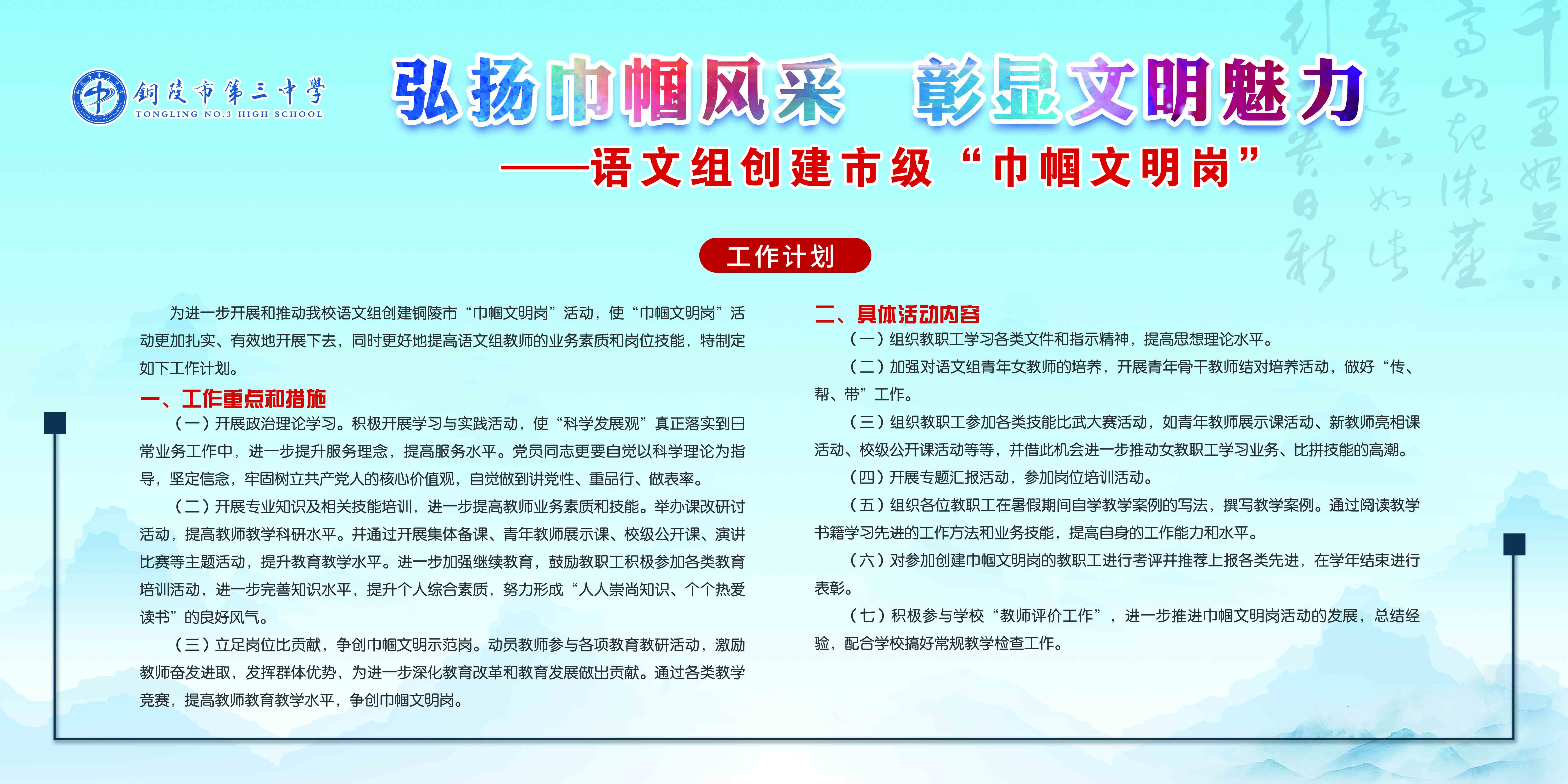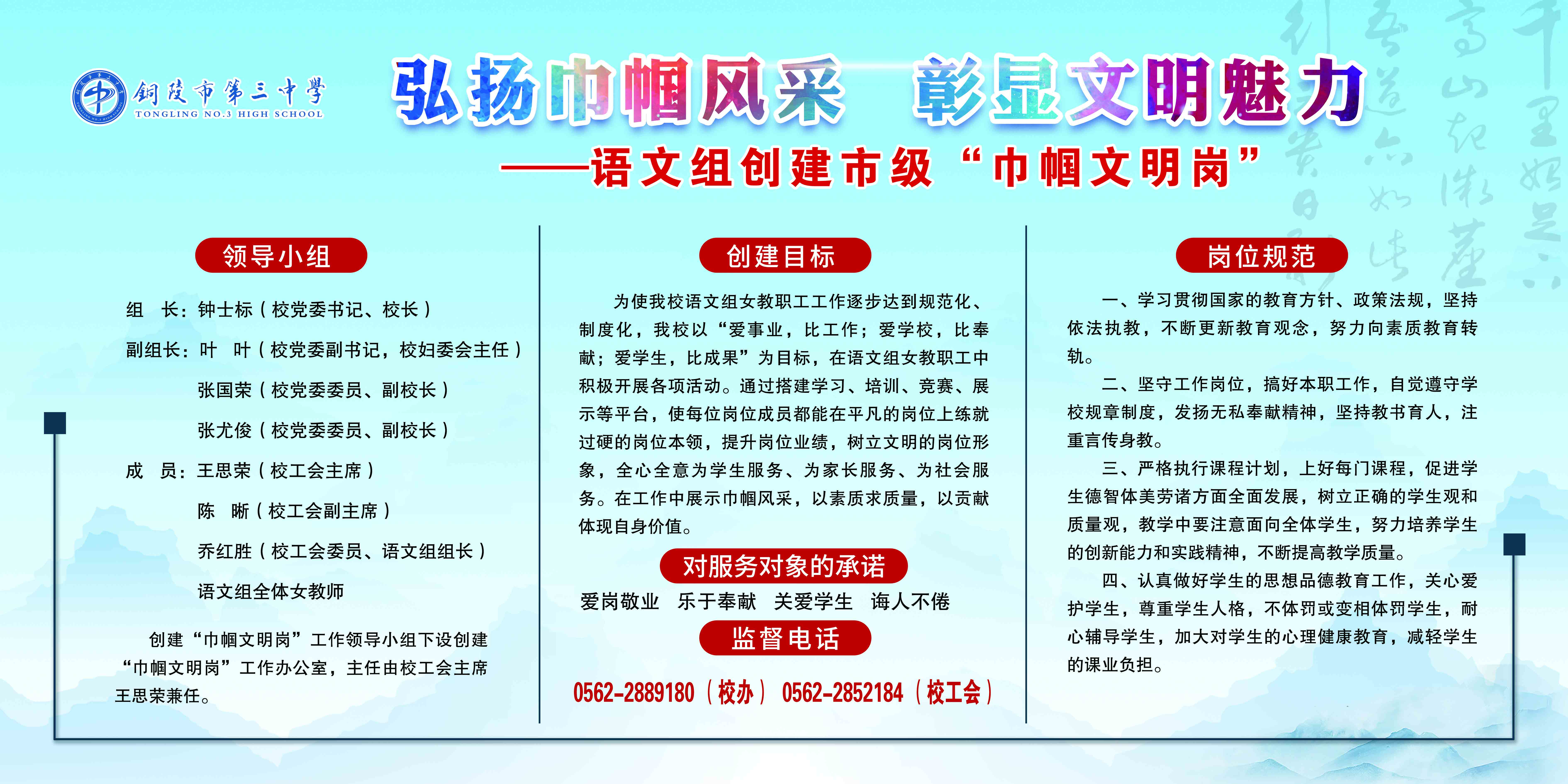 在接下去的工作中,我校语文组女教师将会继续努力,进一步践行教育理想,推进素质教育,并不断延伸优质教育的触角,回报社会,努力将巾帼文明岗做深、做实,力求以新的成效展示出铜陵三中巾帼示范的新风采。