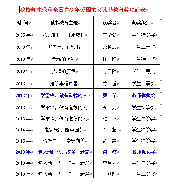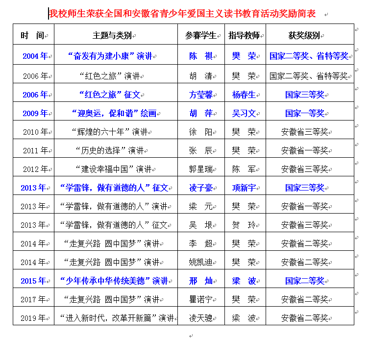在历届全国青少年爱国主义读书教育活动中,我校涌现出一批优秀的参赛学生和指导老师。 2004年,陈祺同学参加第十一届中学生“奋发有为建小康”爱教读书演讲比赛,荣获全国二等奖和安徽省特等奖,指导教师樊荣。2005年,方莹馨同学在第十二届全国青少年“心系祖国,健康成长”爱国主义读书教育活动中荣获特等奖。2006年,胡清同学参加第十三届中学生“红色之旅”爱教读书演讲比赛,荣获全国二等奖和安徽省特等奖,指导教师樊荣。方莹馨同学在第十三届全国青少年“红色之旅”爱教读书征文比赛中荣获三等奖,指导教师杨春生。2009年,胡萍同学在第十六届全国青少年“迎奥运,促和谐”绘画比赛中荣获一等奖,指导教师吴习文。