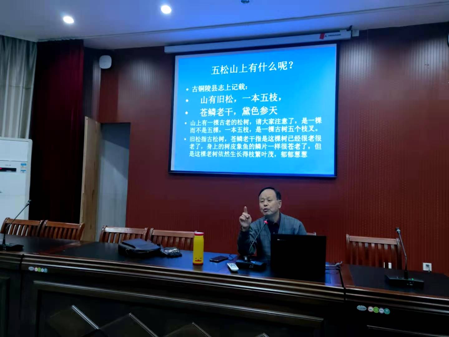 俞老先是从历史典籍出发,探寻五松山文化底蕴,李白在此处游玩数次,留下十余首诗歌,后又从《铜陵县志》出发,结合多方考证,为同学们揭示了五松山就在铜官此处的历史迷雾。俞老之考证环环相扣,既有古书之佐证、又有地图之相衬,再结合逻辑推理,引得在场老师和同学们的暗中惊叹!