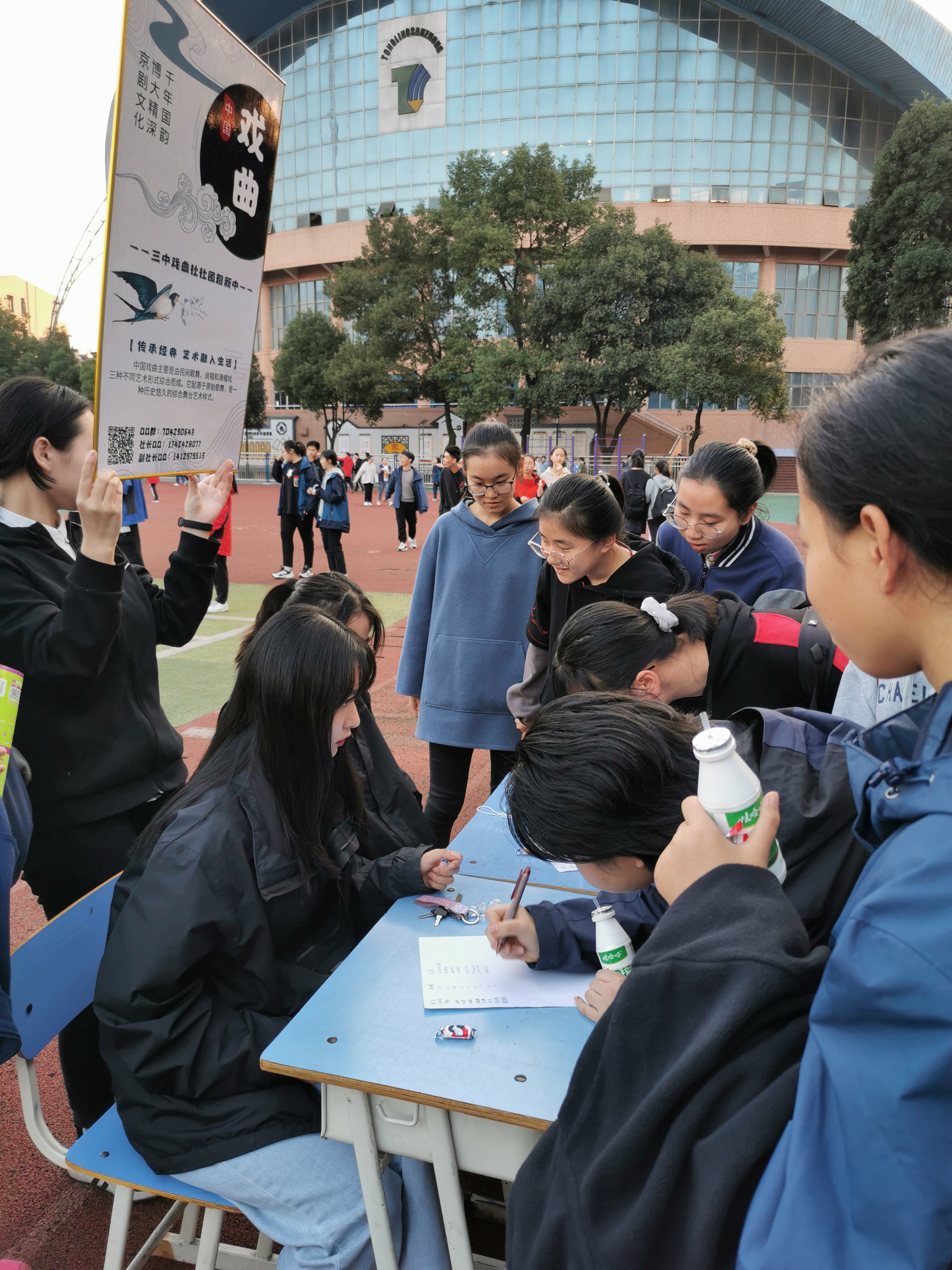 近年来,我校学生社团工作逐步向规范化发展。校团委指导成立学生社团联合会,公开择优选拔社团管理骨干,各社团均配备指导教师,加强对社团活动的过程性评价,定期评选“十佳优秀学生社团”和“优秀指导教师”,确保规范有序高质量开展活动——例如流行音乐社成功举办第五届“三中好声音”校园歌唱大赛、文学社举办“走近名师”大讲堂系列活动、朗诵艺术团开展“如何让你的声音更好听”系列活动等等。目前,我校已有四个社团荣获“市级优秀社团”称号,学生社团真正成为贯彻落实“身体健康,心理阳光,学业进步”办学理念、促进广大学子非智力因素培养和健康和谐的校园文化建设的重要载体。
