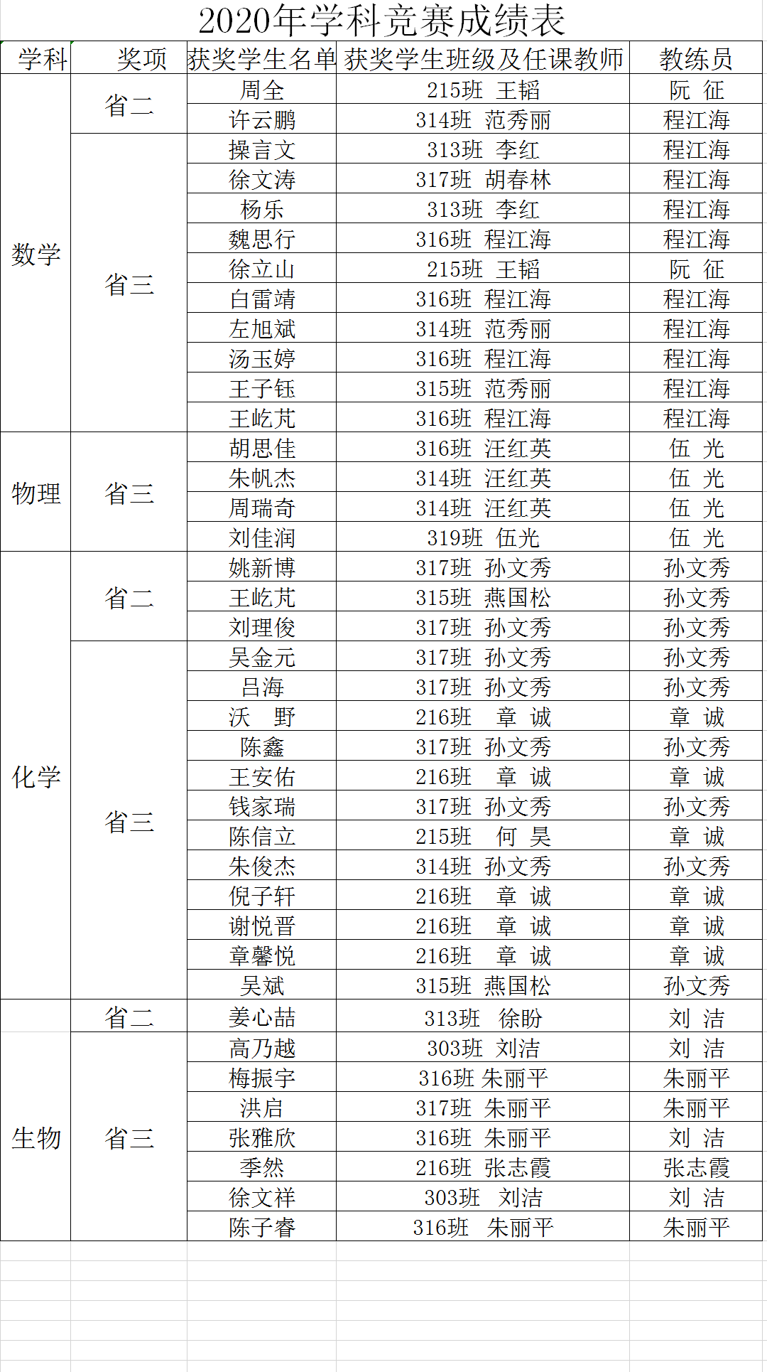 在2020年全国中学生数学、物理、化学、生物学联赛比赛中,通过全体教练员、任课老师和学员的共同努力,我校共有39人次学生获得省级奖项,在此我们感谢教练员与任课老师们的辛勤付出,并向获奖同学、教练员及任课老师表示热烈的祝贺。