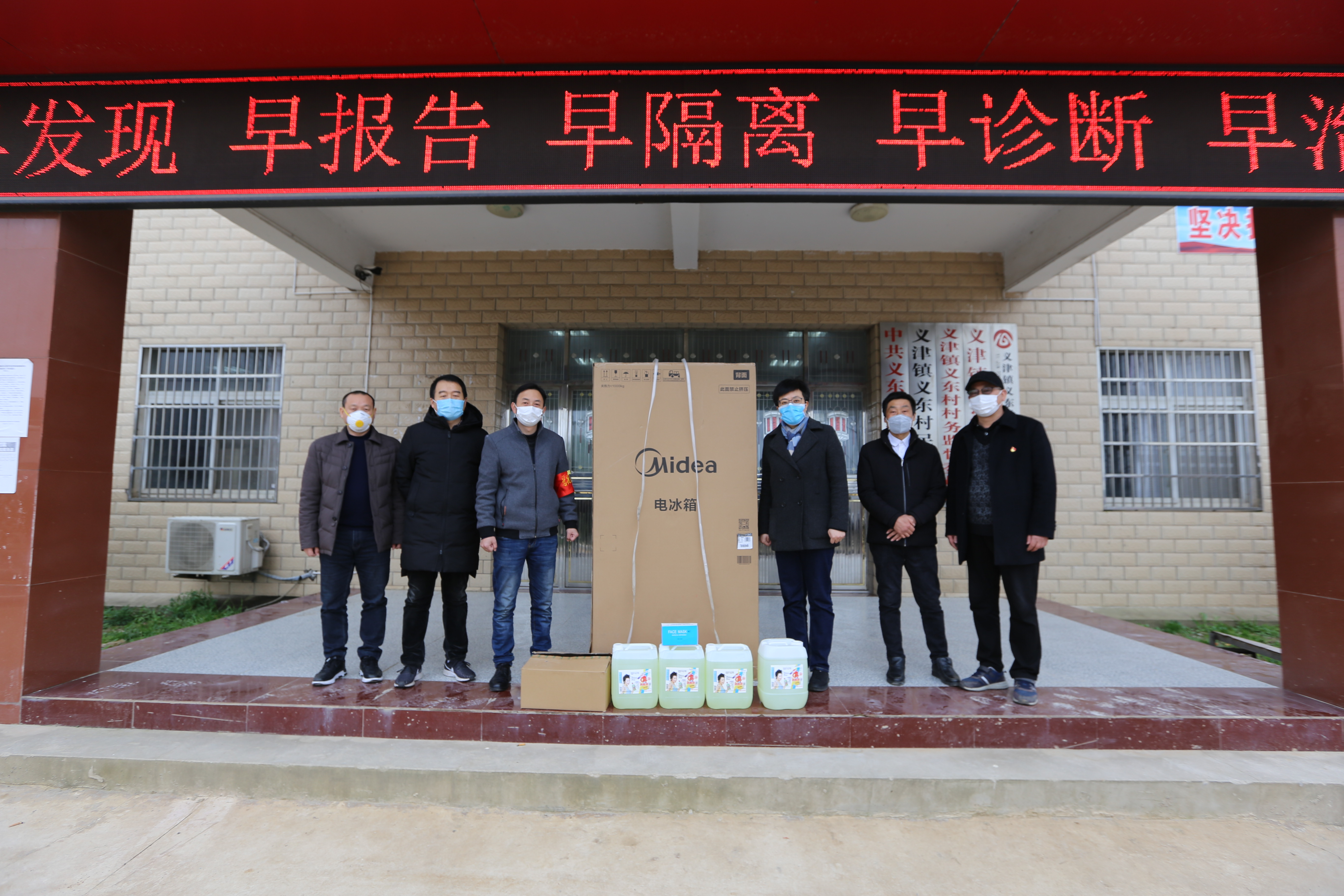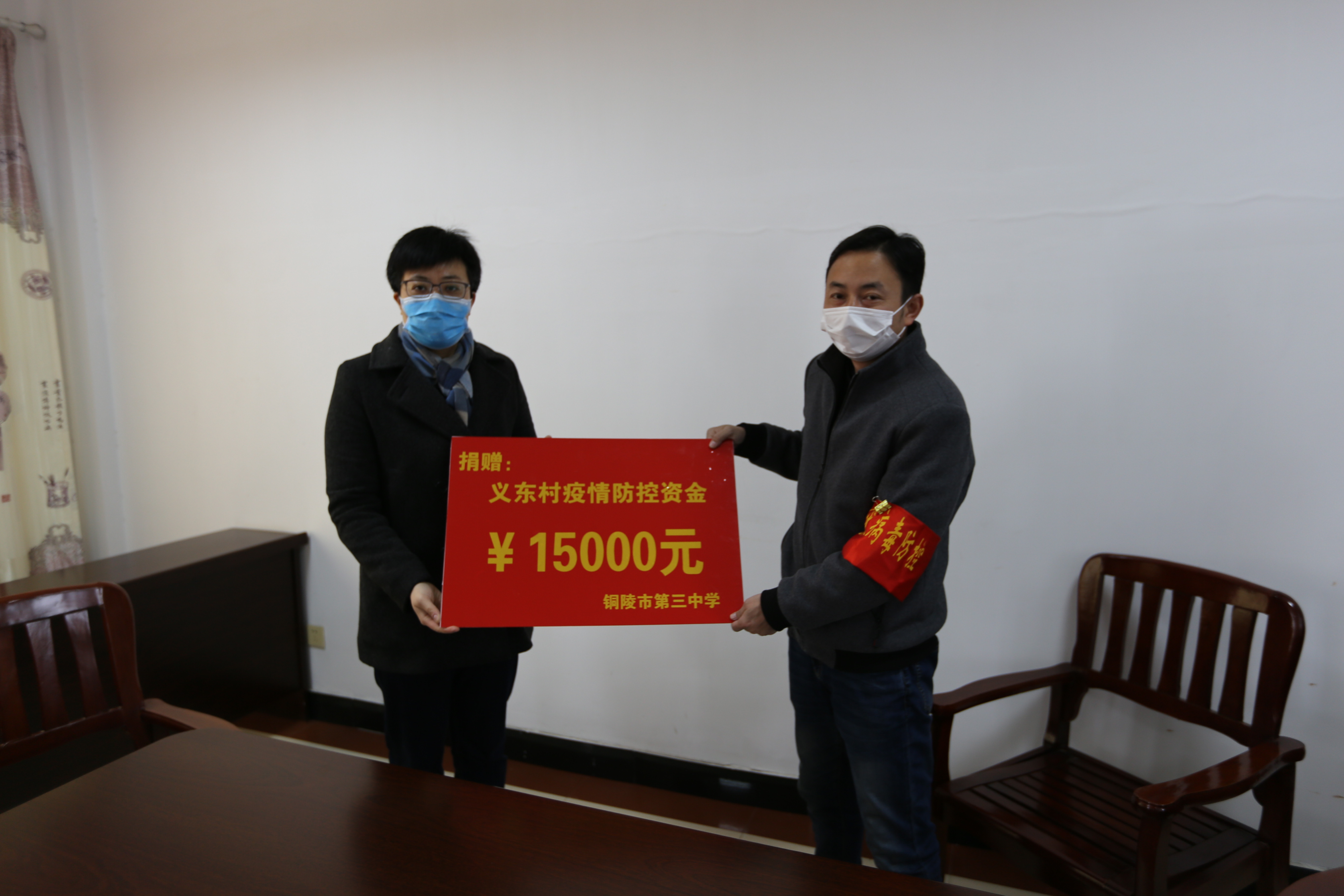 本校讯 2月27日上午,受联合党委书记、铜陵三中党委书记、校长钟士标同志委托,铜陵市三中党委副书记叶叶、政教处主任章学标、总务处副主任骆为一行驱车来到我校对口帮扶村——枞阳县义东村,看望慰问疫情防控一线工作人员,为义东村送去了1万5千元抗疫慰问金,一台双门冰箱、消毒液、酒精、口罩等生活防护物资。