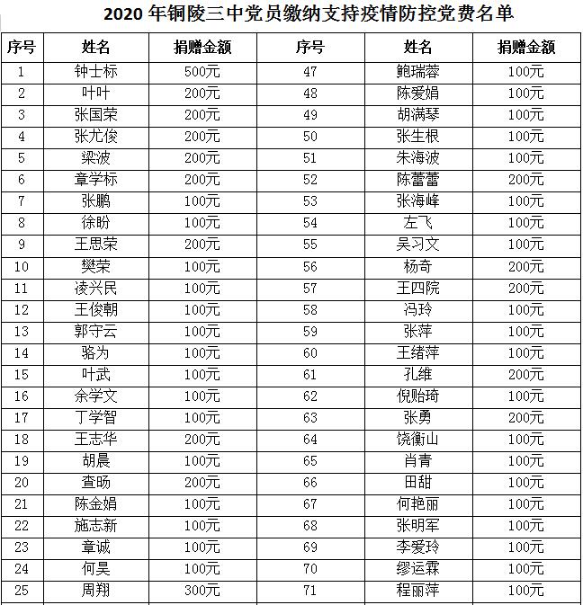 短短三天时间,学校三个党支部的党员们纷纷表示,不能辜负党组织的培养,愿尽己所能为疫情防控出一份力。总计收到的交纳支持疫情防控工作的党费:理科支部3600元,文科支部6900元,行政支部2300元,党费总数12800元。这些党员们用缴纳党费的方式,向奋战在疫情第一线的“逆行者们”献上了一份份特殊的、沉甸甸的爱。在疫情面前,广大党员干部群众必将万众一心、众志成城,以实际行动和担当,坚决打赢疫情防控阻击战!