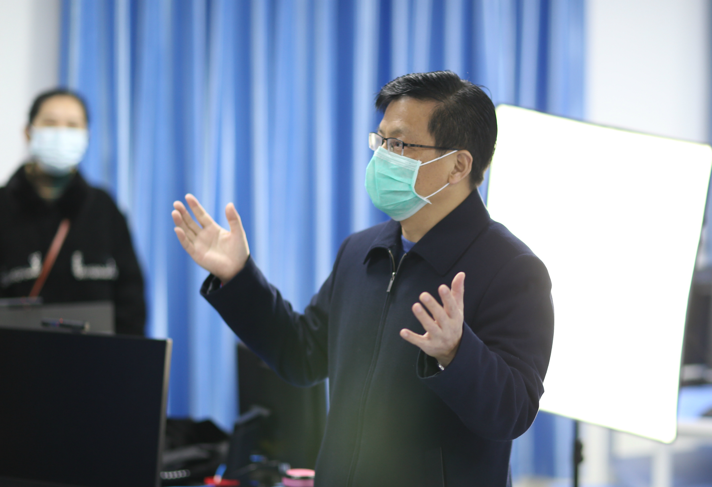 在我校科学馆二楼,谷越局长现场查看了我校电教教学的实施情况,并与正在录制语文学科的陈应德老师进行了交流,谷越局长指出,特殊时期,我们开展“停课不停学”工作,要不折不扣地落实国家各项防疫要求,充分发挥信息化设备和教育技术装备的作用,进一步提高学校信息化设备应用和实验教学水平,多为学生奉献优质精品课程。