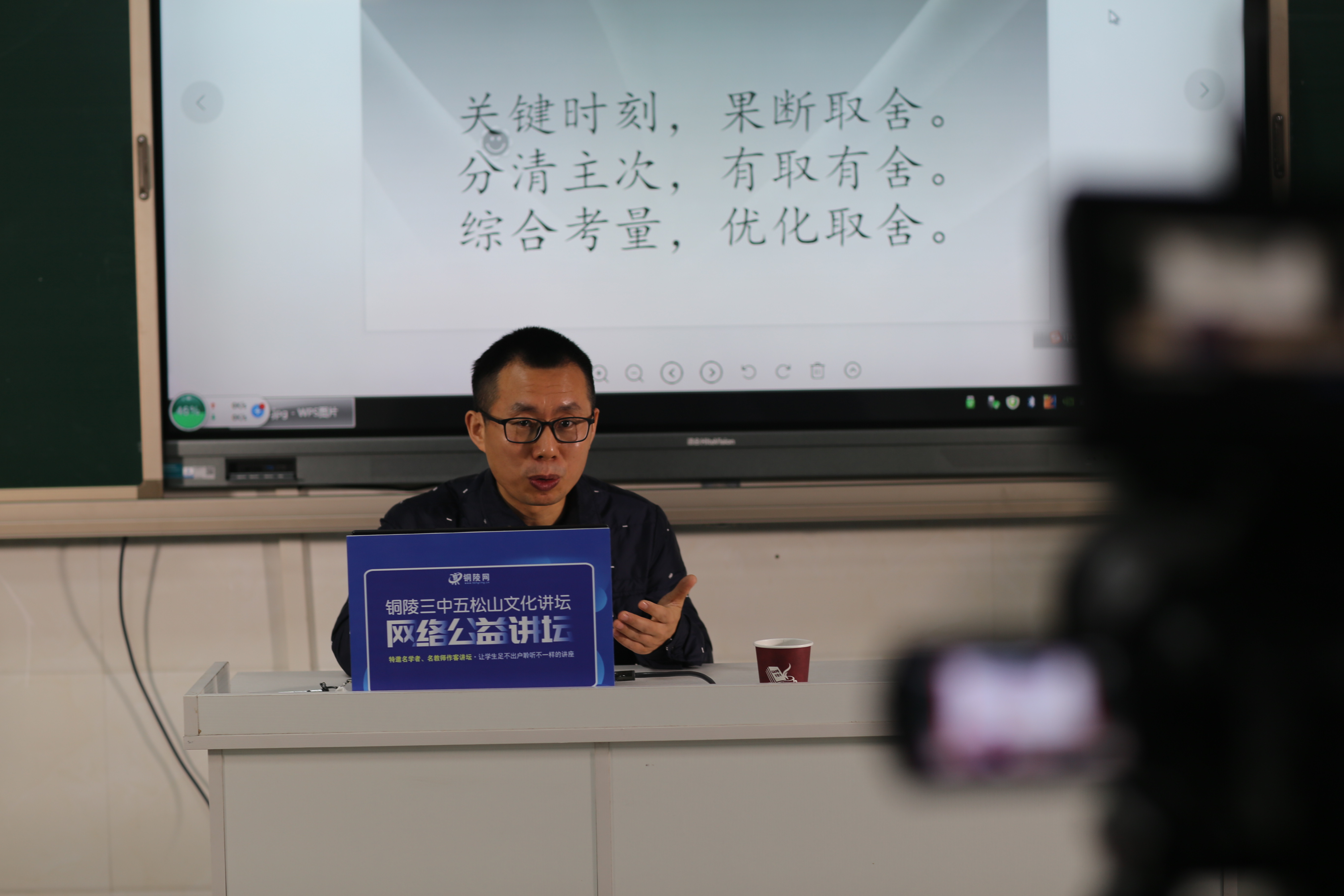 据了解,特殊时期,铜陵三中五松山文化讲坛开设“网络公益讲座”活动,将陆续邀请人文教育、心理学以及全市中高考知名学者、专家和名师,分“人生智慧”、“家国情怀”、“理想接力”、“巍巍学府”四大板块,每周日分时分阶段全程免费网络公益直播,以期分享青少年健康成长之道、中高考备考策略、中华优秀传统文化等,服务广大学子足不出户聆听不一样的名师系列讲座,助力成长成才!