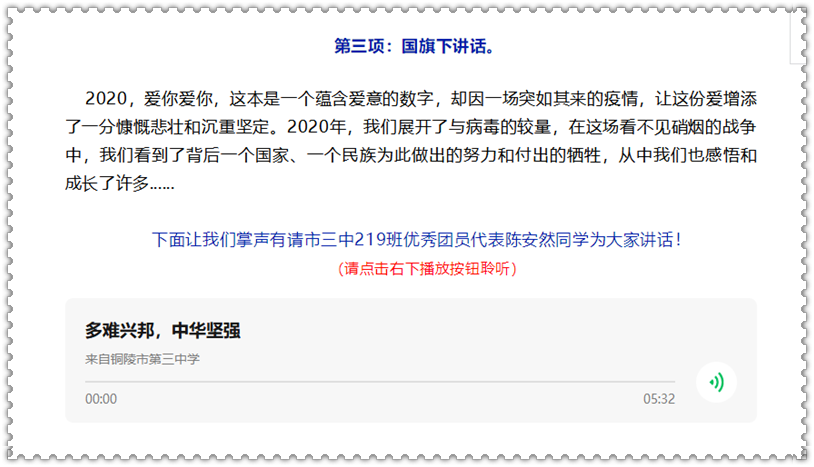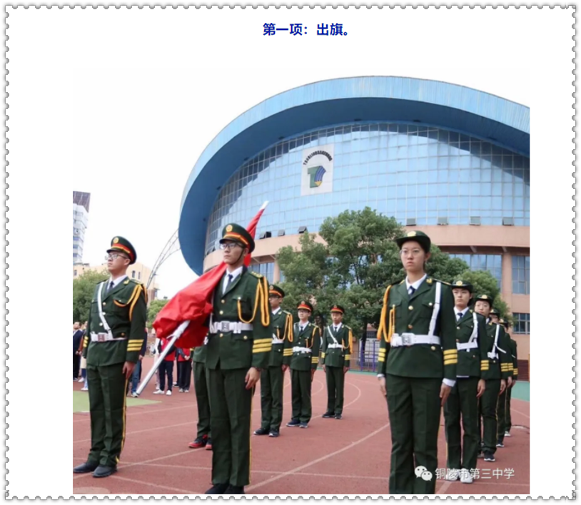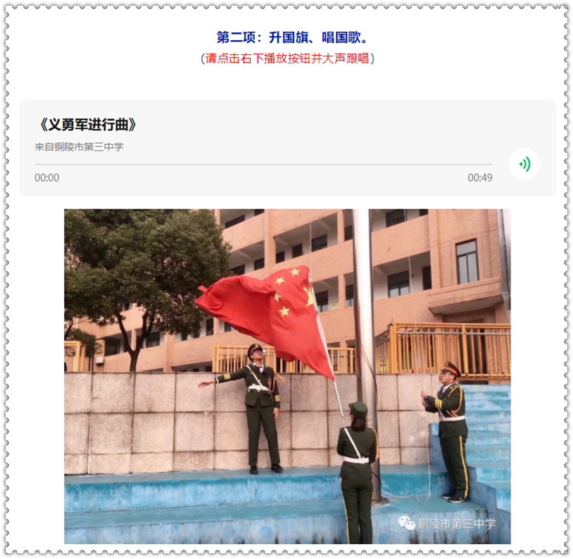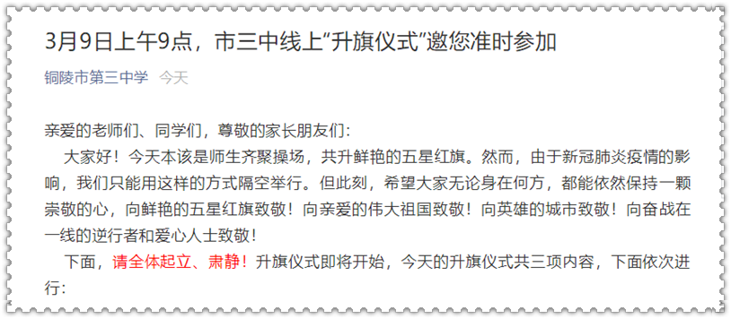 本次线上升旗仪式依托校官方微信公众号“铜陵市第三中学”,以文字、图片、音频等形式,再现升旗完整流程。俊朗的国旗护卫队、雄壮的国歌、掷地有声的国旗下讲话,虽然是线上仪式,可是同样肃穆庄严。