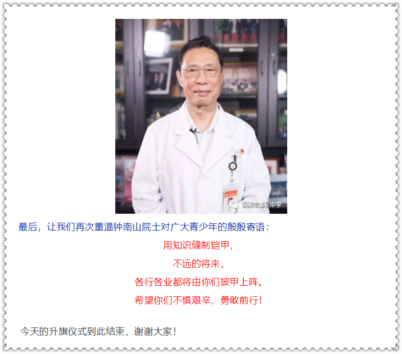 是的,同学们,我们虽年少但并不是家国天下的旁观者,应该让自己成长为像钟南山院士那样“民族脊梁,国士无双”的人。如此,中华定强,定代代坚强!