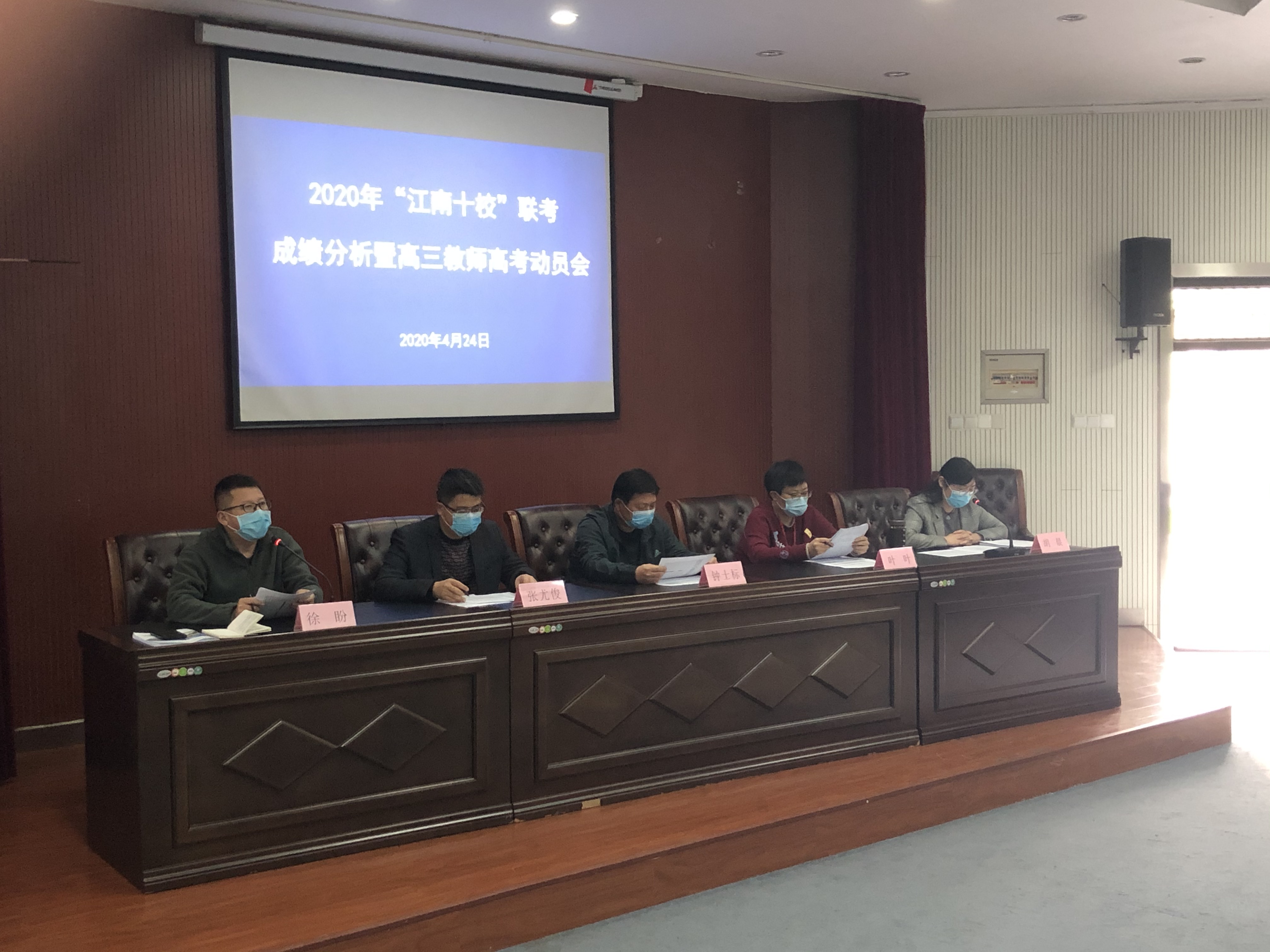 4月24日下午,铜陵三中2020年江南十校联考成绩分析暨高三教师高考动员会在多功能厅召开。校党委书记、校长钟士标,校党委委员、副书记叶叶,校党委委员、副校长张尤俊,教务处主任徐盼以及全体高三教师出席会议。会议由高三年级部长胡晨主持。