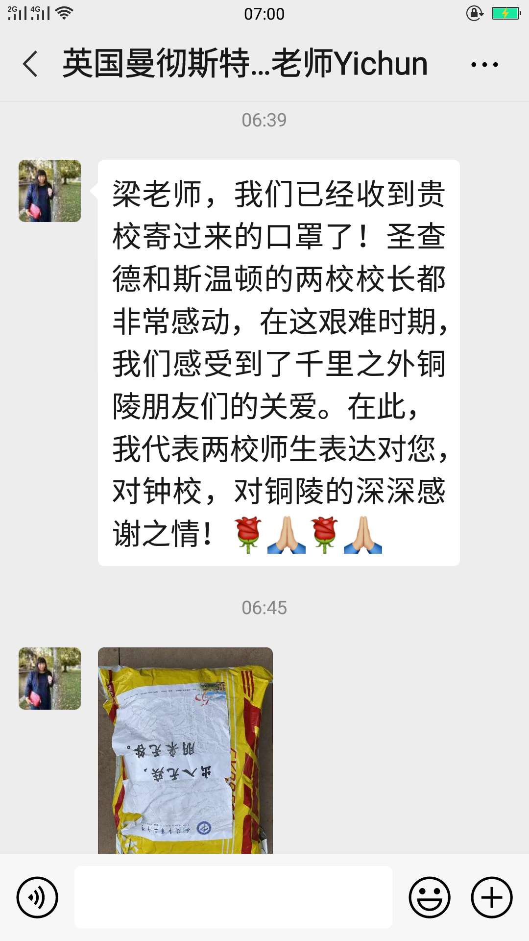 近段时间,得知英国疫情逐渐加剧,为支持英国友好学校抗击新冠肺炎疫情,铜陵三中出手相助,不仅第一时间表达慰问,并且捐赠了急需的抗疫物资——2100个医用口罩——支援哈尔顿圣查德中学和曼彻斯特斯温顿中学校园的疫情防控工作。
