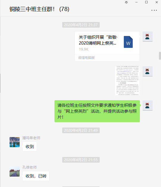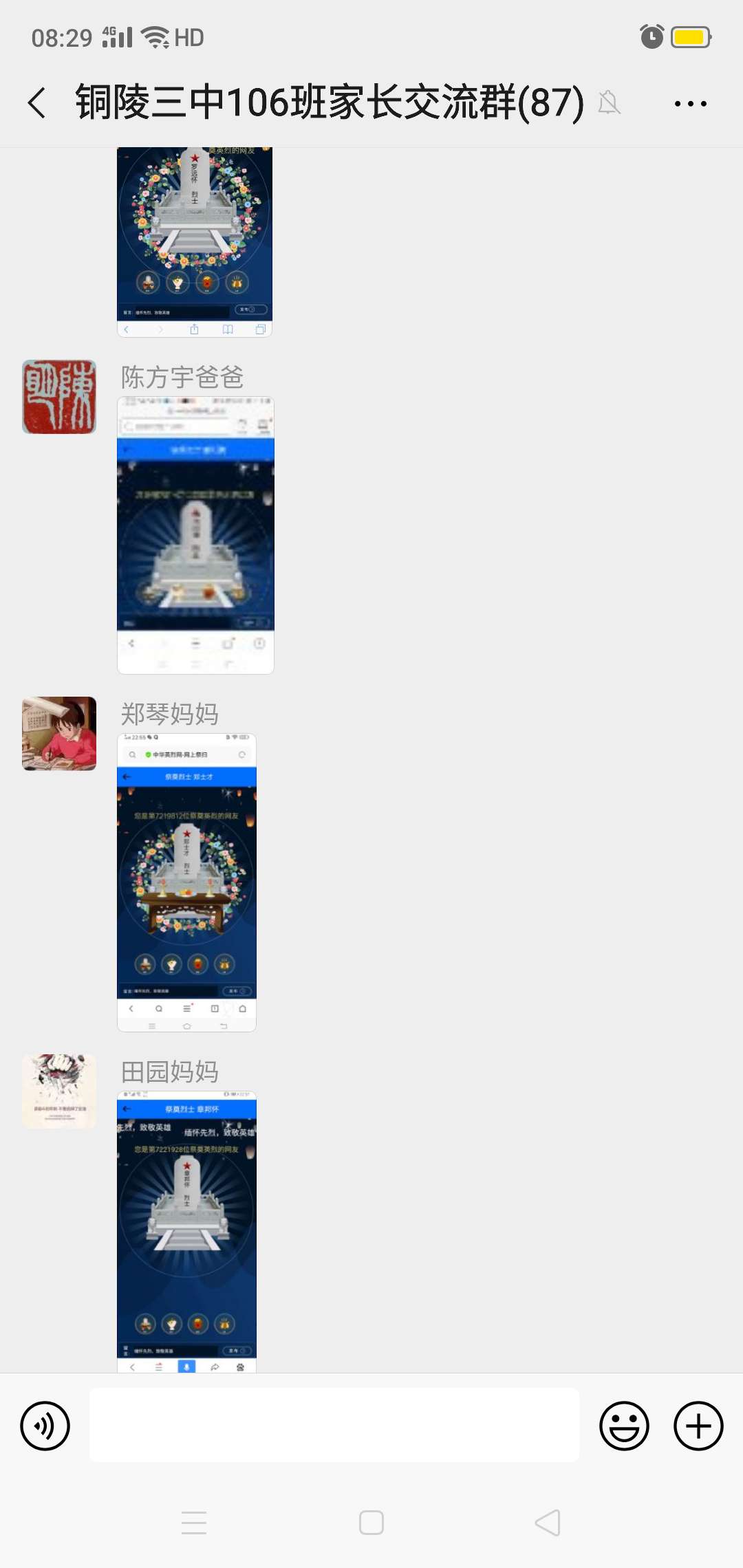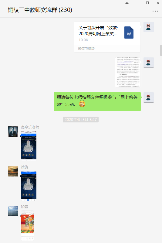 我校对此项德育活动高度重视,精心组织。积极引导全体师生积极参与此次活动。全体师生们在清明假期前后几日,积极参与此次“致敬·2020清明祭英烈”活动。广大师生通过登陆铜陵市人民政府网(http://www.tl.gov.cn/)、中华英烈网(http://www.chinamartyrs.gov.cn/)、铜陵文明网(http://tl.wenming.cn/ 4月1日开通)等网站参与活动,向先烈鞠躬献花、抒写感言寄语等,慎终追远、缅怀先烈。通过实景模拟方式“足不出户”即可在网上祭奠英烈。