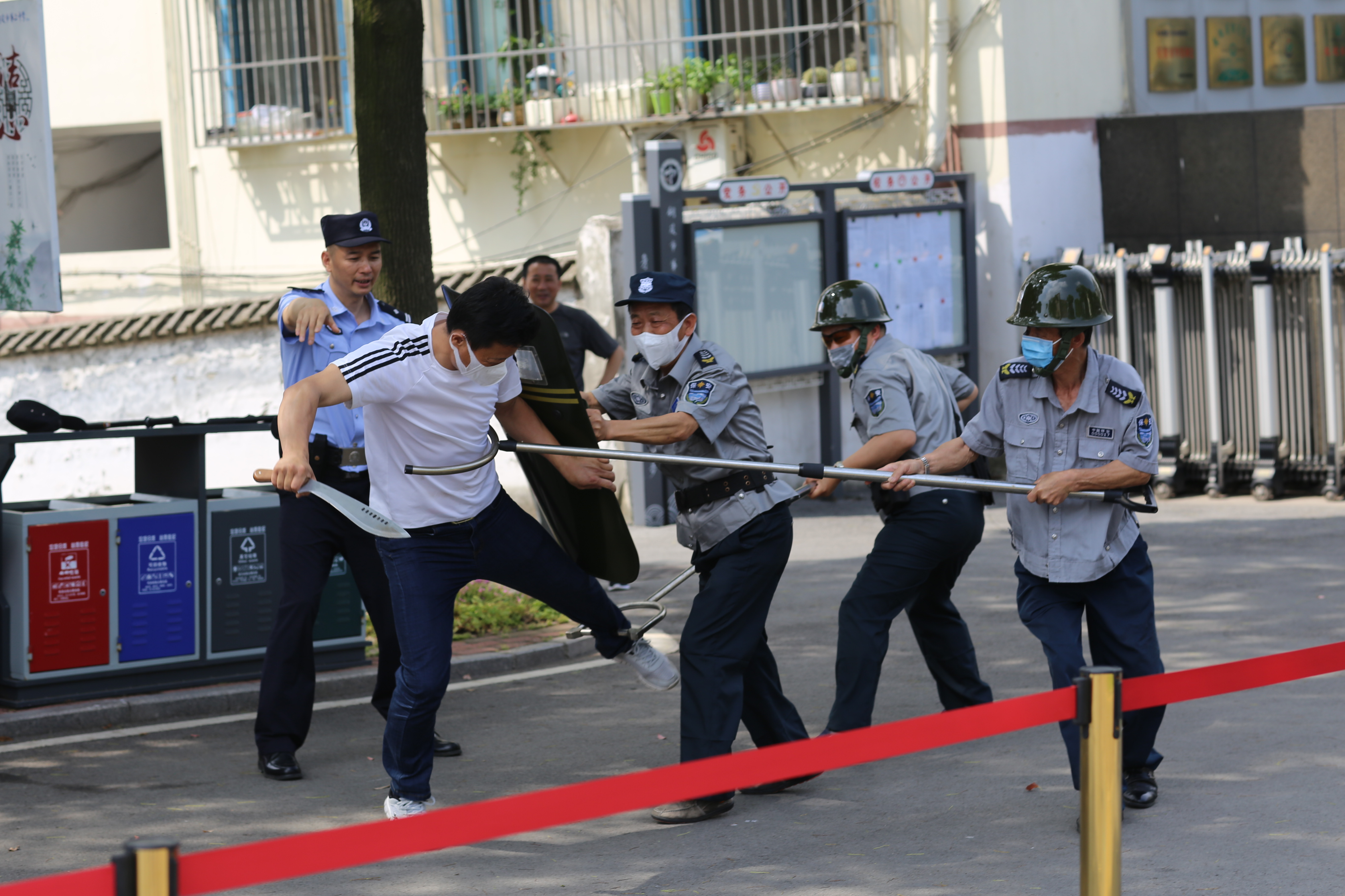 6月2日上午,保卫科在三中校园内举行二季度反恐演练,长江路派出所驻社区民警金锐、协警金佑文,三中保卫科负责人凌兴民,恒宇物业公司米丹经理及众保安等参加演练活动。