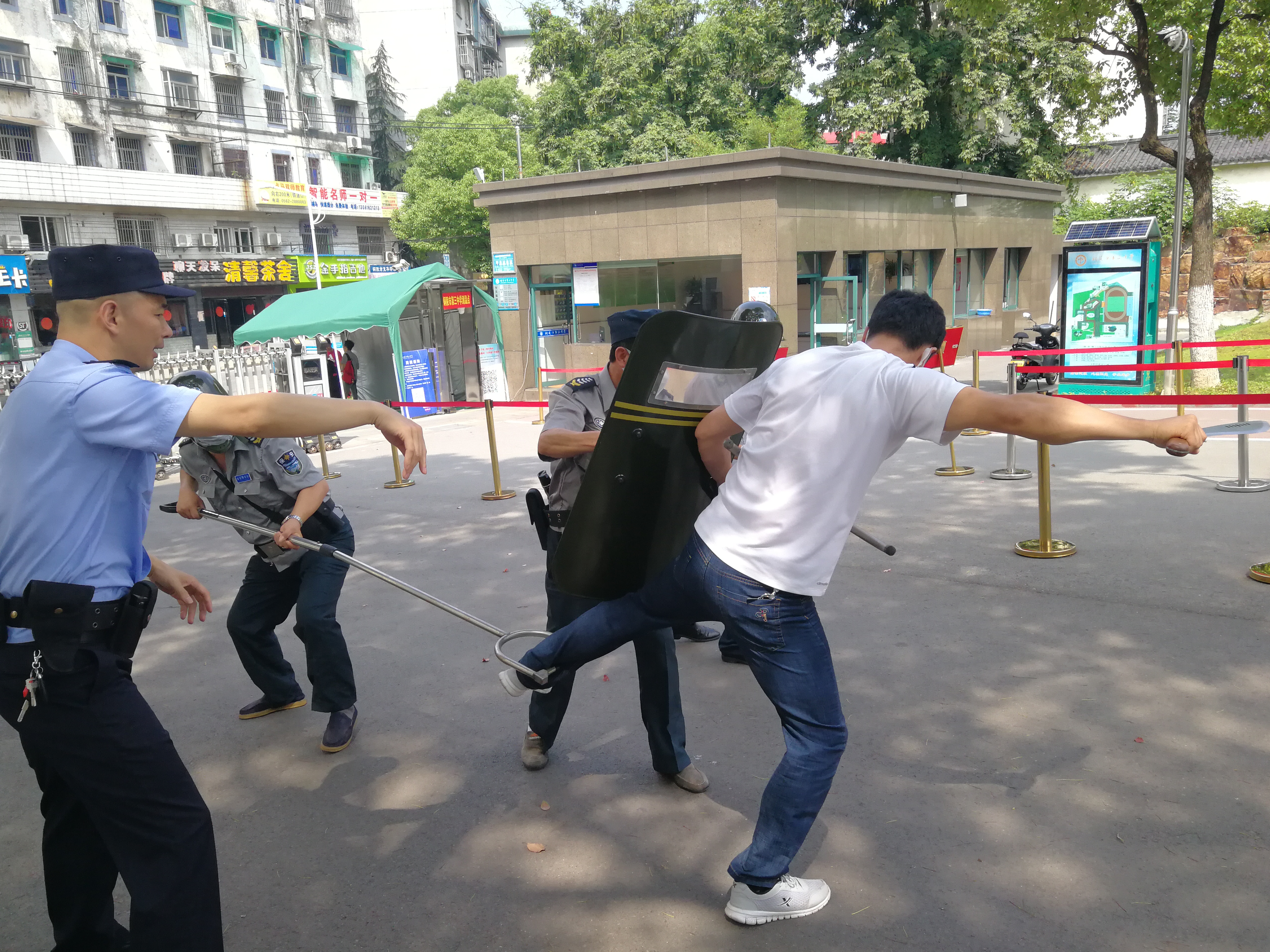 经反复演练,在现场组织的的反恐场面中,众保安集体配合,有人使用盾牌进攻恐怖份子,有人从侧翼进攻恐怖分子胸部,有人则从另一侧套住恐怖分子腿部并将其拉倒在地,恐怖分子迅速被制服,反恐演练获得圆满成功。