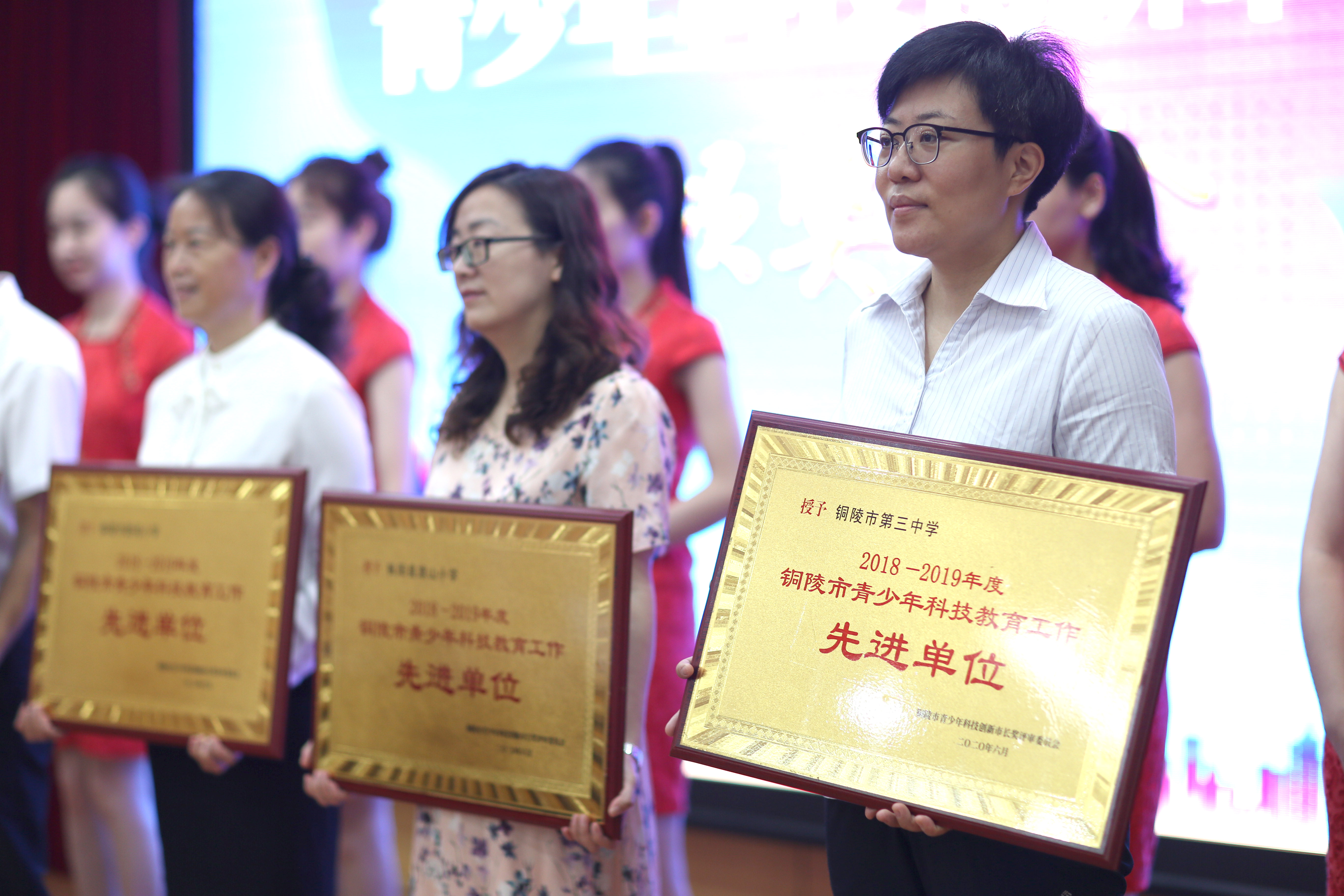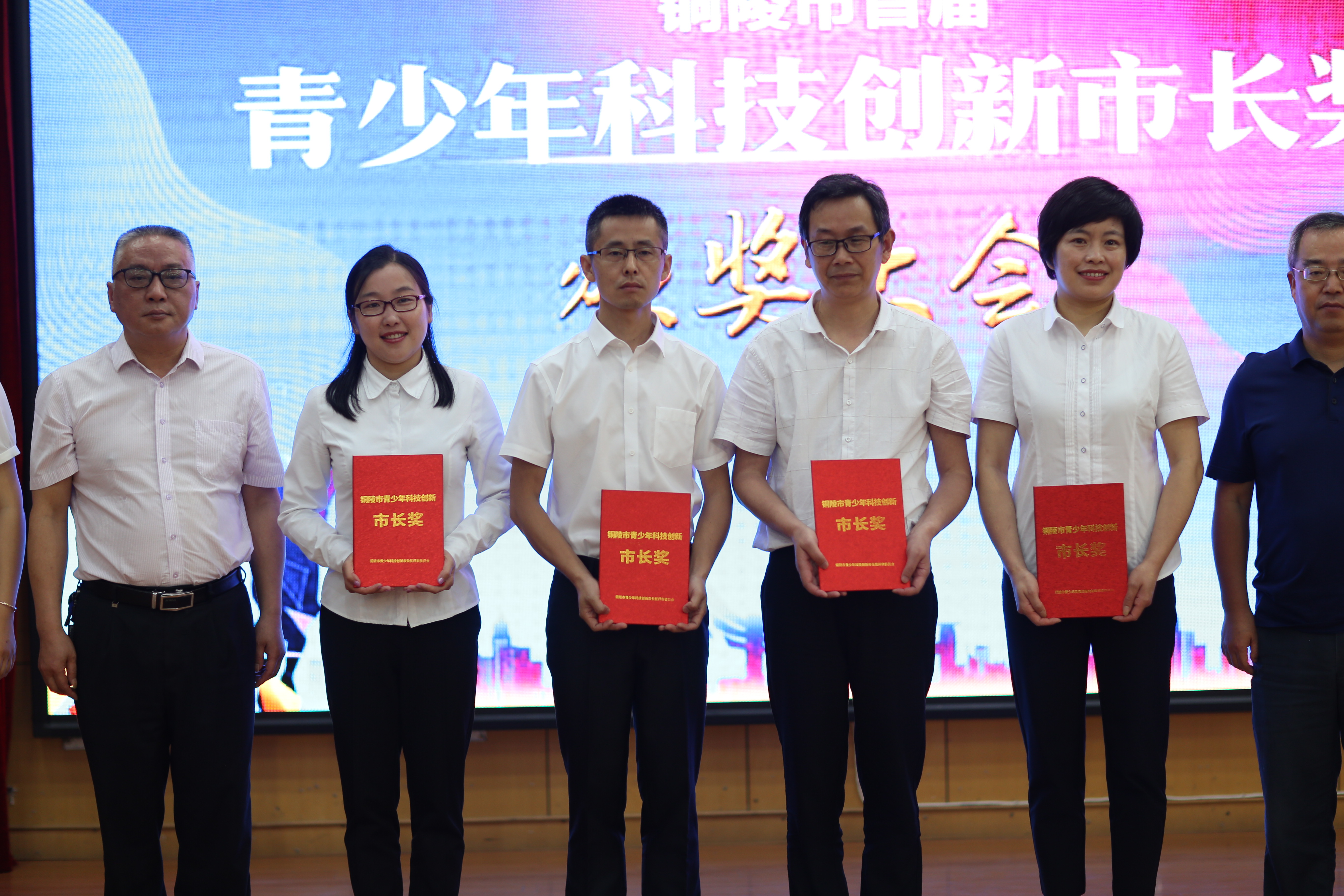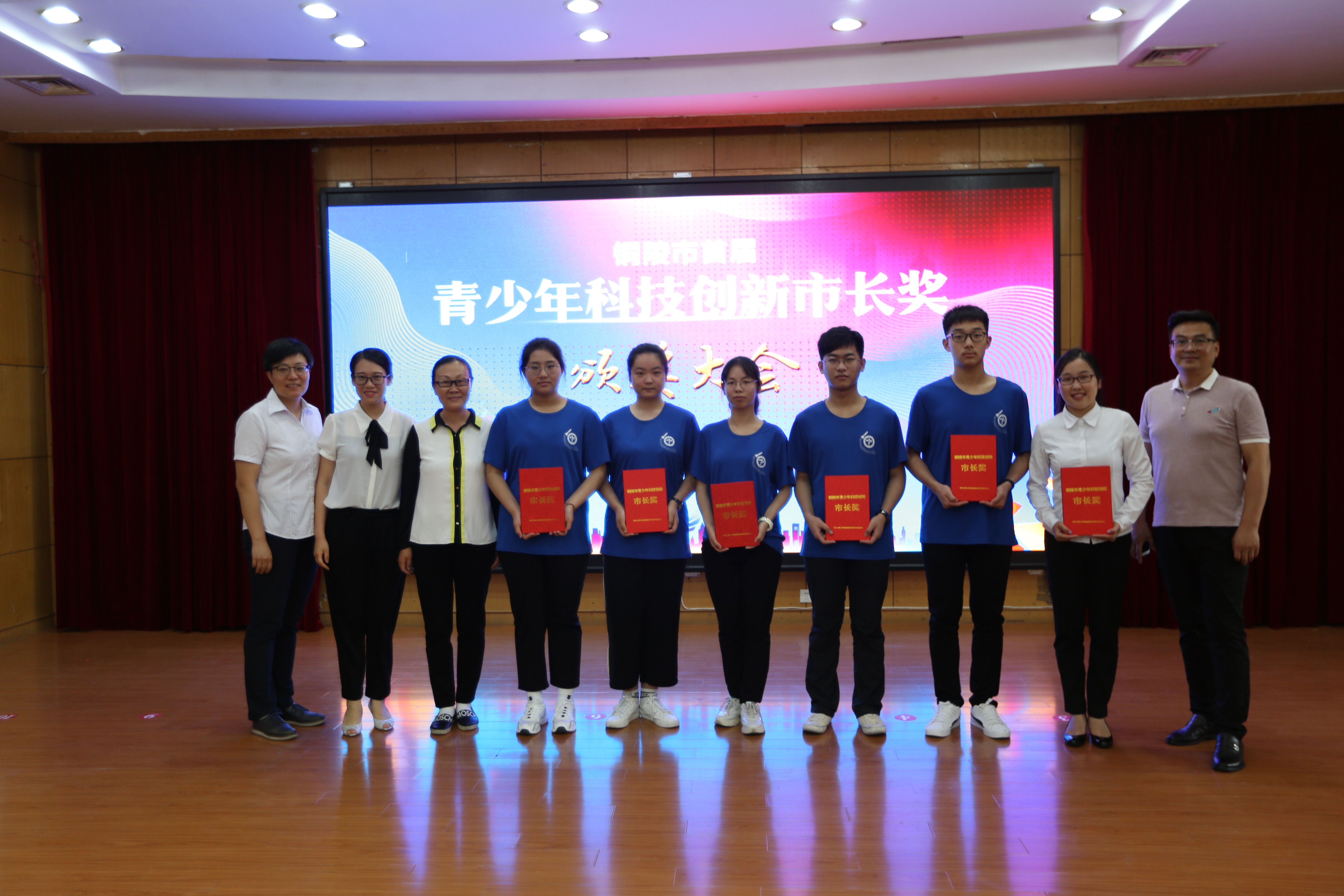 我校在铜陵市首届青少年科技创新市长奖表彰会上表现突出,获得大满贯,囊括了其中的所有奖项,其中,王頔同学荣获“青少年科技创新市长奖”;毛子木、刘畅、吴羽卿、徐志尧四位同学获得“青少年科技创新市长提名奖”;陈蕾蕾老师荣获“优秀科技辅导员奖”;三中获得“青少年科技教育工作先进单位奖”。会上,叶叶副书记代表获奖单位作了发言。