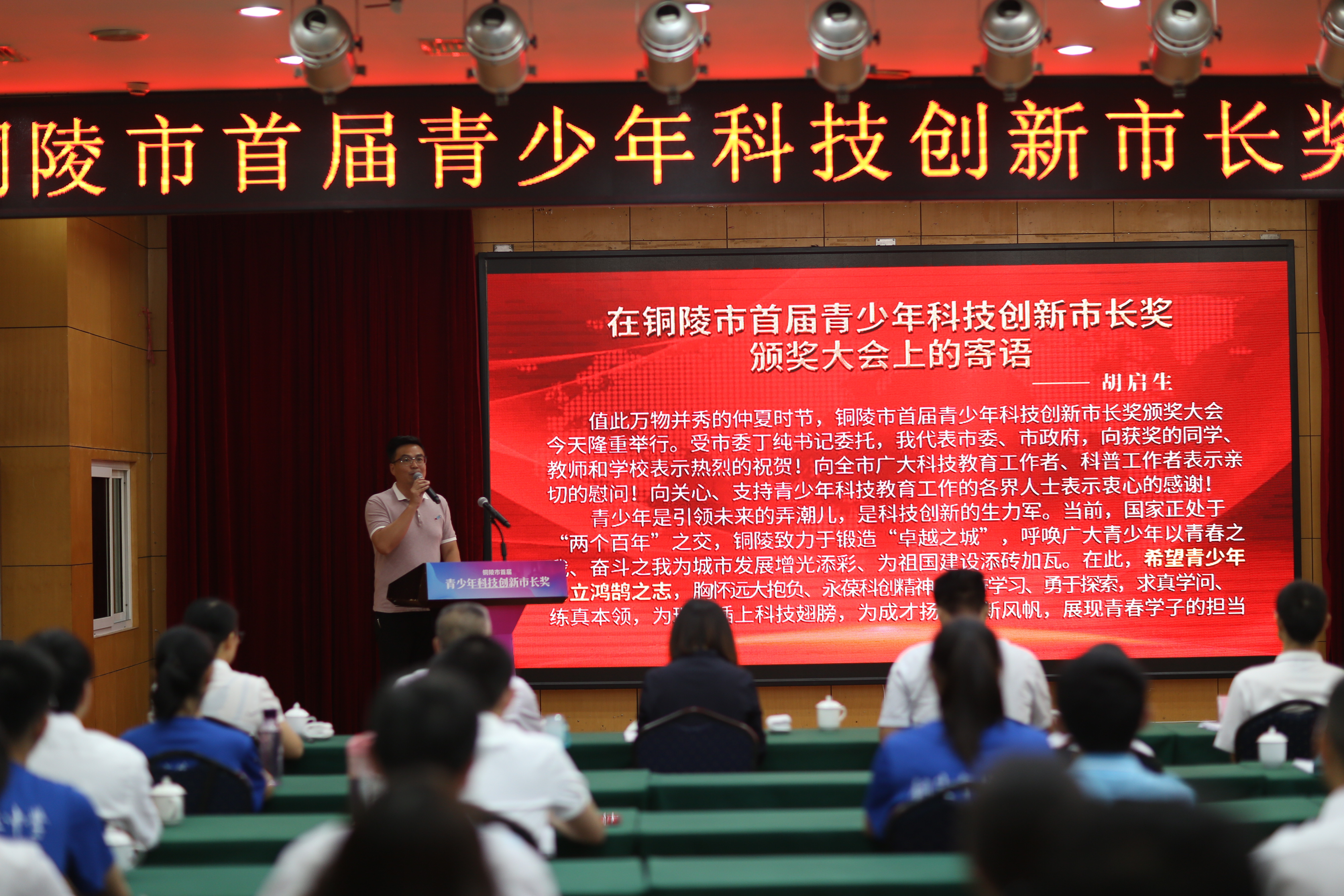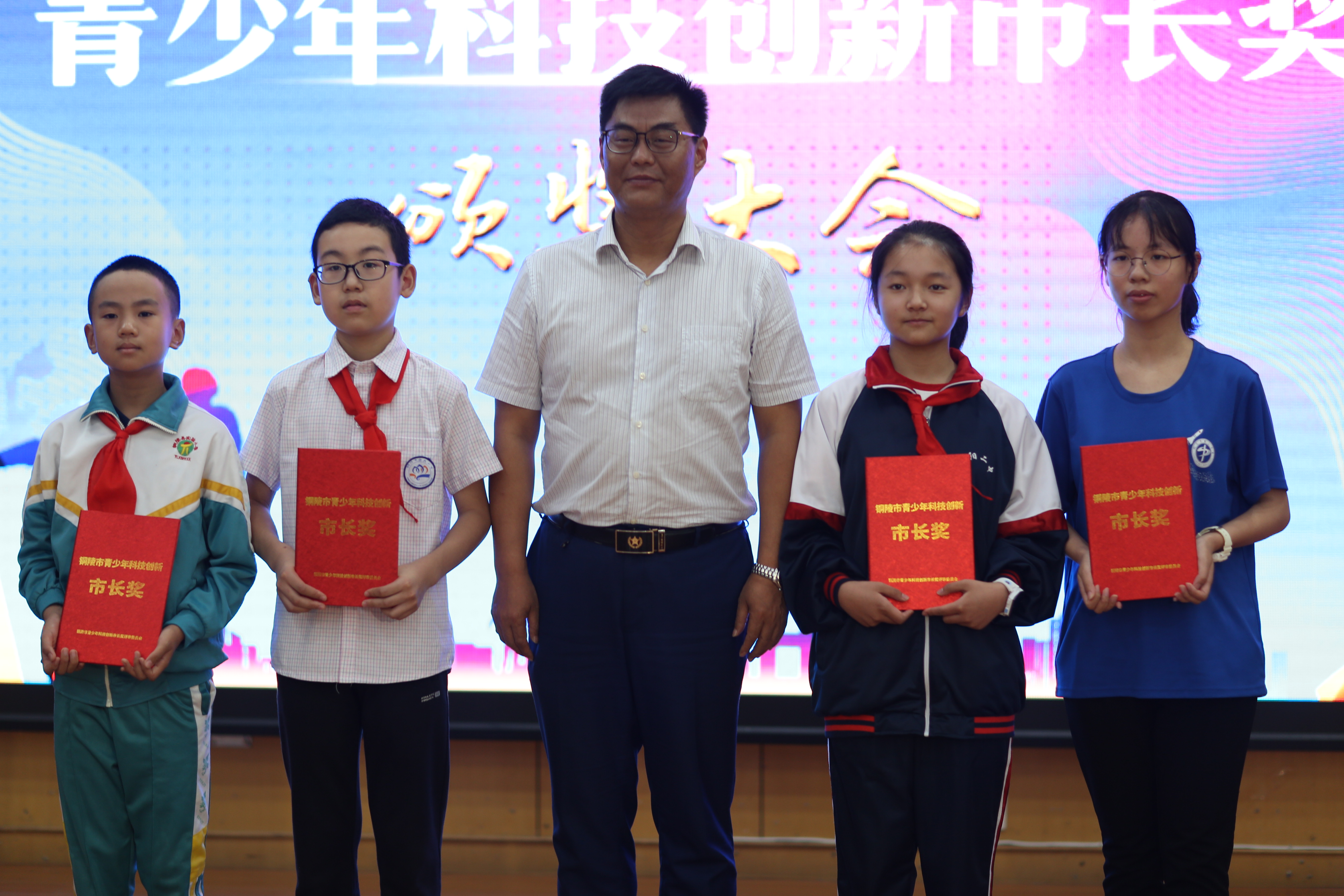 本校讯 铜陵市首届青少年科技创新市长奖表彰大会于今天上午在五松山宾馆召开,副市长吴强、科协主席单培、教体局副局长管清华、科协副主席汪洋等领导出席大会。大会由梁波老师主持。