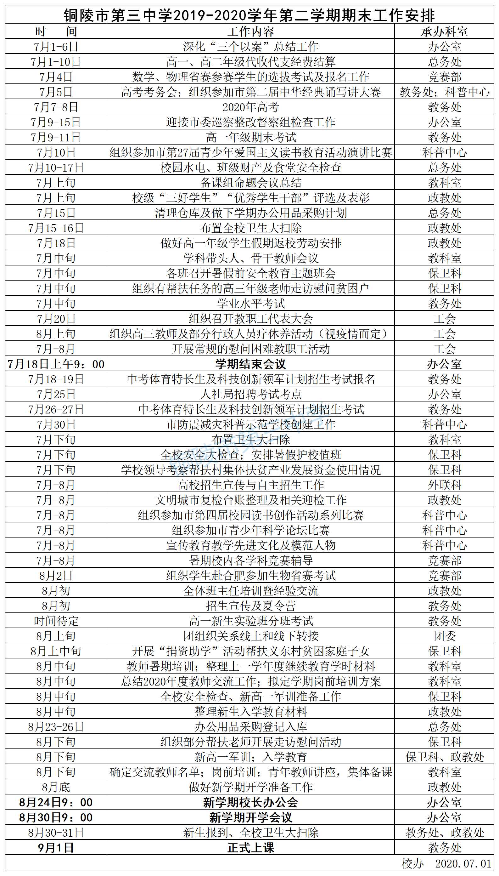 铜陵市第三中学2019-2020学年第二学期期末工作安排
