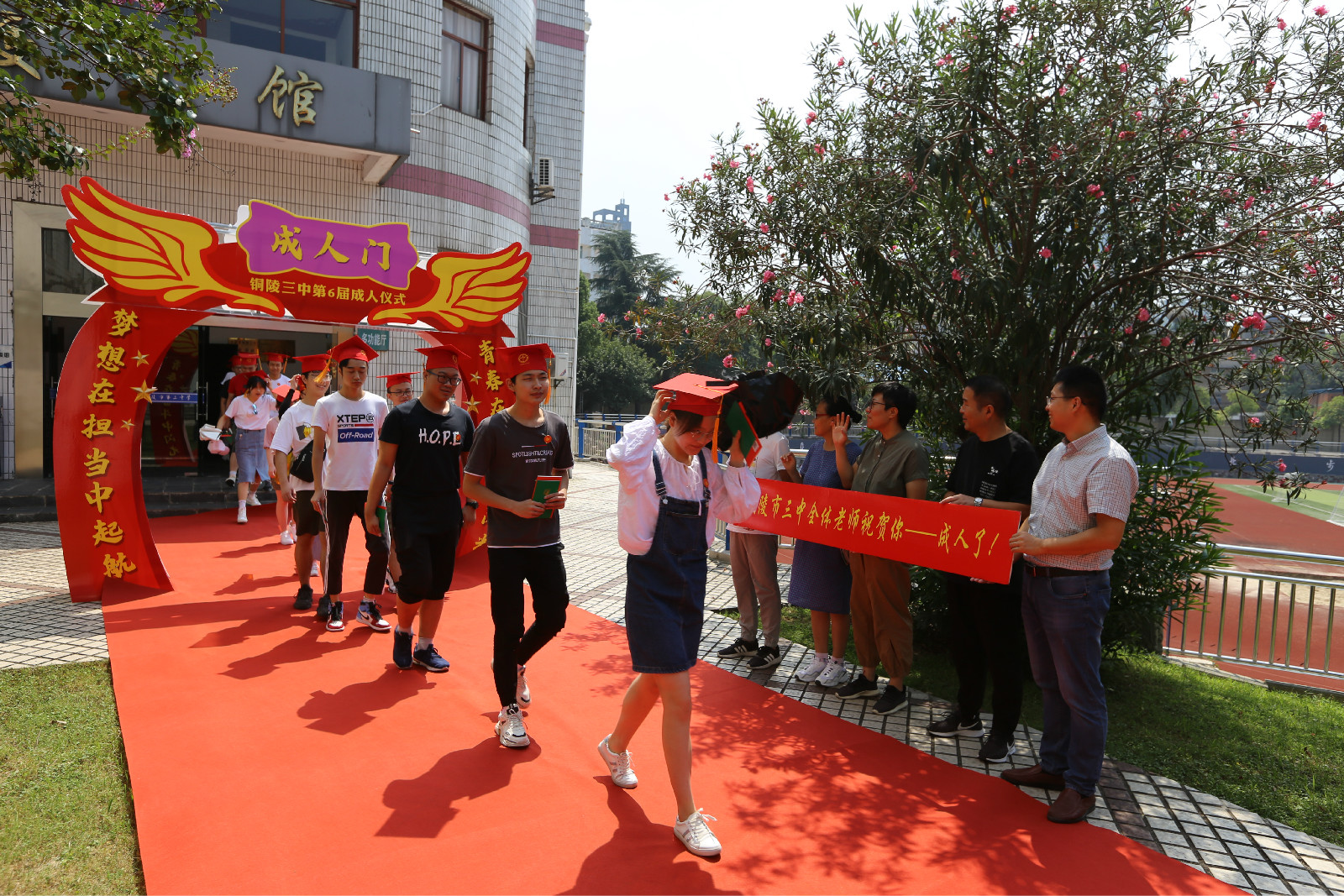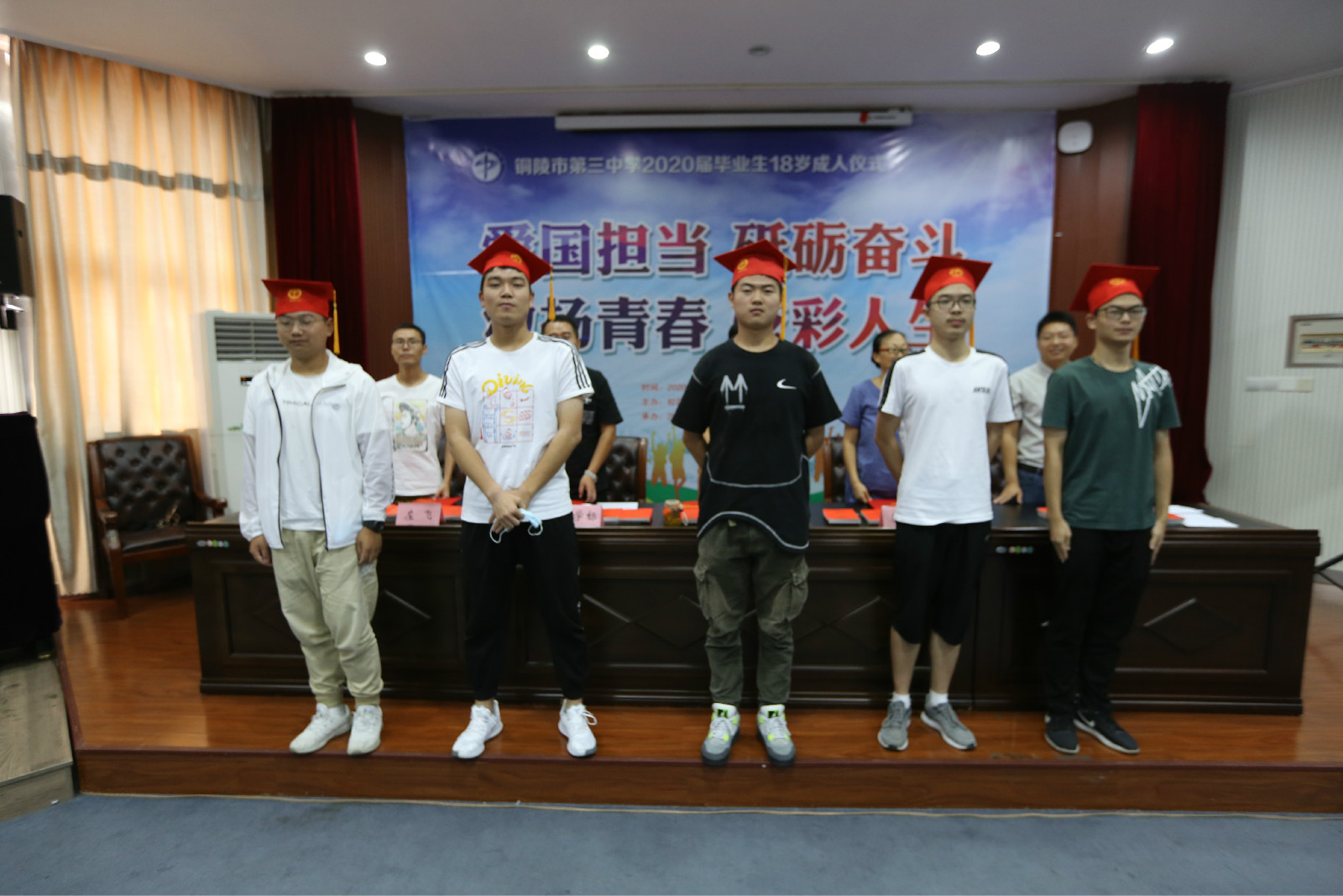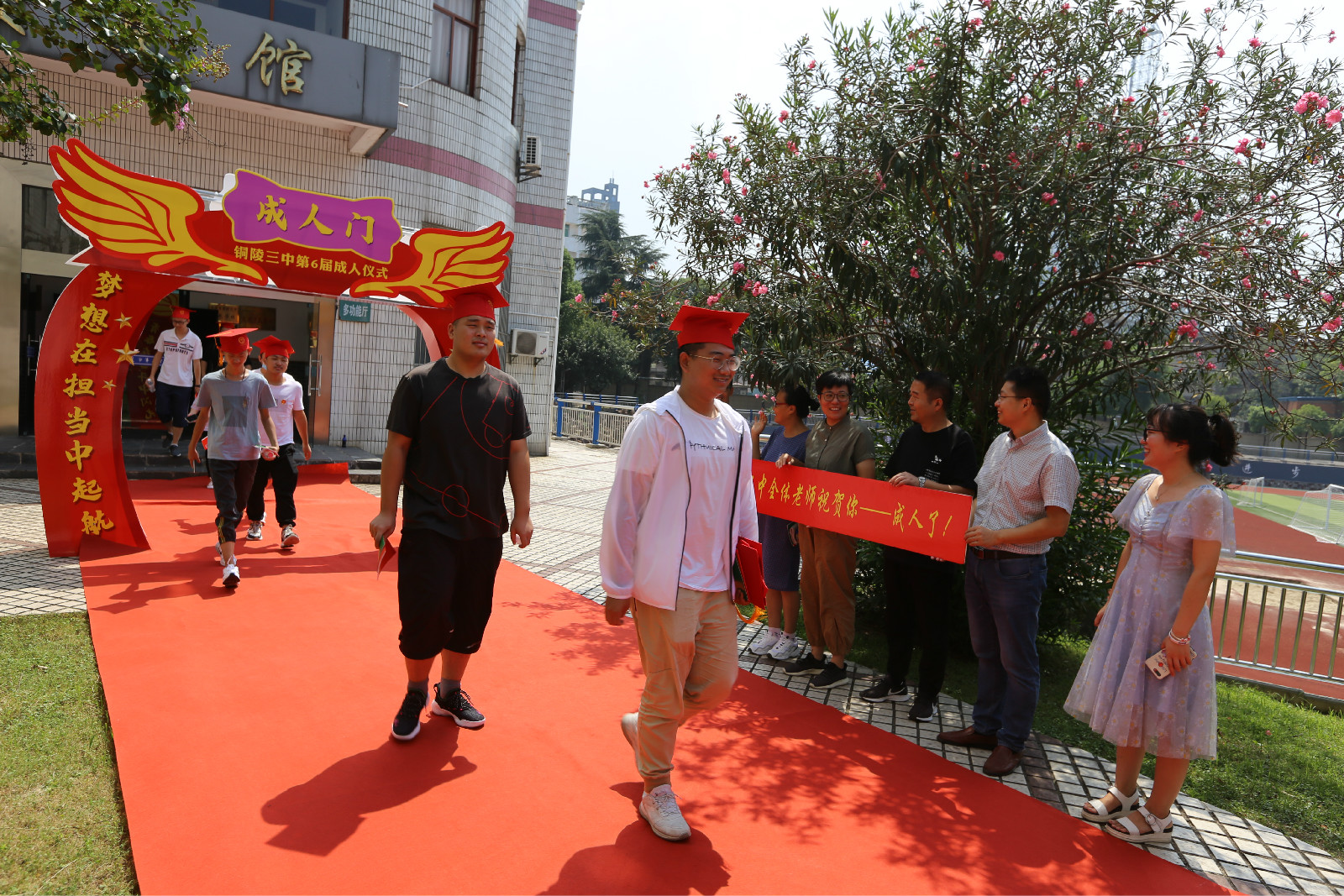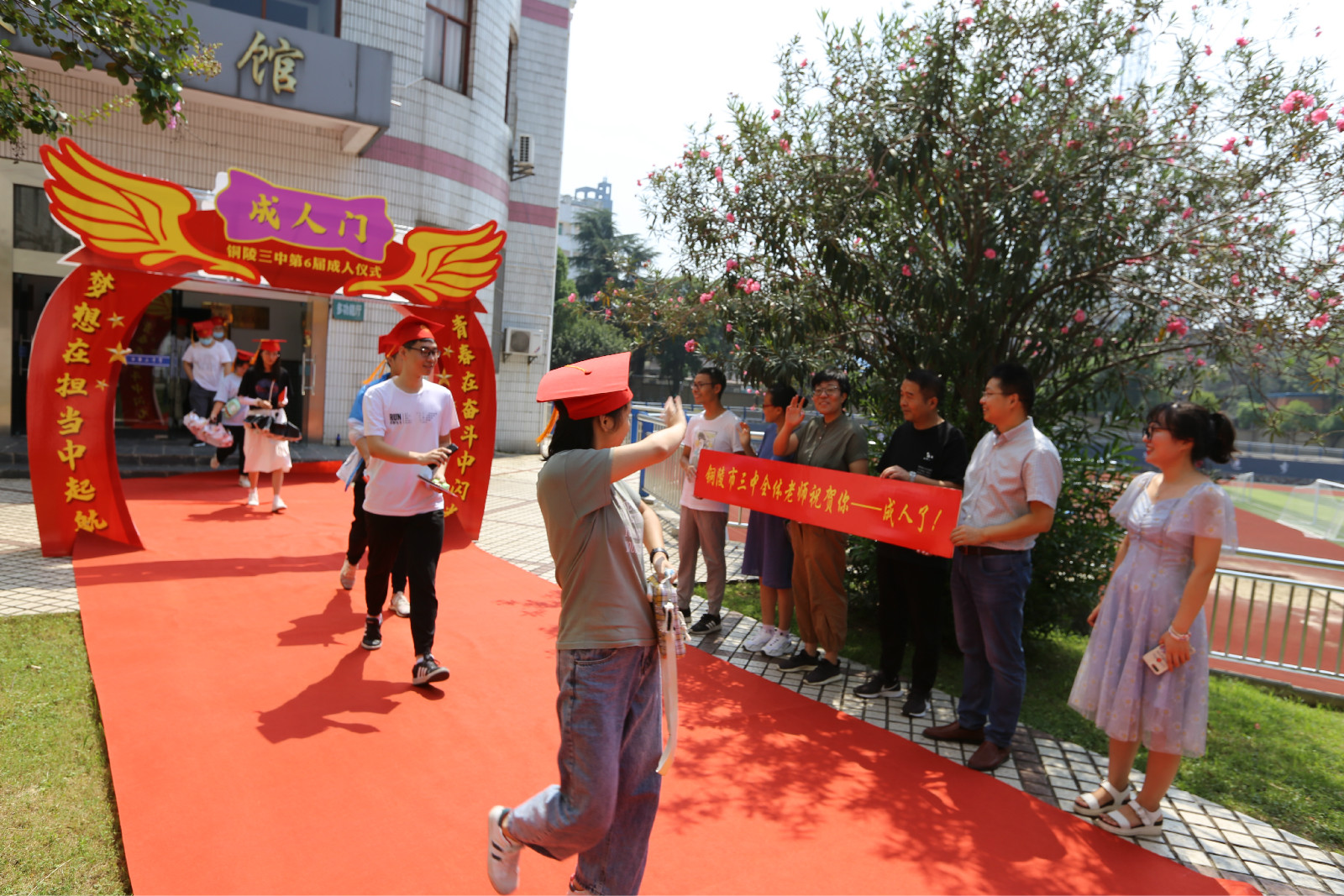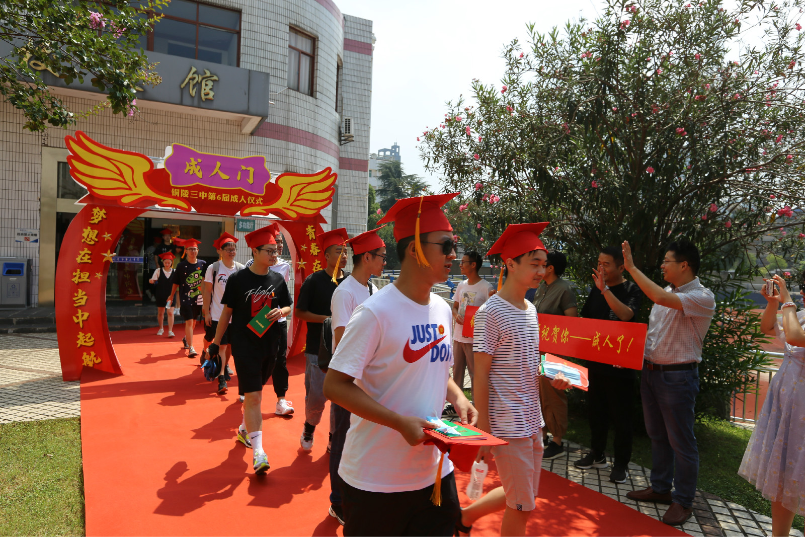 老师们为学生代表佩戴成人纪念章和18岁成人帽。