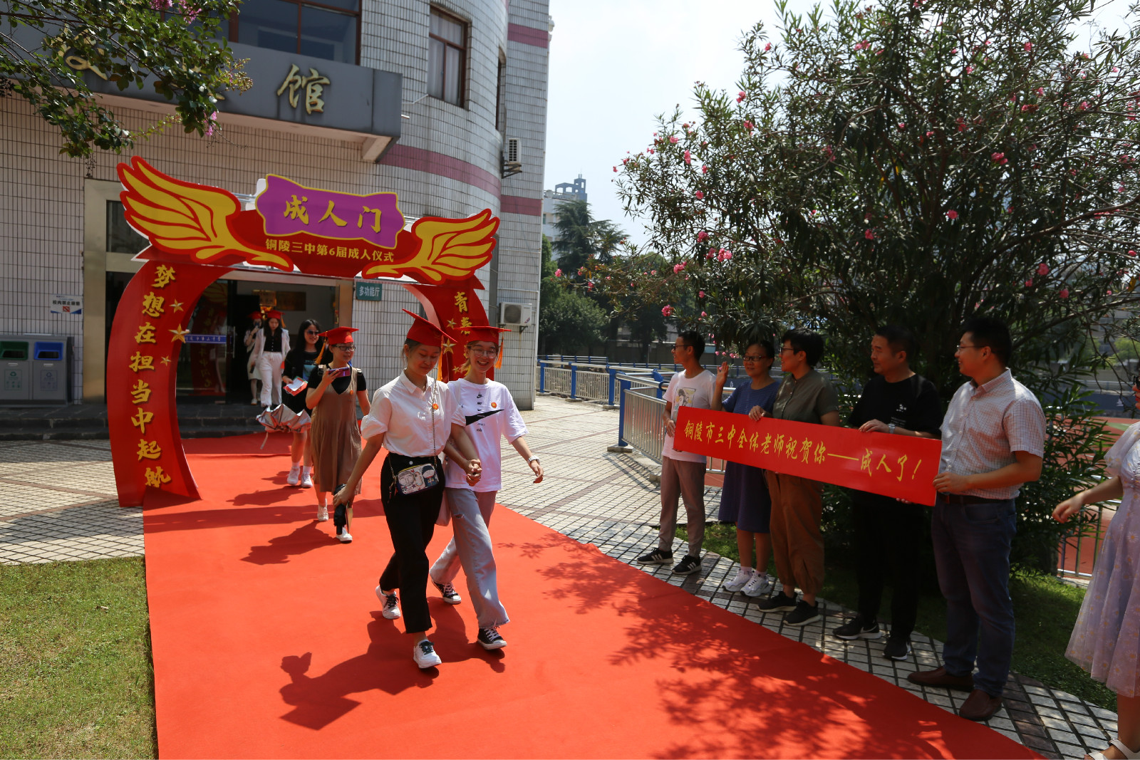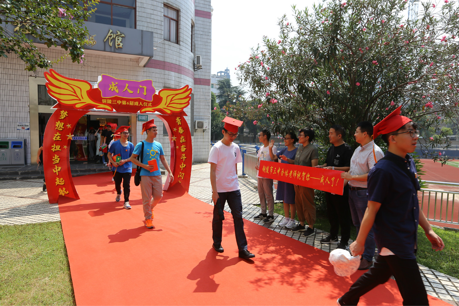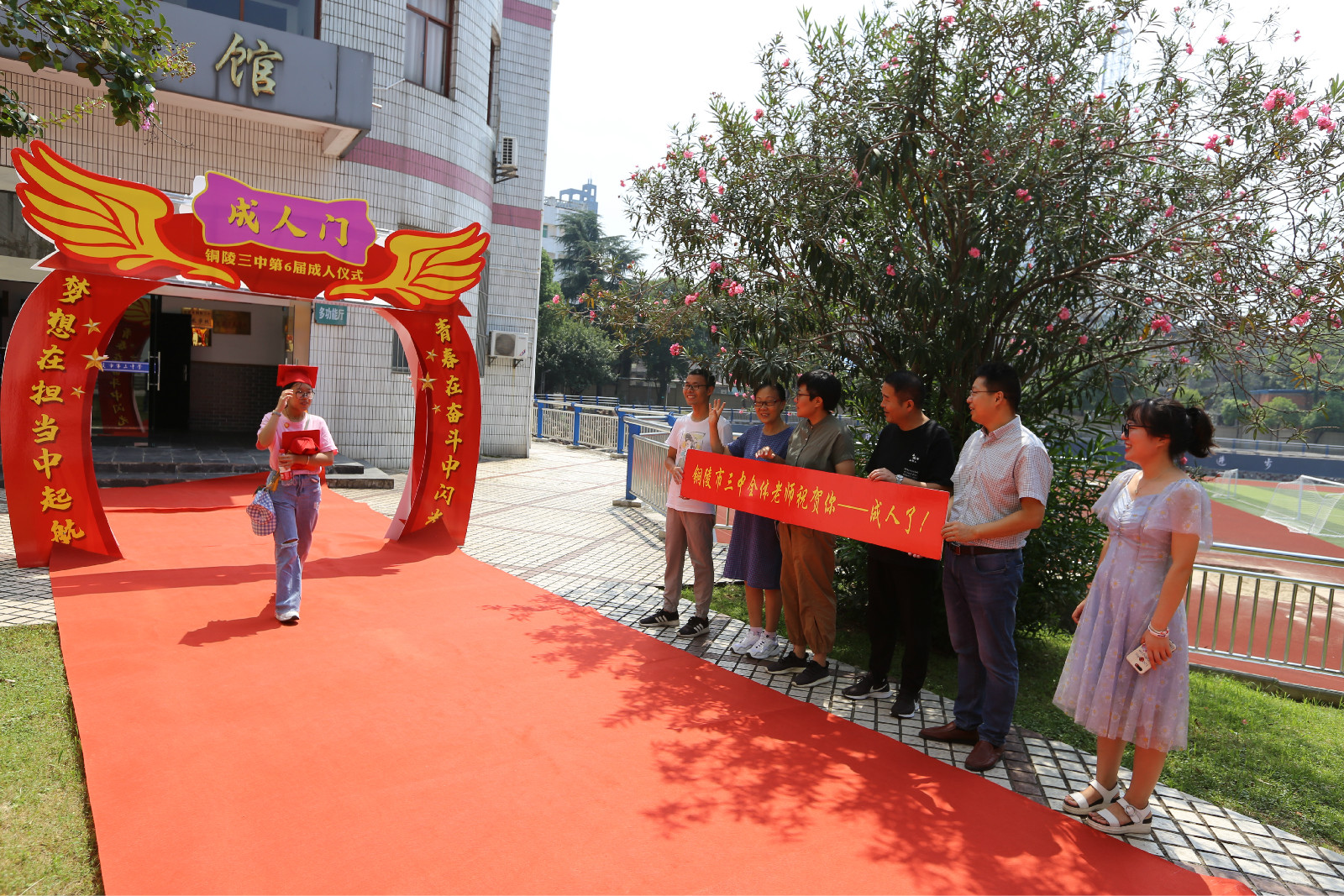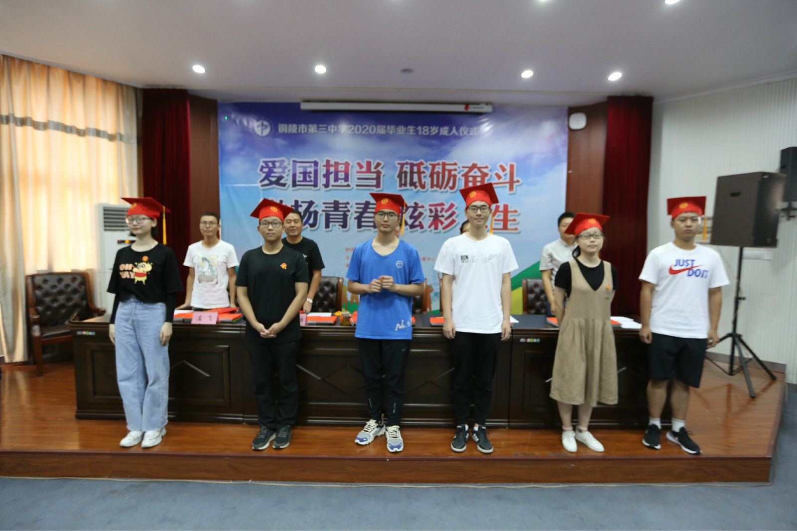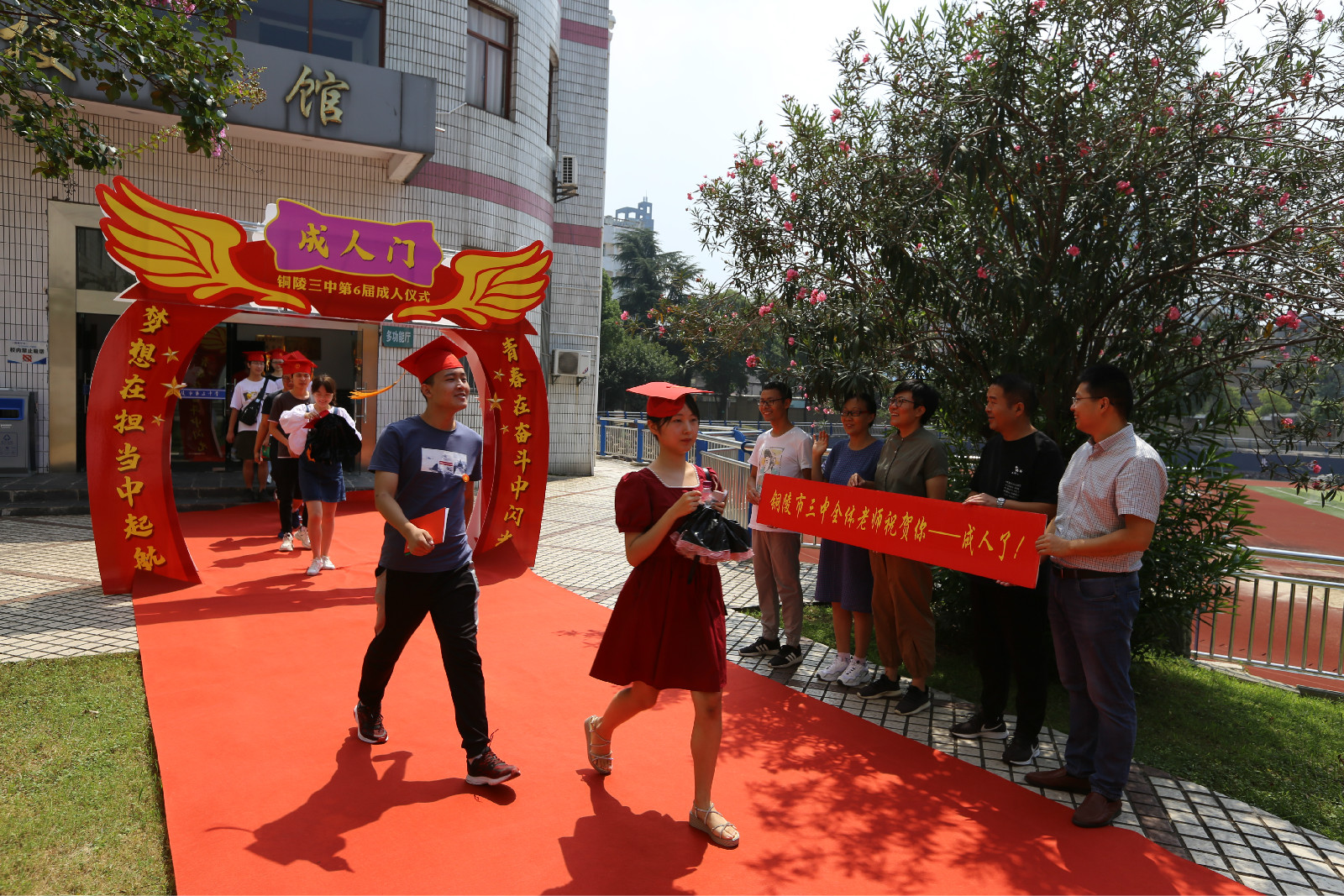 老师们为学生代表佩戴成人纪念章和18岁成人帽。