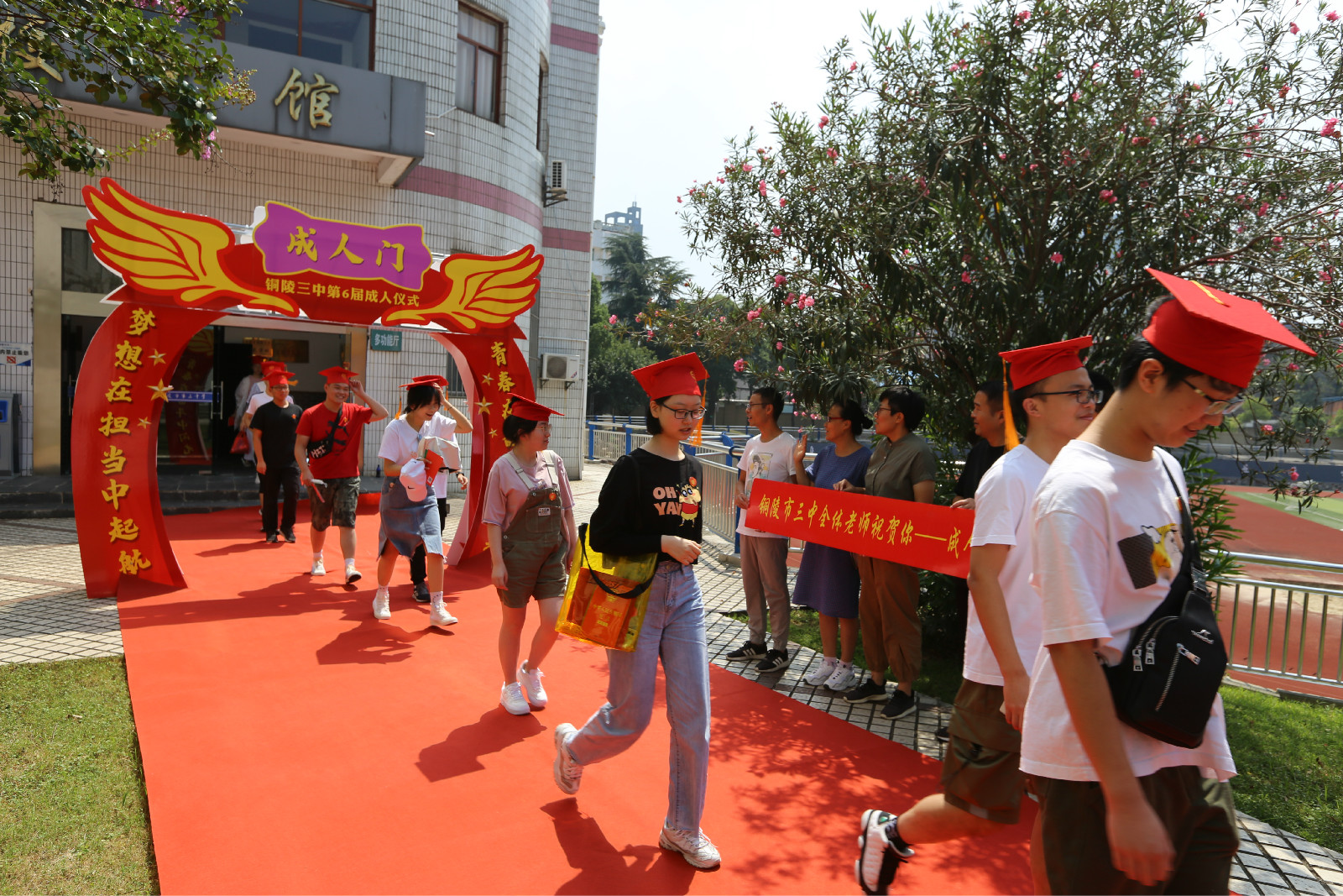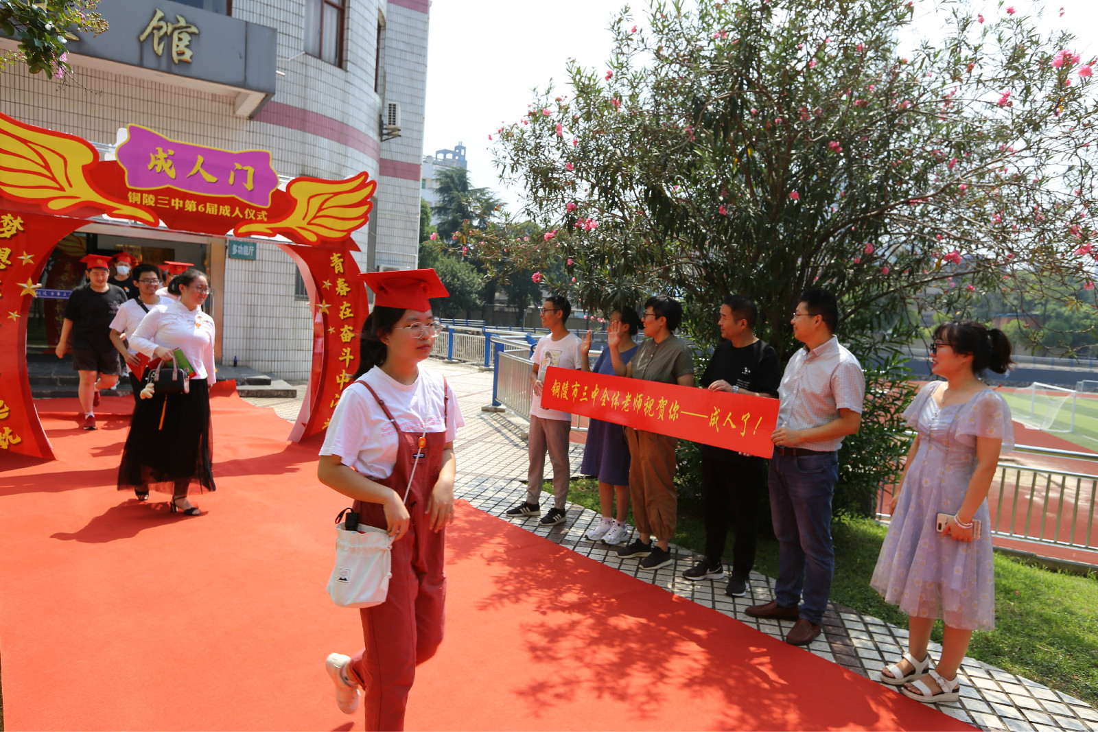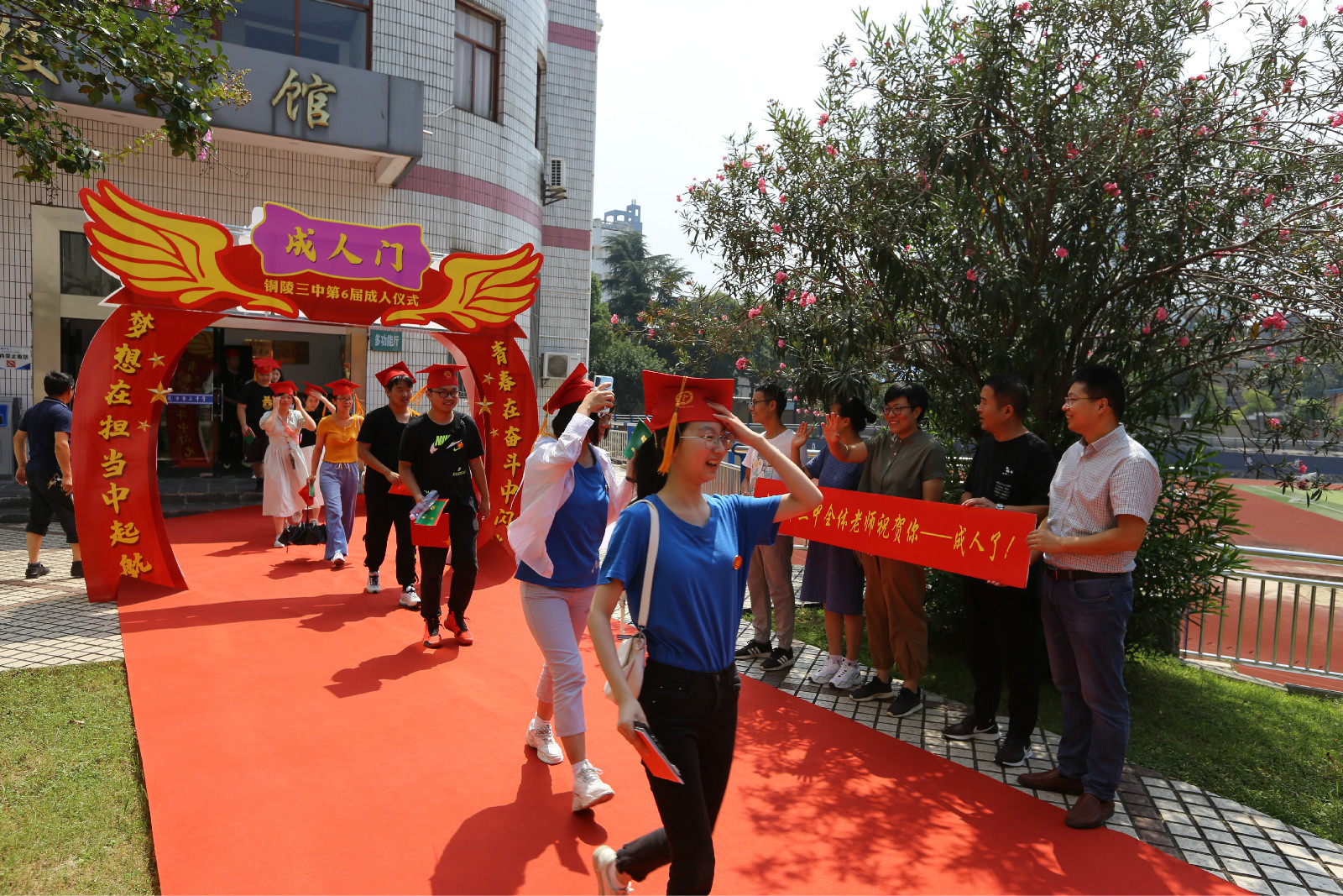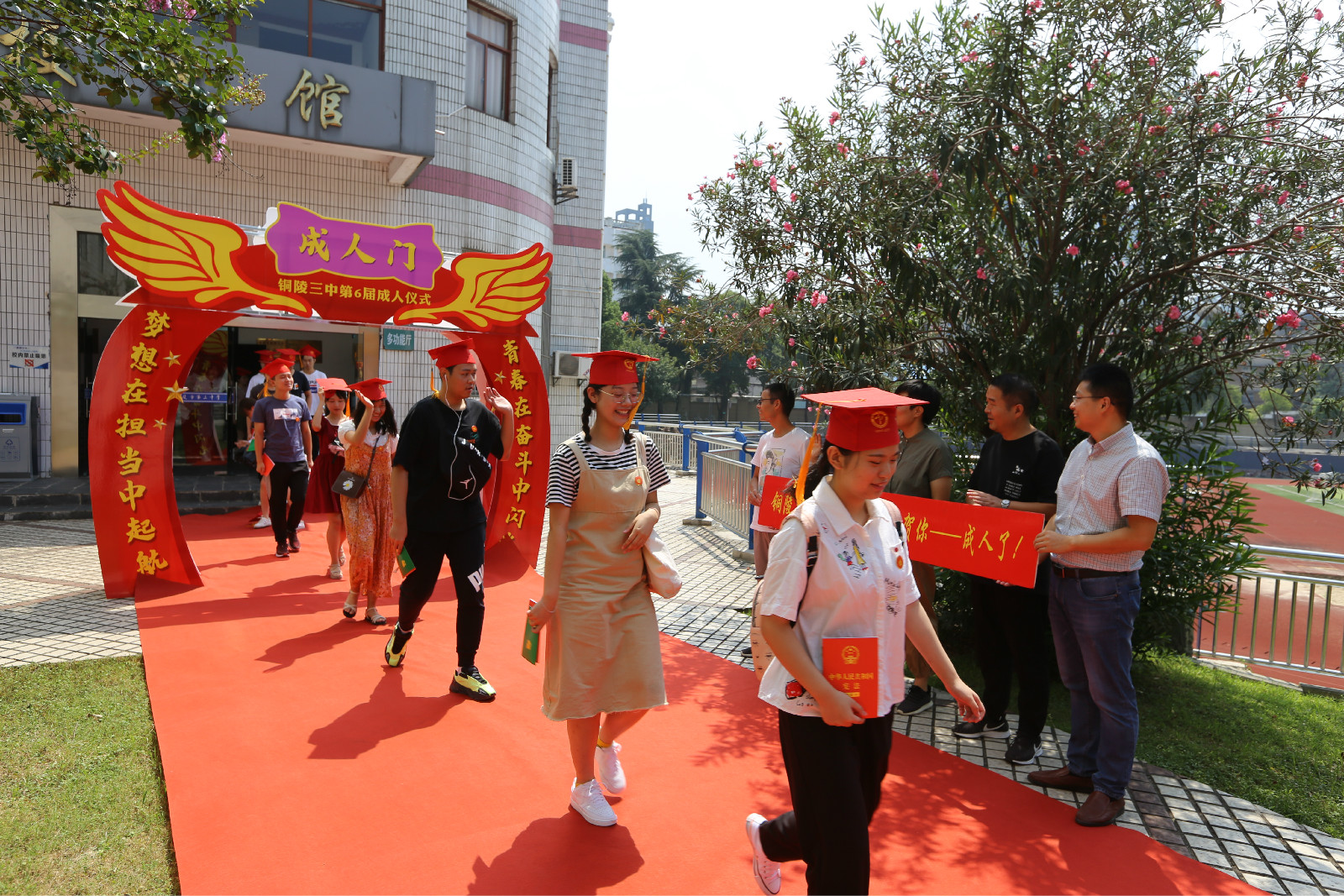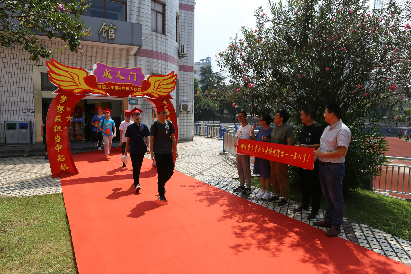 老师们为学生代表佩戴成人纪念章和18岁成人帽。