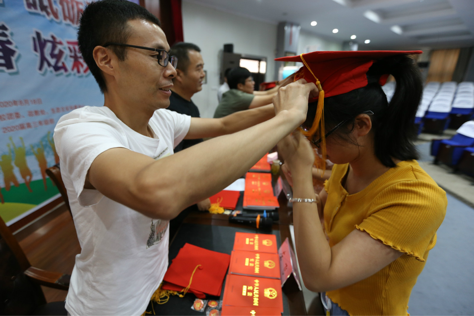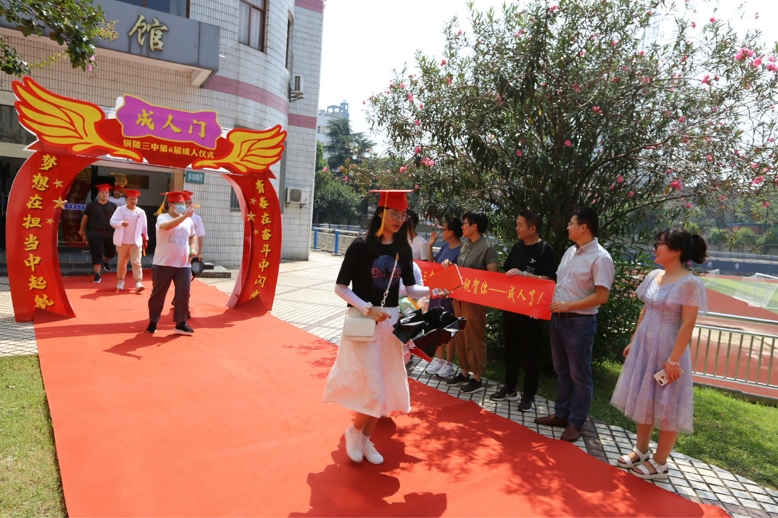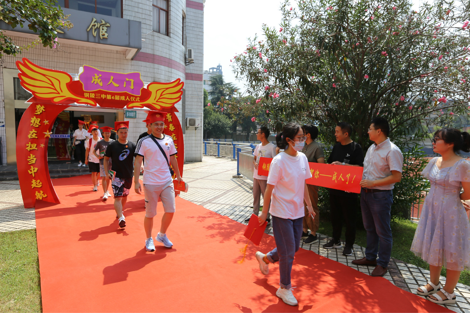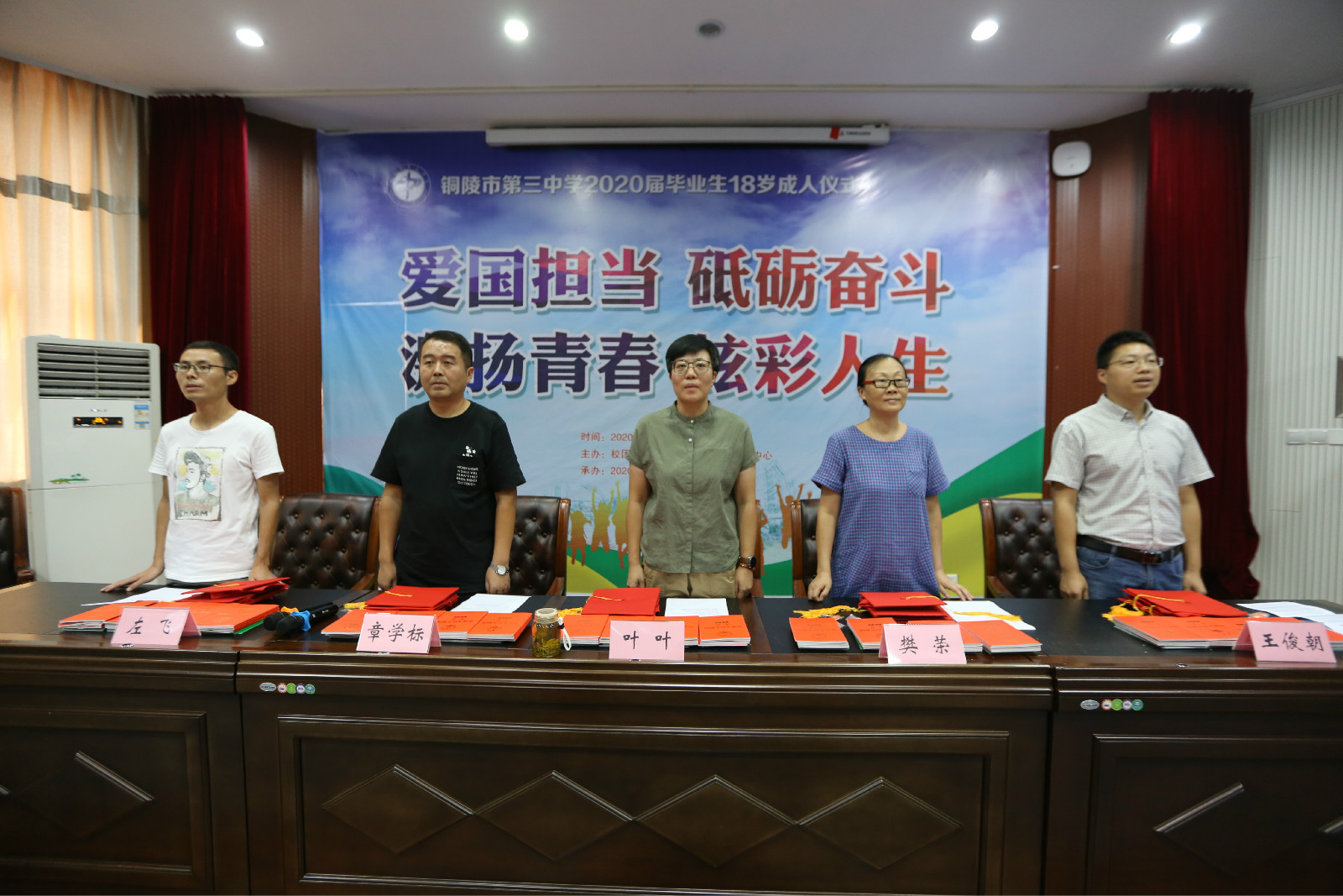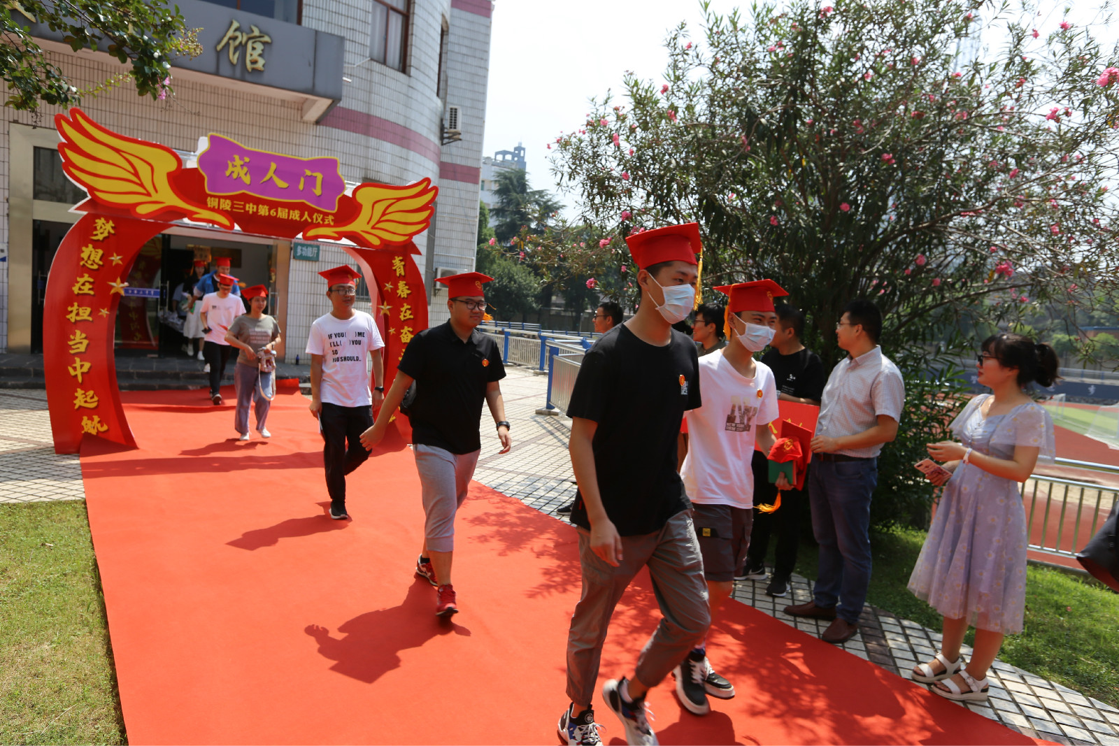 老师们为学生代表佩戴成人纪念章和18岁成人帽。