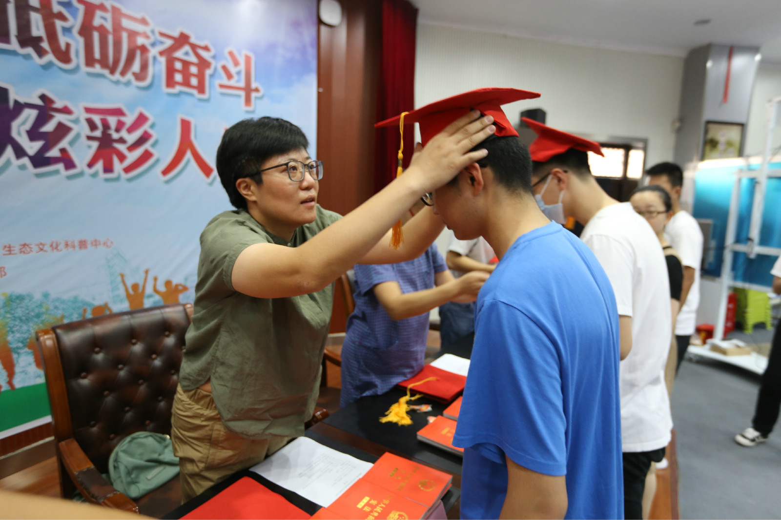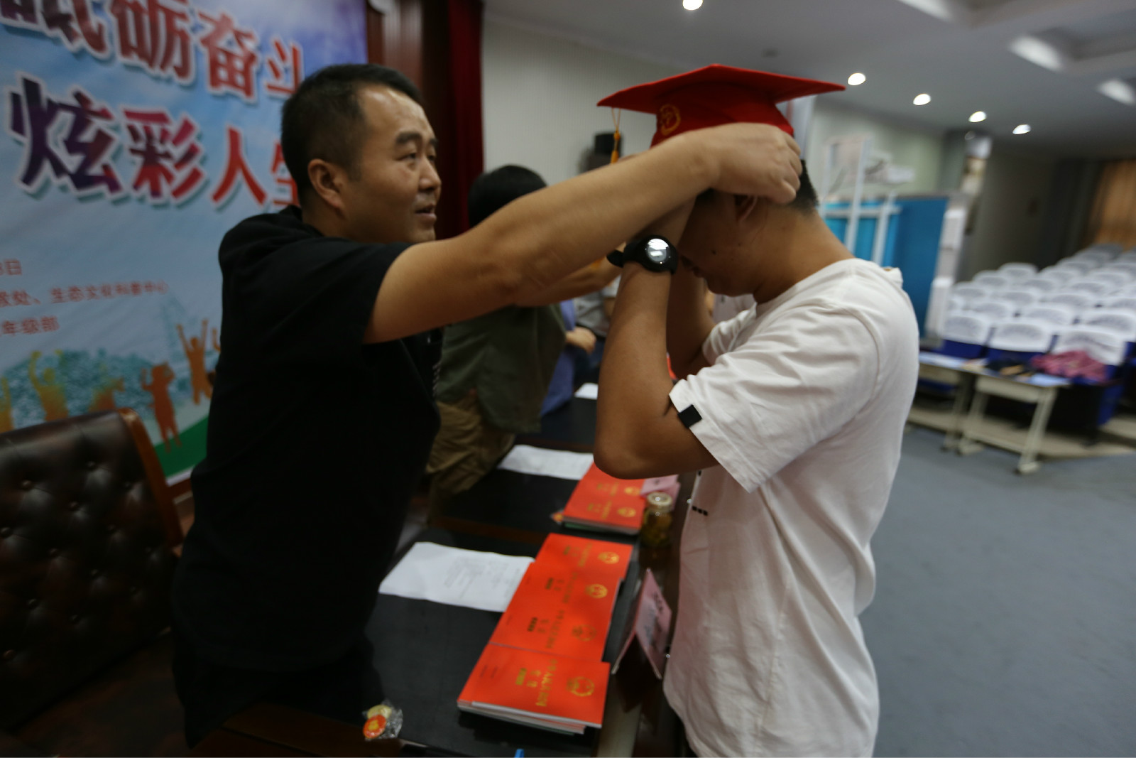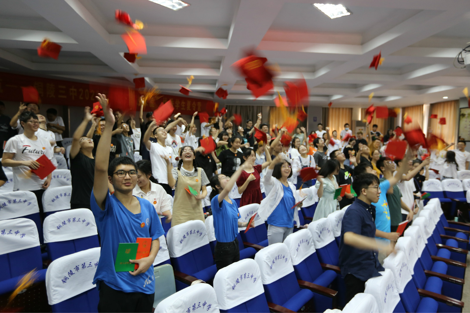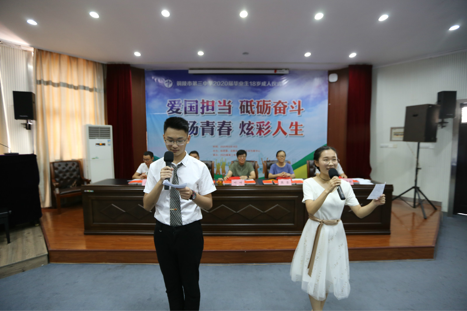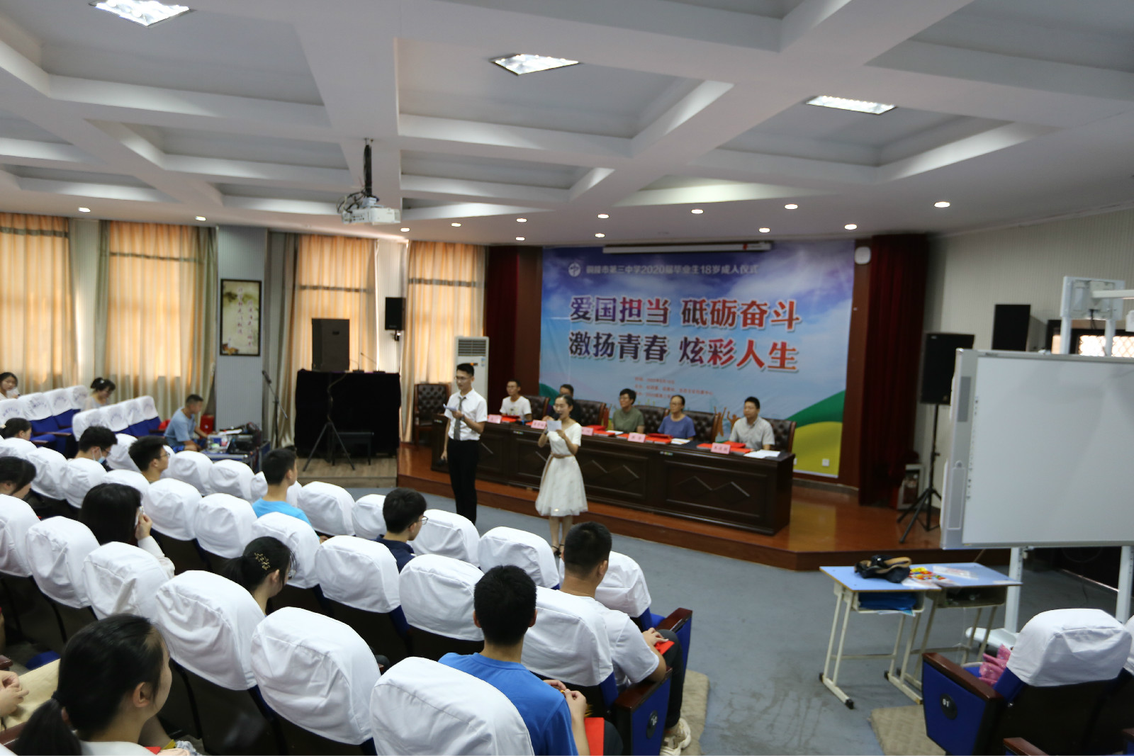 老师们为学生代表佩戴成人纪念章和18岁成人帽。