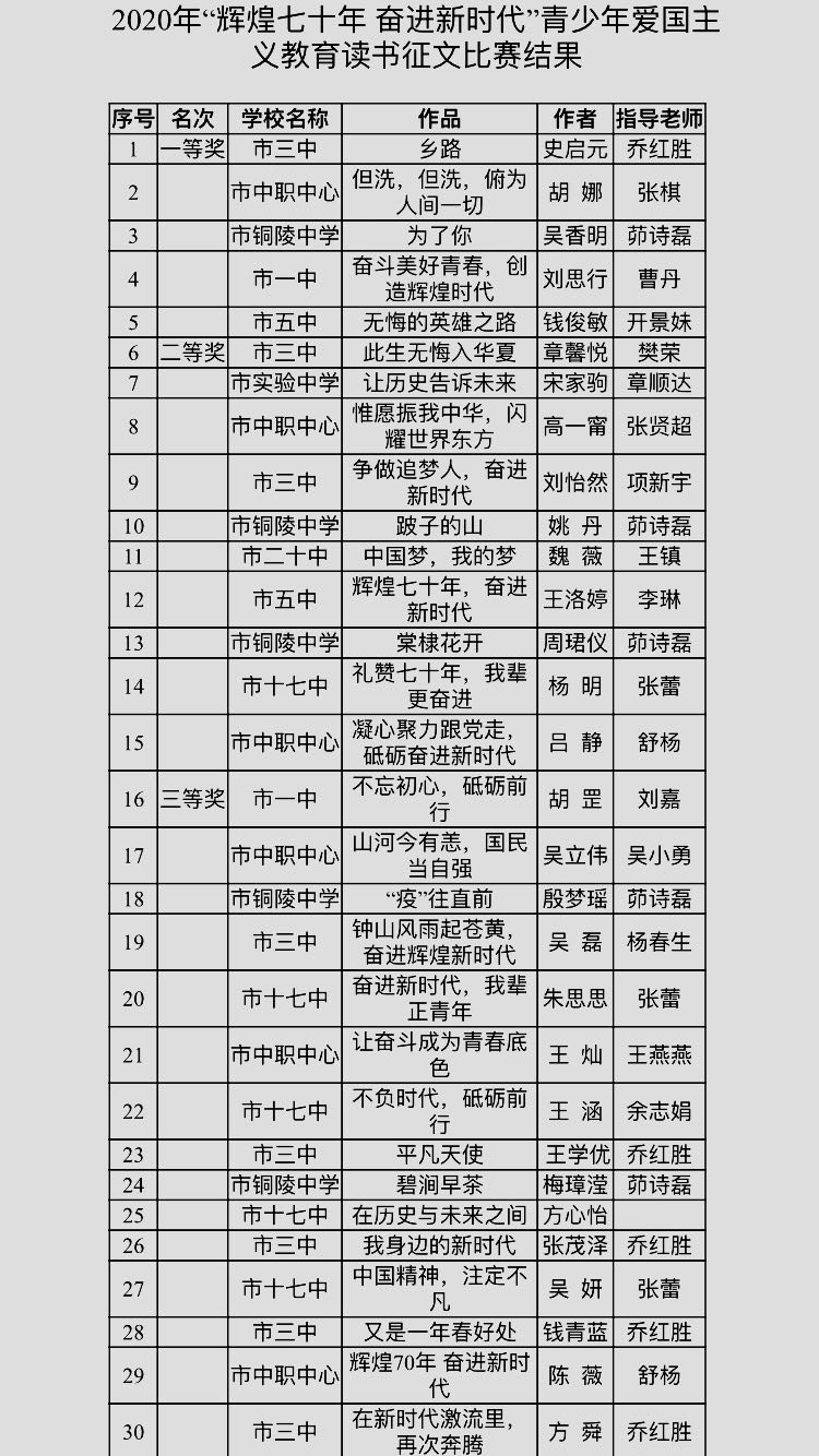 “辉煌七十年 奋进新时代” 青少年爱国主义读书教育活动 征文比赛结果