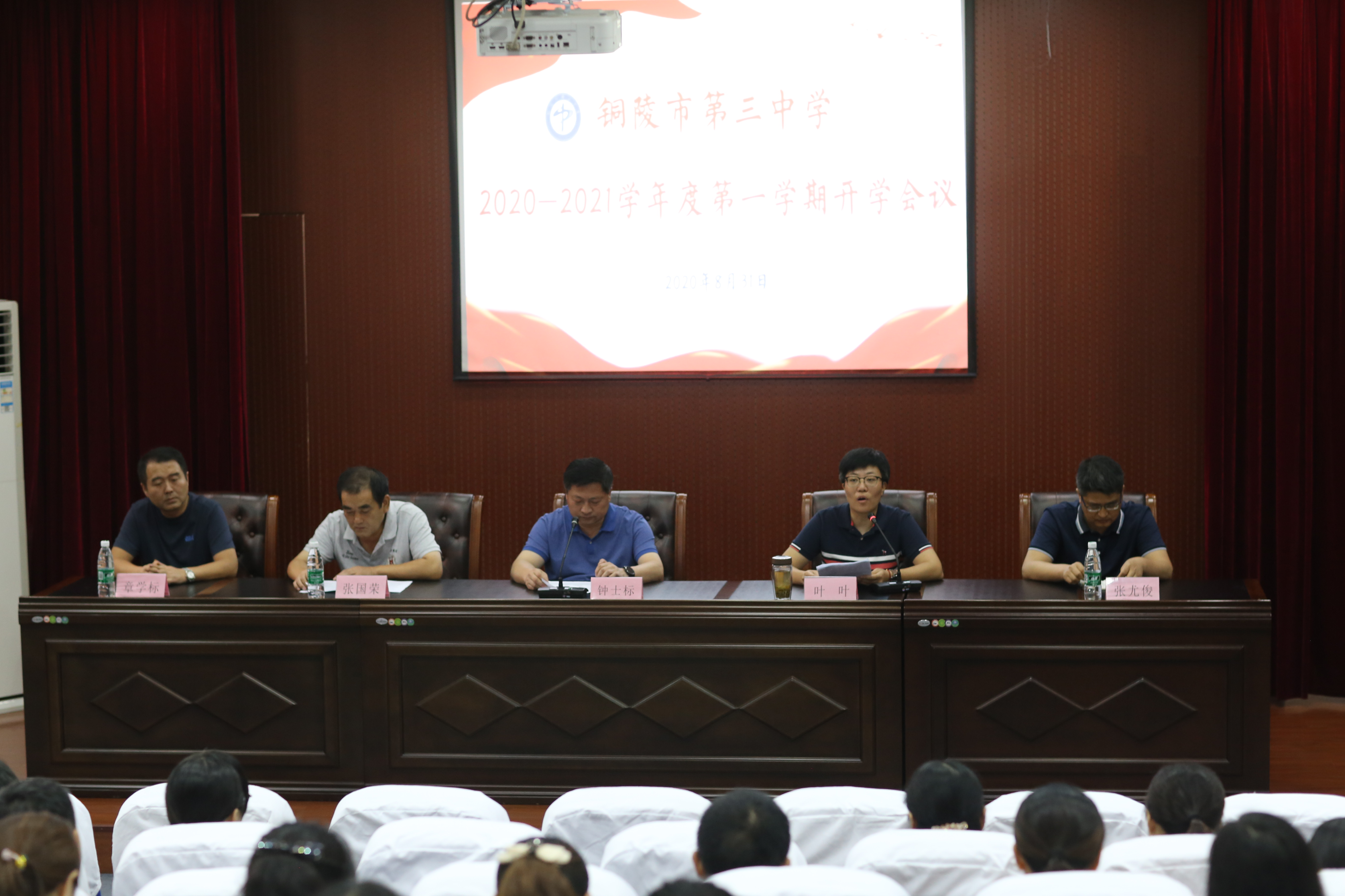 本校讯 31日上午,铜陵市第三中学2020——2021学年度第一学期开学工作会议在多功能厅召开,校党委书记、校长钟士标,校党委委员、党委副书记叶叶,校党委委员、副校长张国荣,校党委委员、副校长张尤俊,校党委委员、政教处主任章学标等领导出席会议,全体教职员工200多人参加会议,会议由校党委书记、校长钟士标同志主持。