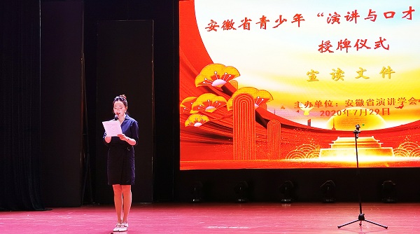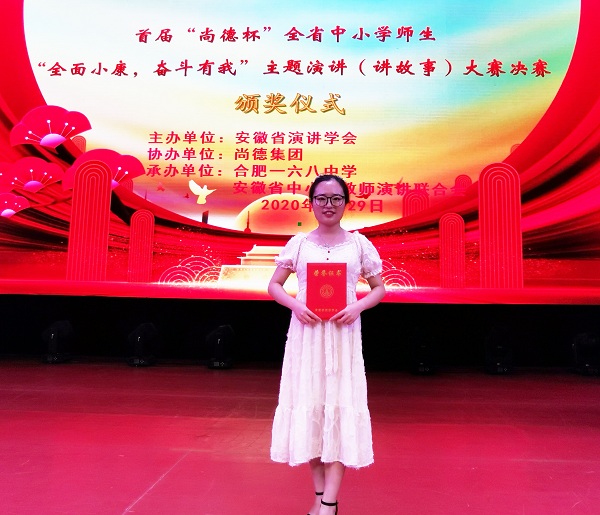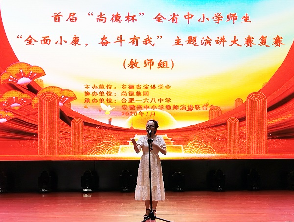 2020年7月29日,市三中受邀参加安徽省青少年演讲与口才实训基地授牌仪式暨首届“尚德杯”“全面小康,奋斗有我”主题演讲大赛。参加此次活动的有省委宣传部副部长李兵,省妇联副主席张若平,省总工会党组成员、省总工会经费审查委员会主任曾传发等领导以及来自全省各中小学的104名师生选手、指导老师、邀请嘉宾和观众等约400人。市三中校办公室秘书孙娟代表学校参加了实训基地授牌仪式,团委丁睿老师参加教师组“全面小康 奋斗有我”主题演讲大赛。丁睿老师情绪饱满、仪态端庄、形神俱佳,思路清晰,内涵丰富,结合生活实际,深刻阐述主题,表达切身感受,具有强烈的感染力和说服力,最终在36名教师选手中取得排名12的好成绩,荣获教师组三等奖。