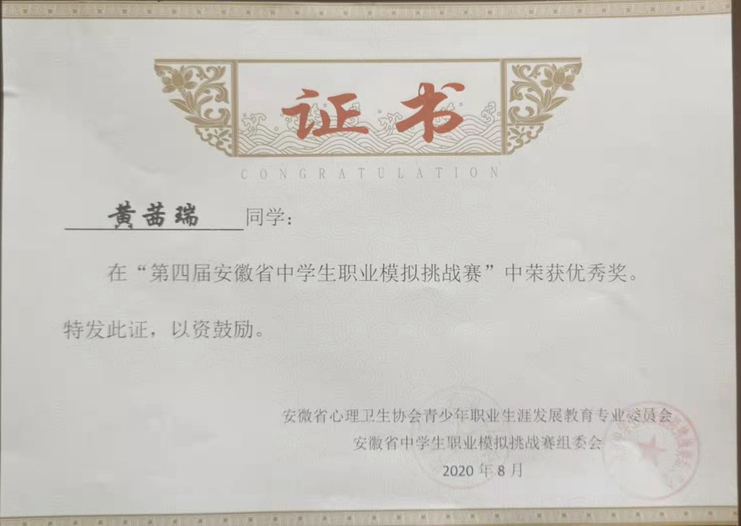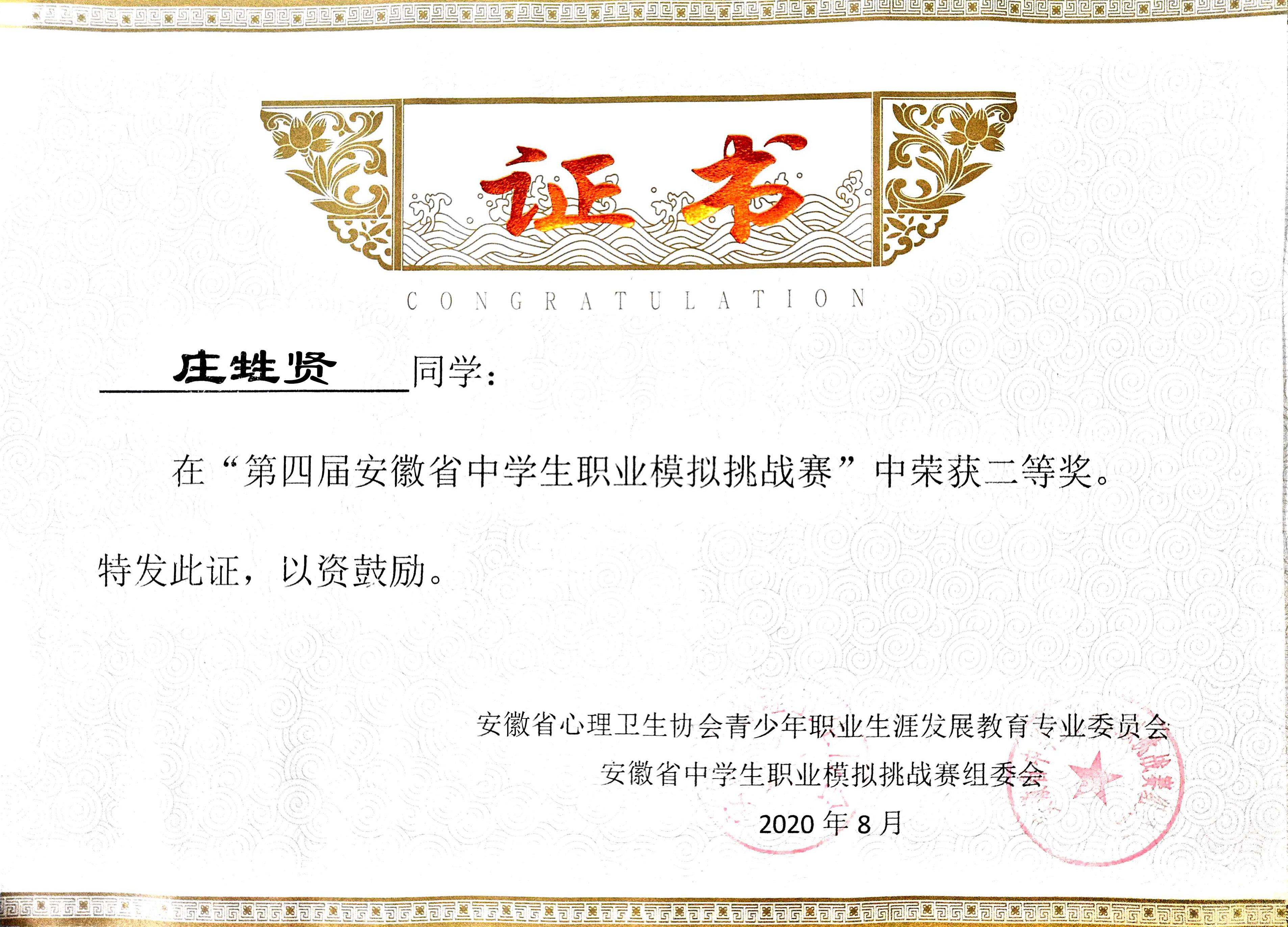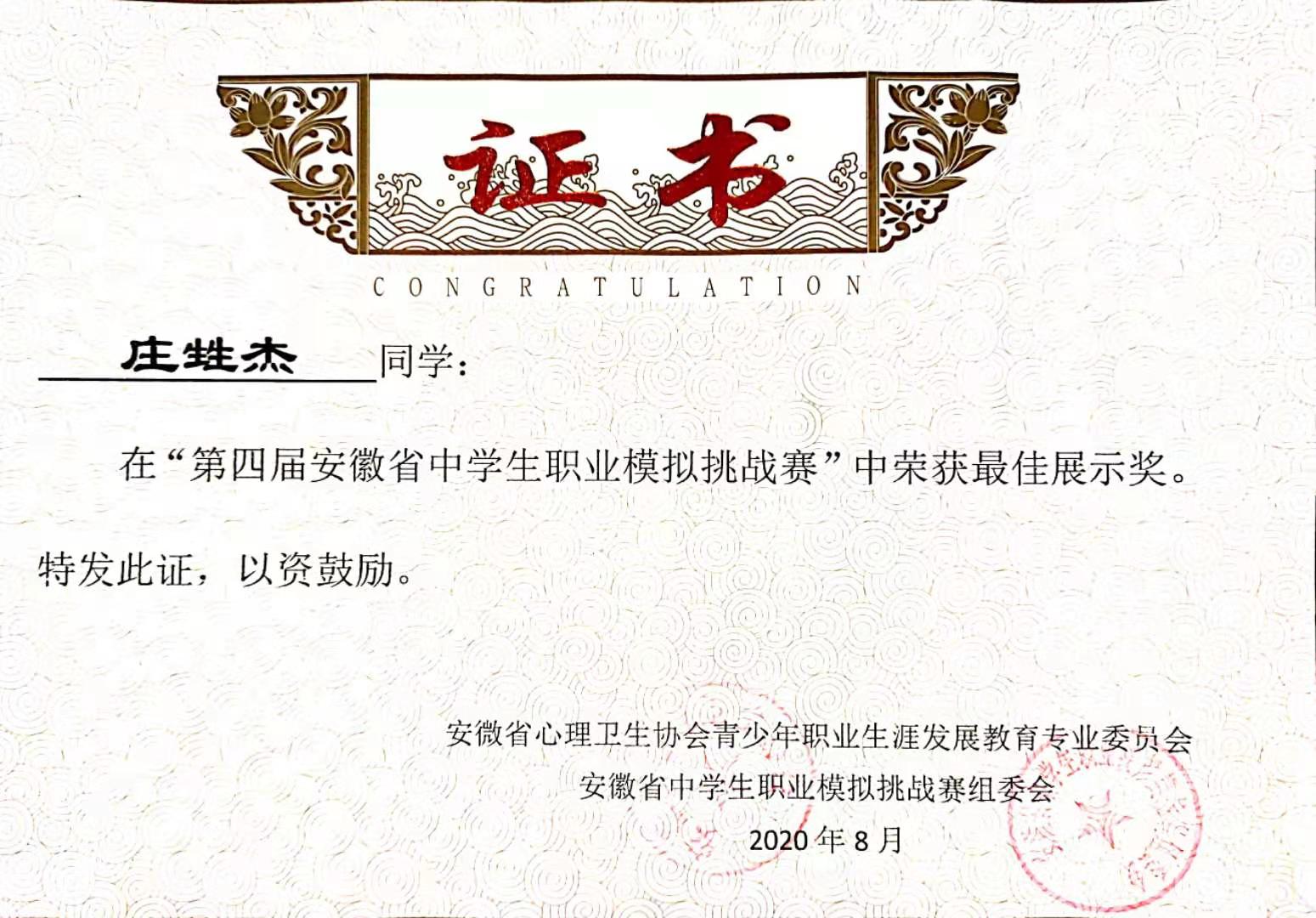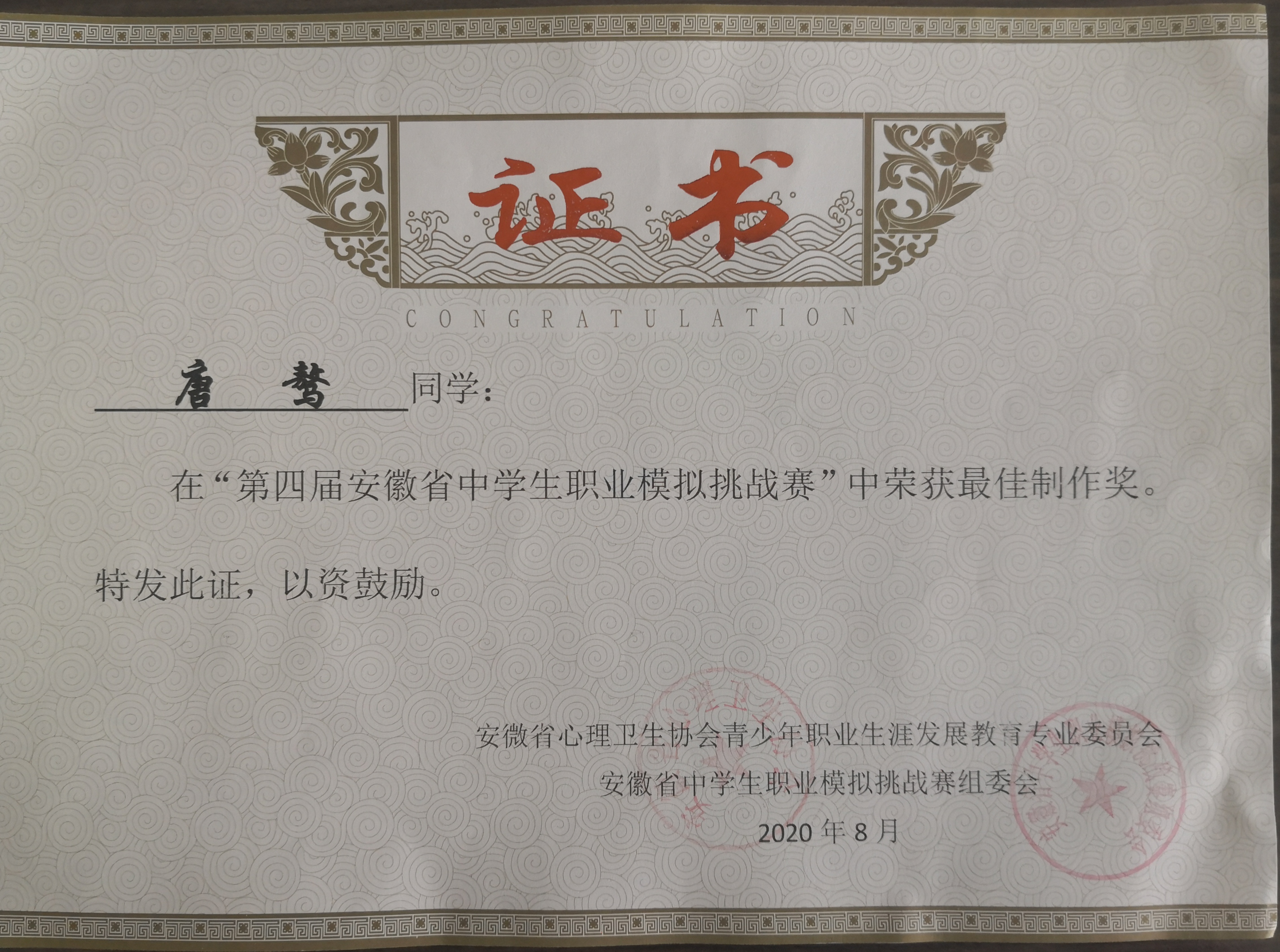 近日,在第四届安徽省中学生职业模拟挑战赛中,经过省内180名选手的激烈竞争,我校5名选手进入全省决赛。其中唐骜、俞越两位同学获得省团体一等奖,庄甡贤、庄甡杰两位同学获得省团体二等奖,唐骜同学获得个人最佳制作奖,庄甡杰同学获得个人最佳展示奖,黄茜瑞同学获得省优秀奖。我校也被评为“优秀组织奖”。