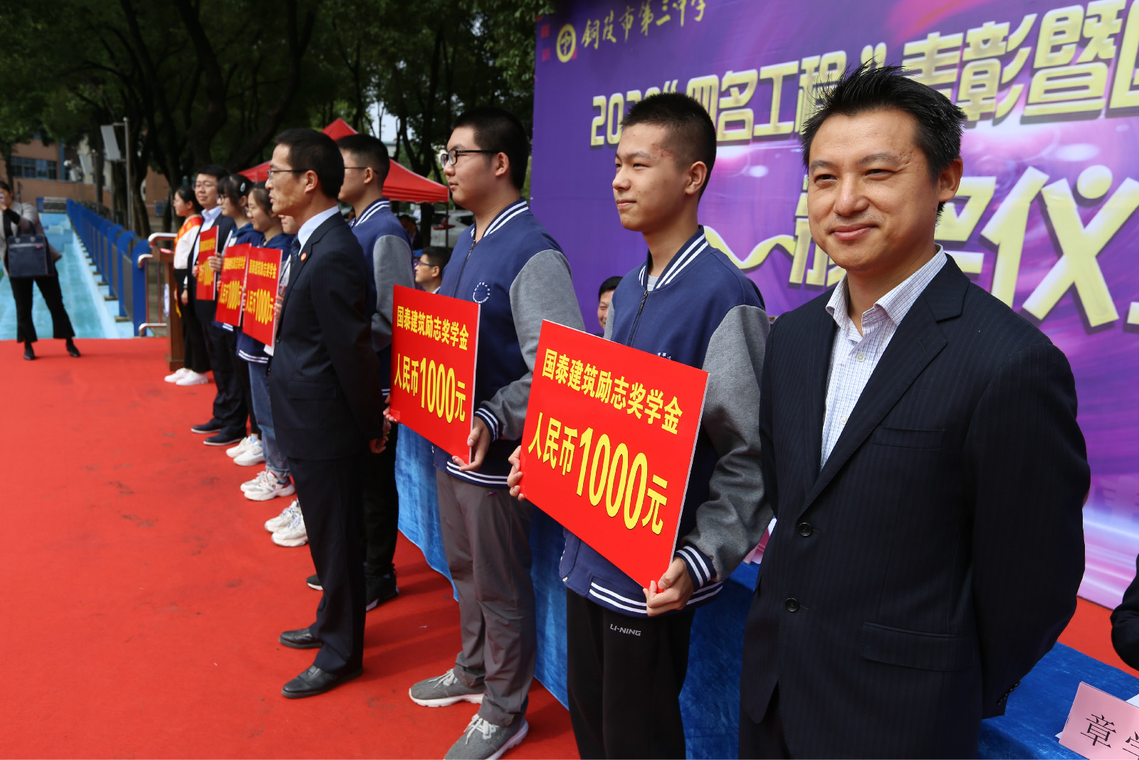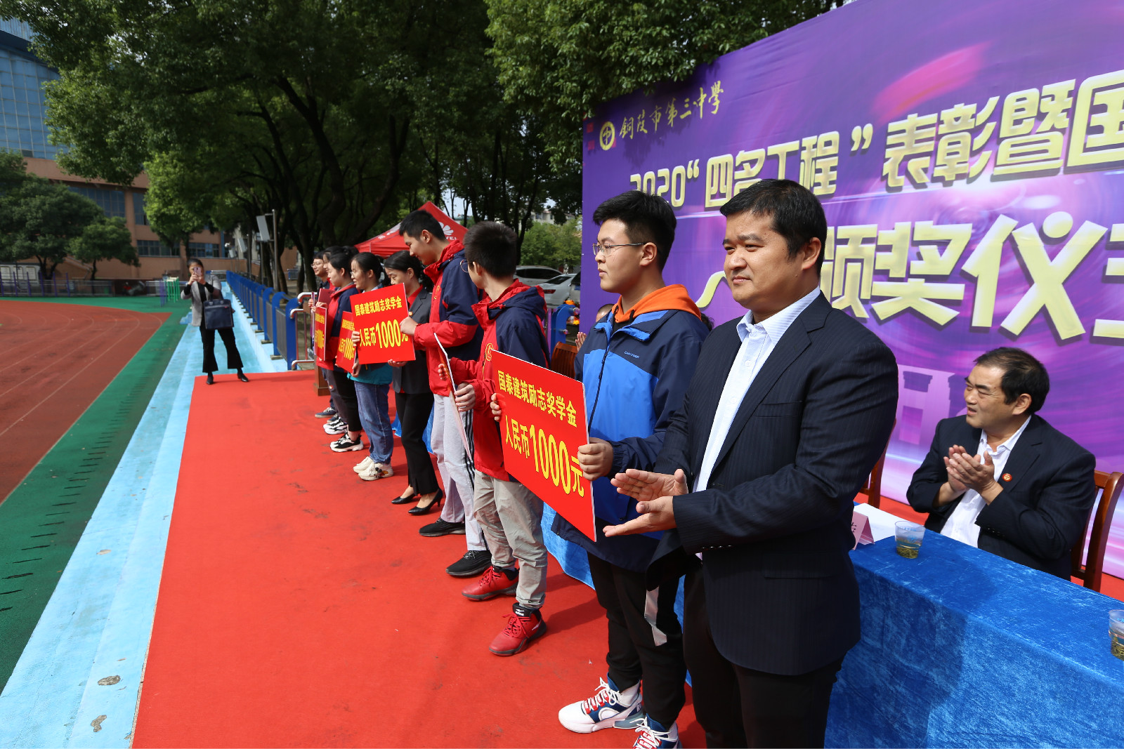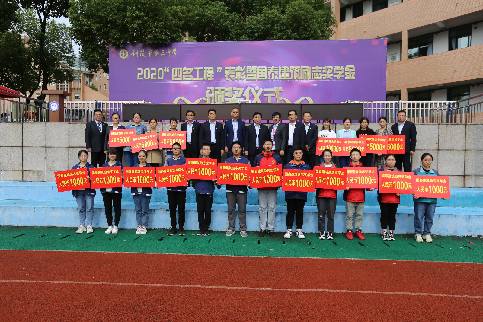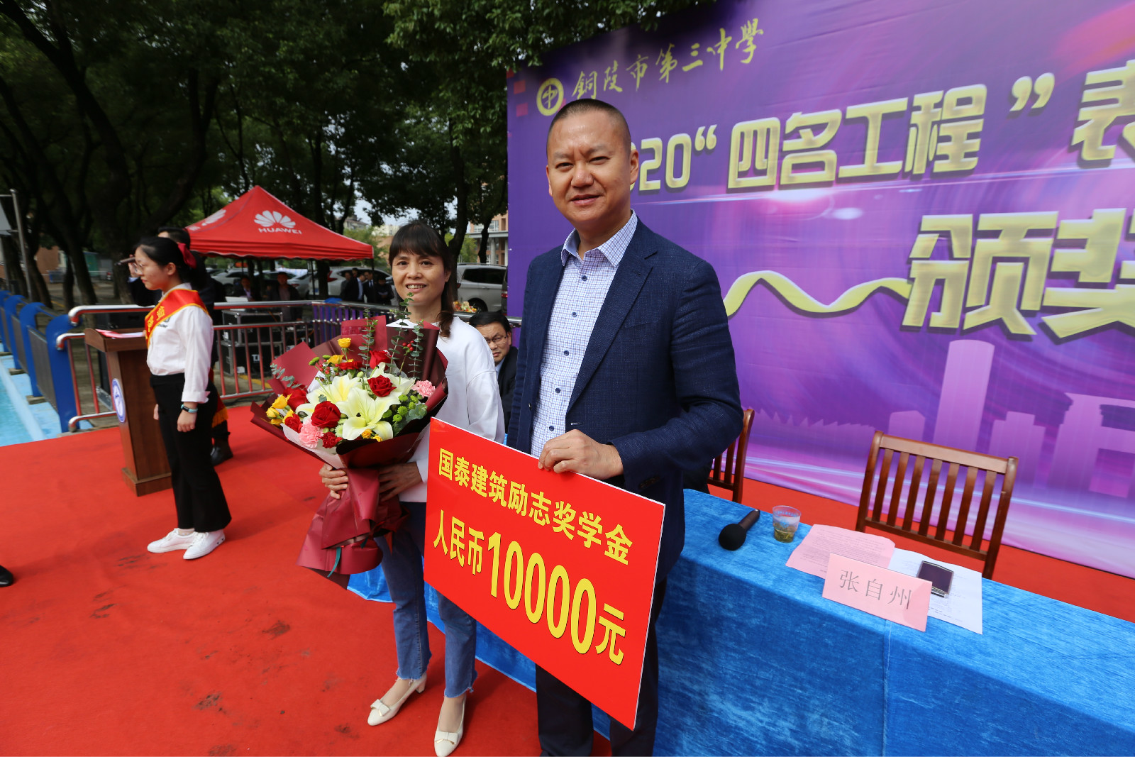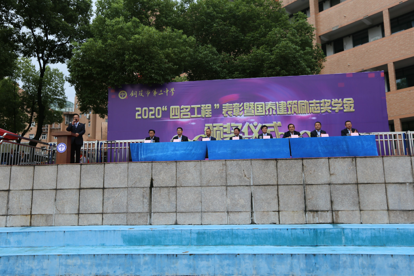 本校讯 9月23日上午,铜陵三中2020年“四名工程”表彰暨国泰建筑集团励志奖学金颁奖仪式在学校操场举行,校党委书记、校长钟士标,安徽国泰建筑集团董事长张自州先生,校党委副书记叶叶,校党委委员、副校长张国荣,校党委委员、副校长张尤俊,校党委委员、政教处主任章学标和全体师生及部分学生家长出席颁奖仪式,活动由梁波主任主持。