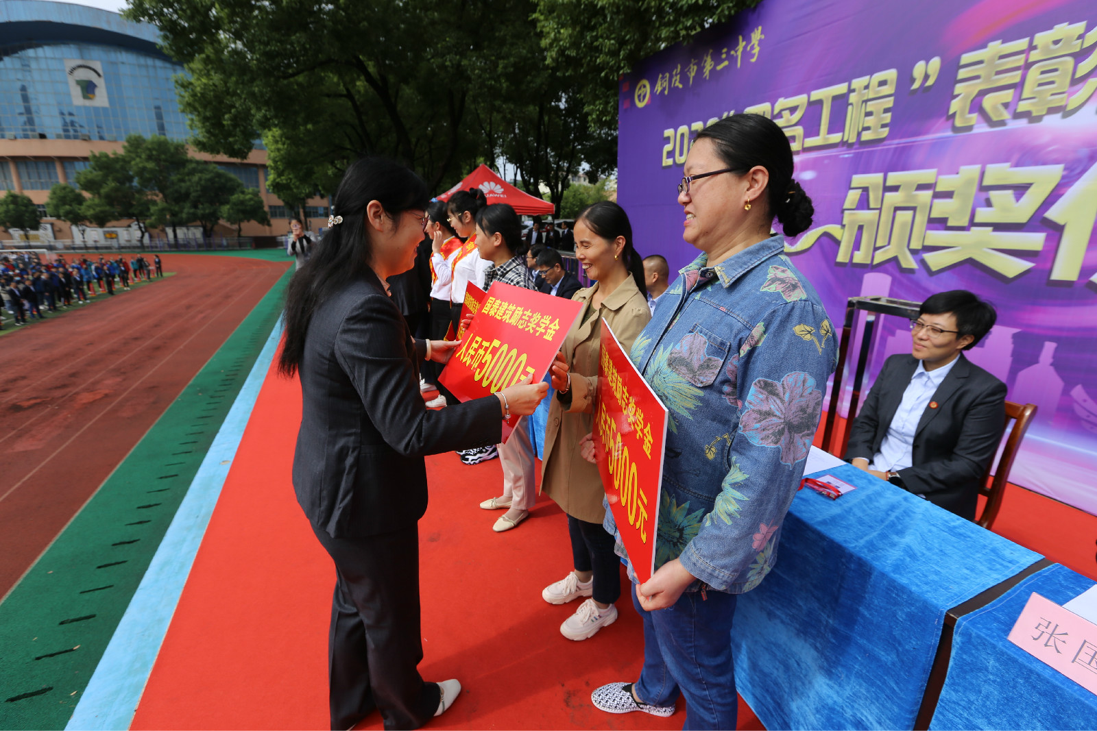 近年来,在市委、市政府和市教体局的坚强领导下,校领导班子团结带领全体三中师生,以“身体健康、心理阳光、学业进步”为办学目标,坚持“立德树人”根本任务,行教育改革,强学校管理,建名师团队,创优质品牌,兴铜都教育。在短短的时间里,创造了一个又一个“三中奇迹”。2018级和2019级学子们再接再厉,不断跨越,颁奖仪式上,共有12名学子获得奖励,他们分别是袁歆苒、朱轶、向亦蕊、姚新博、吕海、朱俊杰、李雪、张子琪、江锦帆、吴磊、唐骜、王安佑。学生代表袁歆苒向提供优秀奖学金的安徽国泰建筑集团董事长张自州先生献花并发表获奖感言。