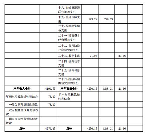 2020 年度财政拨款收入总计 4270.17 万元(含年初财政拨款结转结余),支出总计 4270.17 万元(含年末财政拨款结转和结余)。与 2019 年相比,财政拨款收、支总计各增减少 173.04 万元,下降 3.9%,主要原因:一是进一步压缩经费开支;二是结转结余指标减少导致财政拨款收支减少。