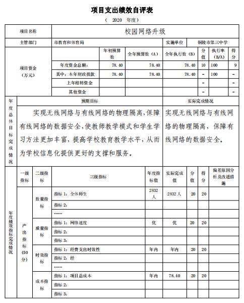 铜陵市第三中学在 2020 年度单位决算中反映“校园网络升级”项目绩效自评结果。“校园网络升级”项目绩效自评综述:根据年初设定的绩效目标,项目绩效自评得分为 98 分。全年预算数为 78.4万元,执行数为 78.4 万元,完成预算的 100.0%。项目绩效 目标完成情况:实现无线网络与有线网络的物理隔离,保障有线网络的数据安全,使教师教学模式和学生学习方法更加丰富,提高学校教育教学水平,从而为学校信息化提供更好的支撑和服务。