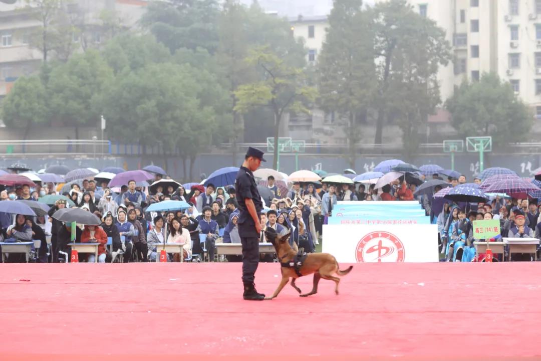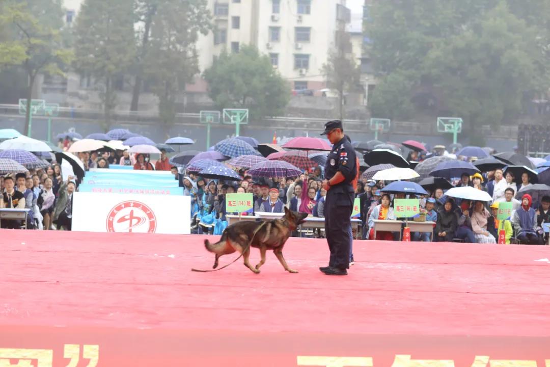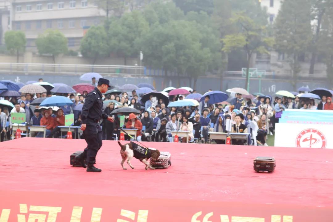 仪式中,铜陵市公安局警犬基地还带来了搜毒犬“泰博”、搜捕犬“玖月”和之前赠予我校的退役警犬追踪犬“莱霆”共同表演了服从命令和搜毒科目。