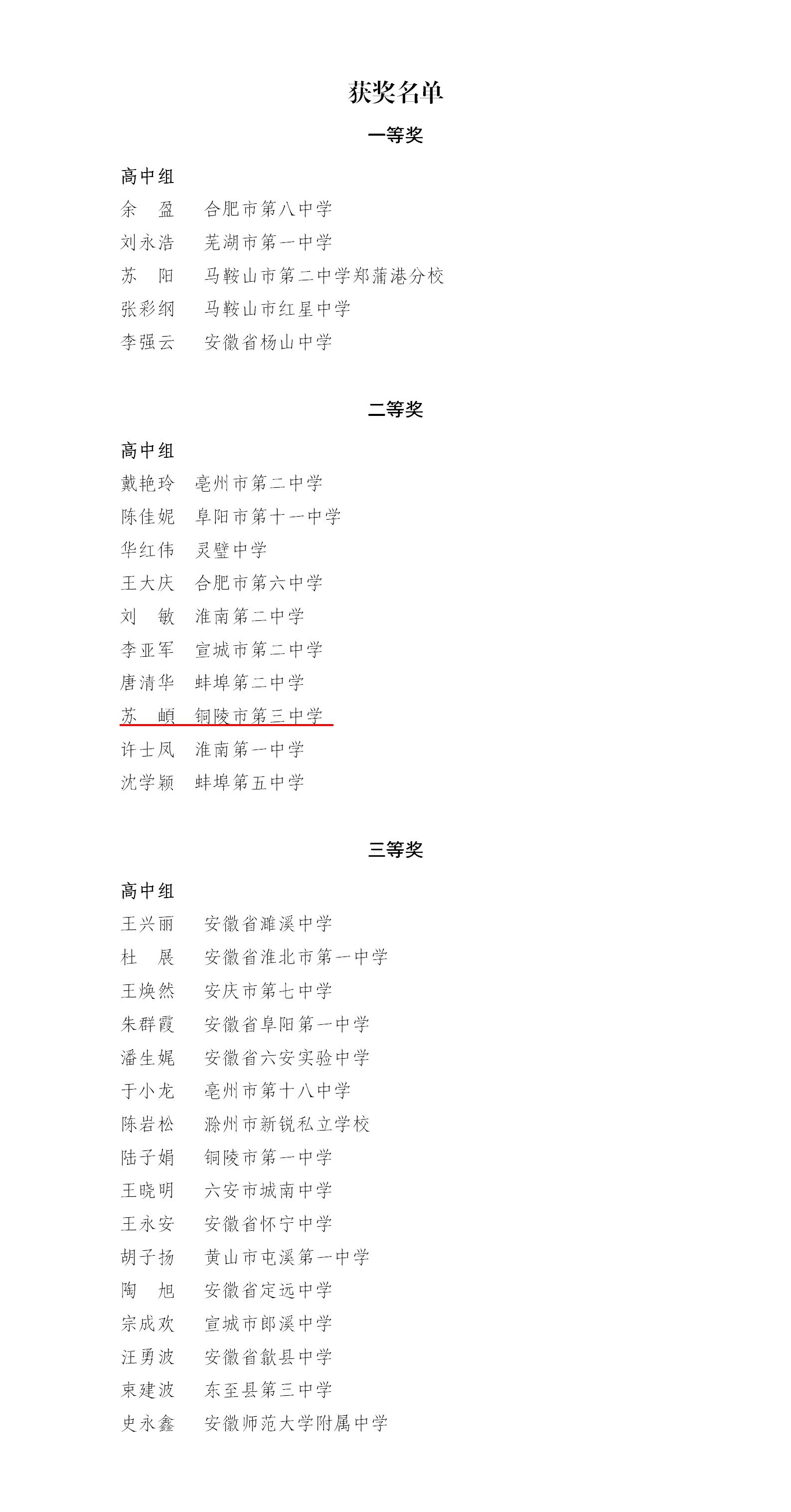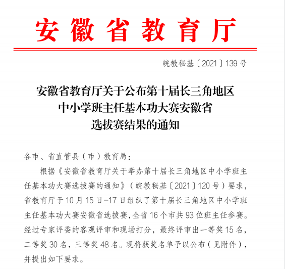 近日,安徽省中小学班主任基本功大赛结果揭晓,我校苏頔老师代表铜陵市参加安徽省选拔赛,从全省16市的93名优秀班主任中脱颖而出,荣获高中组省二等奖。