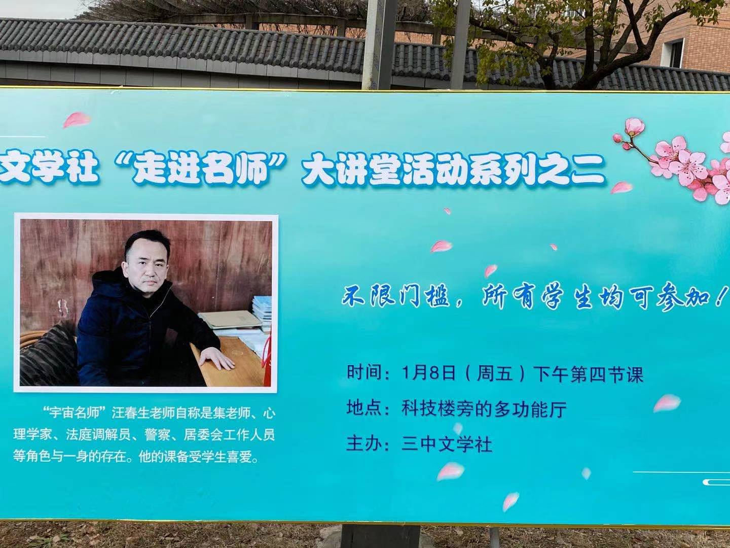 新的一年来临,又是春好处。1月8日下午,满怀着对未来的憧憬,文学社幸运地邀请到“宇宙”名师汪春生老师开展一次全校范围的讲座,会场座无虚席,气氛热烈。